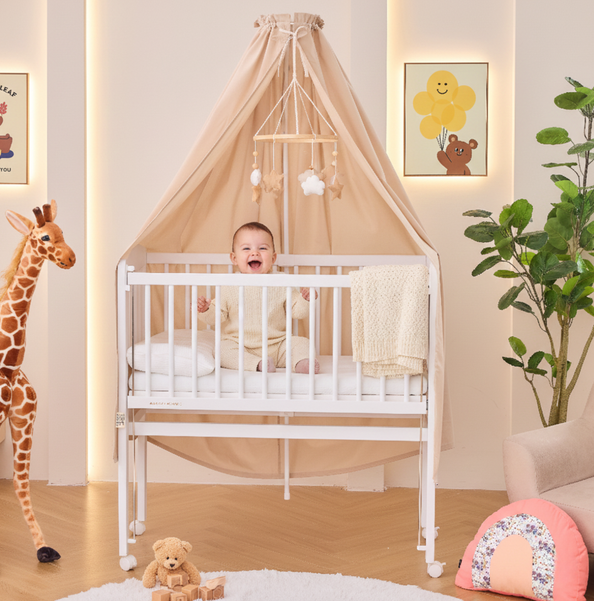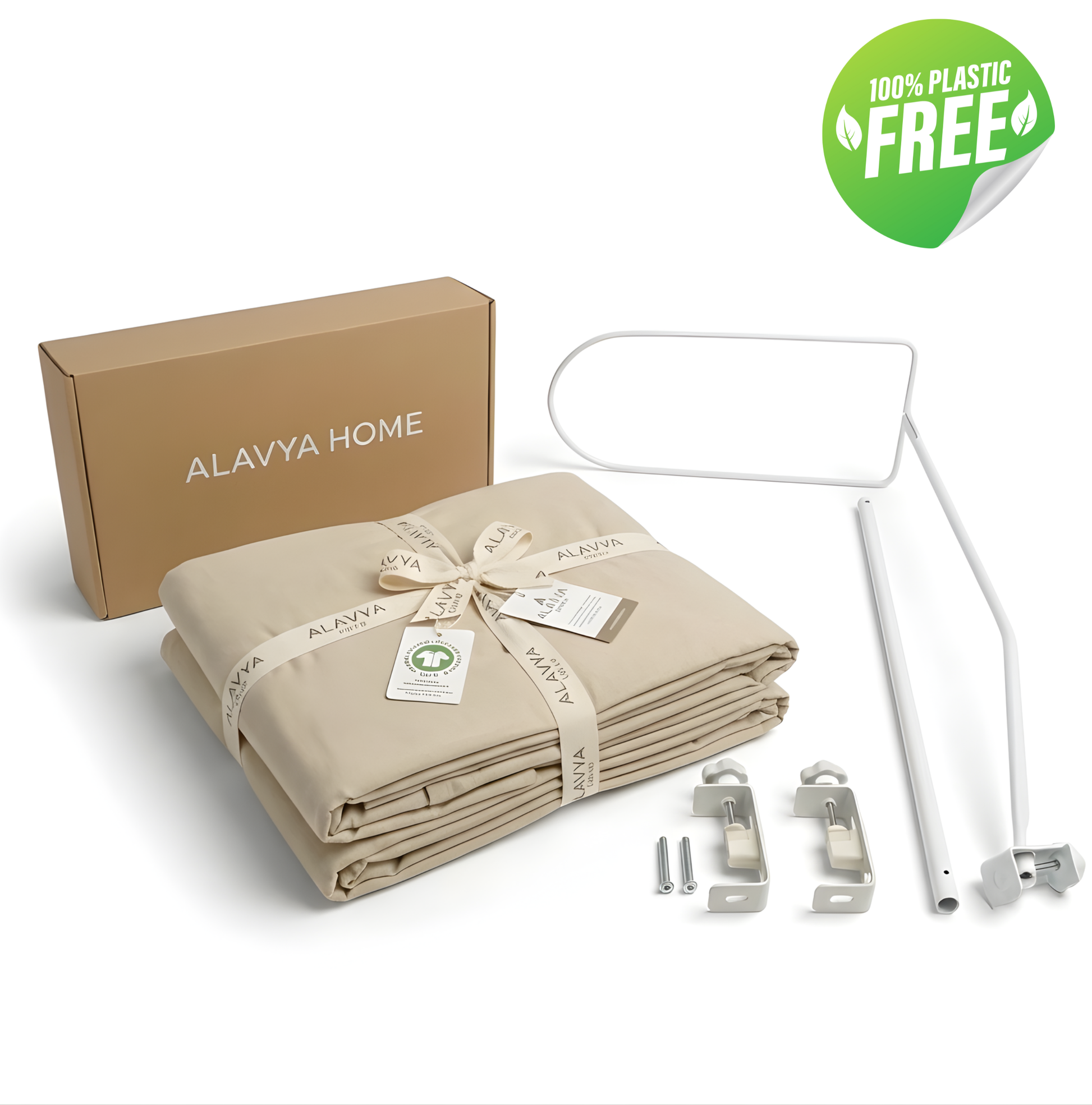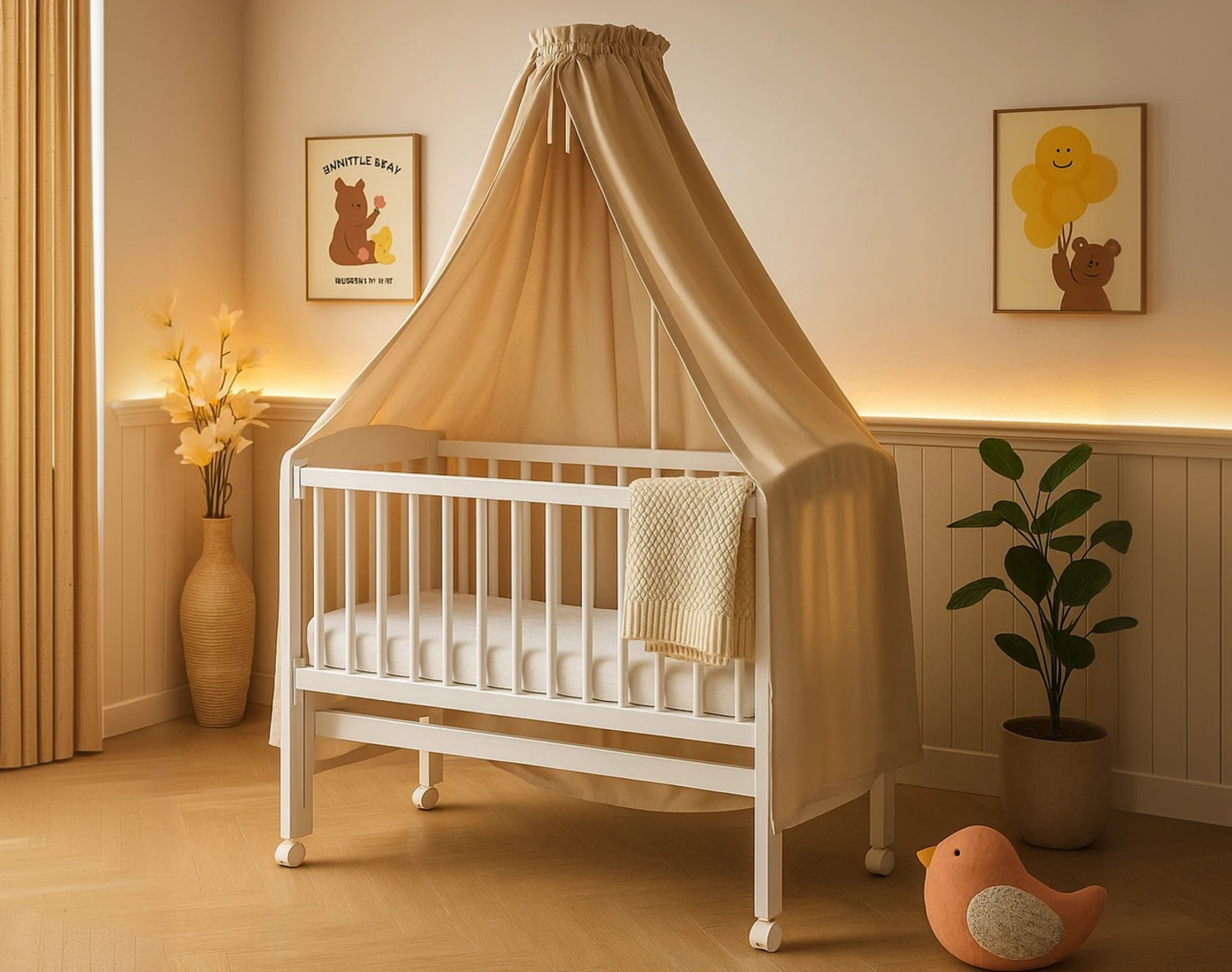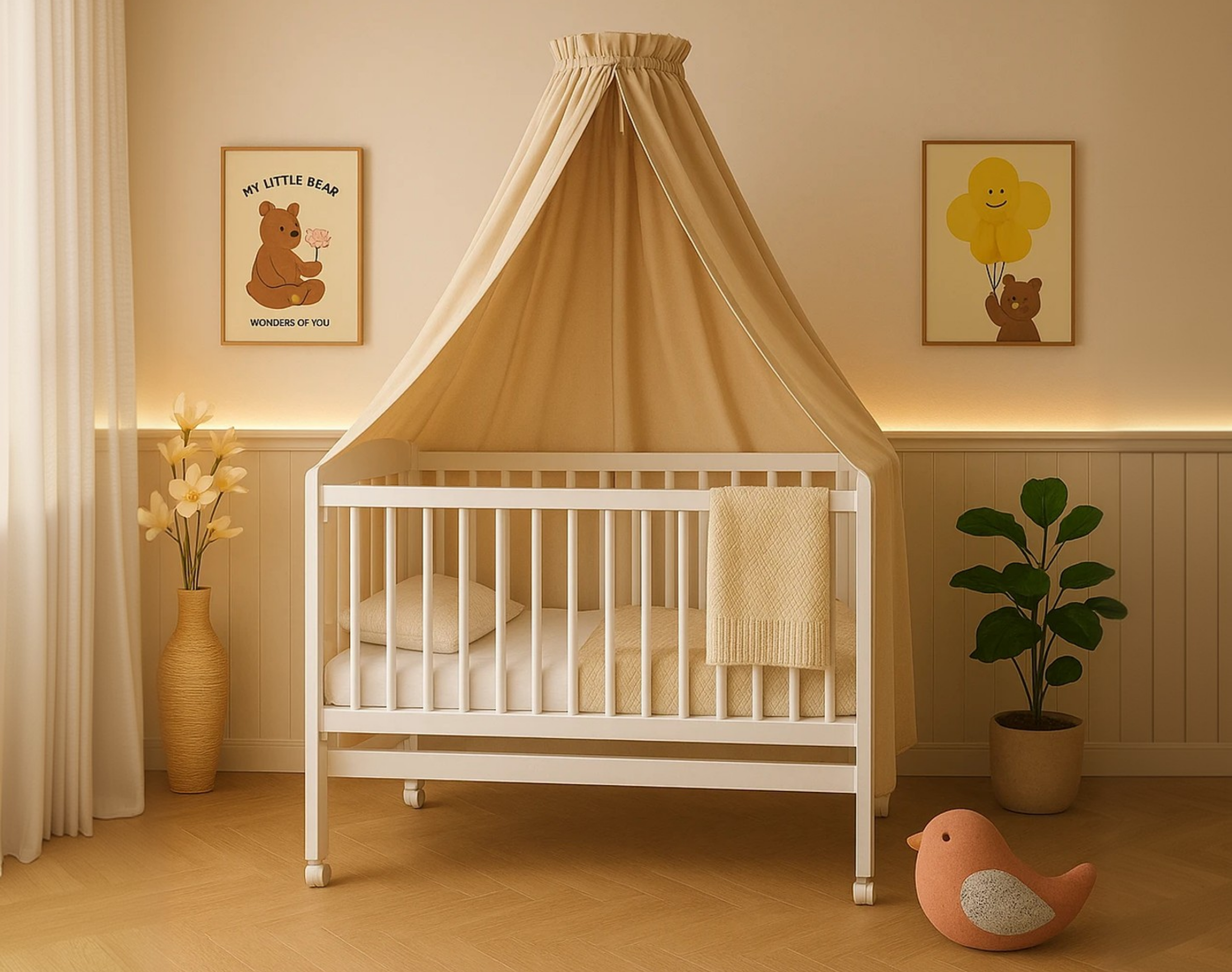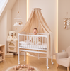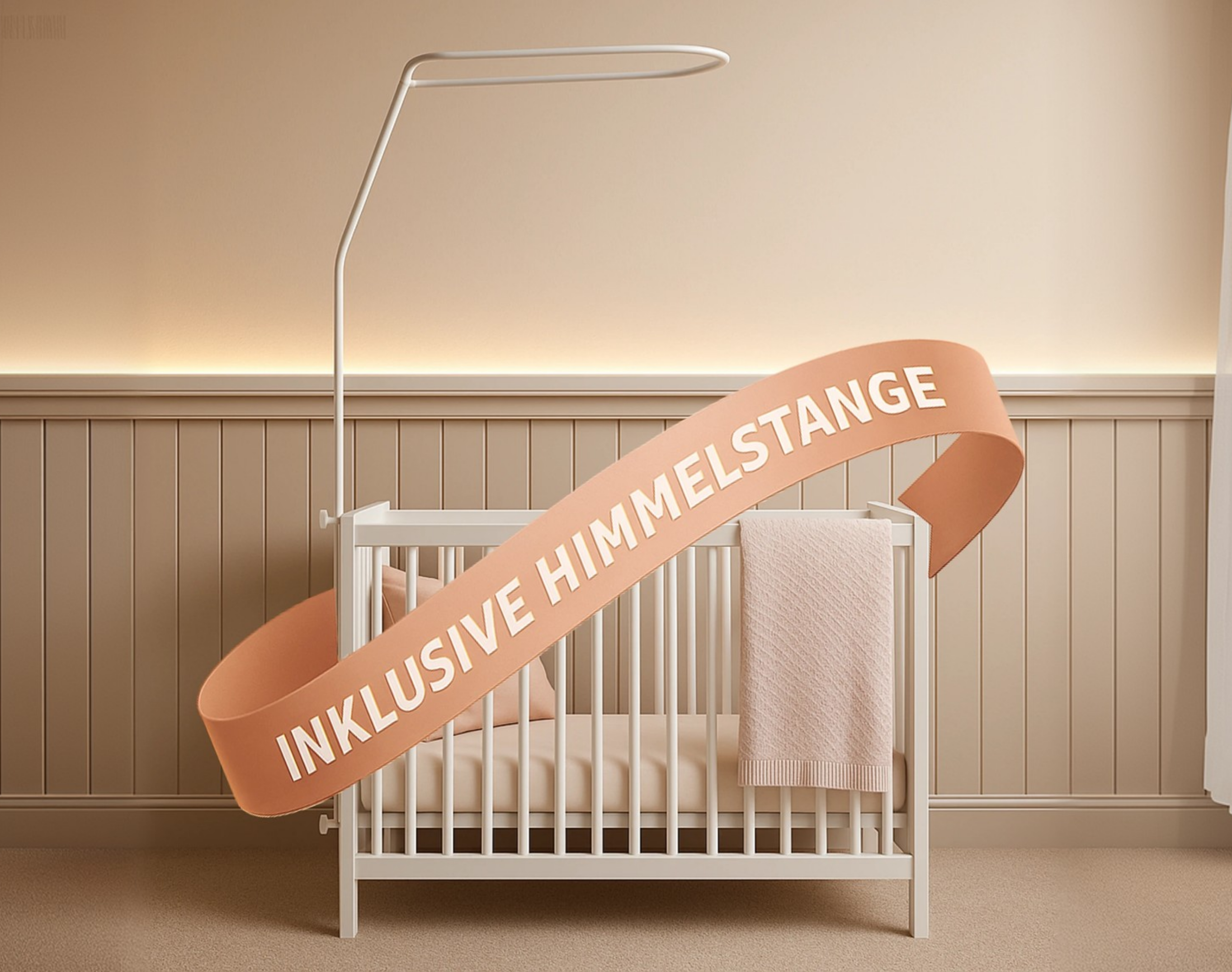 Unser exklusiver Betthimmel ist die ideale Ergänzung für jedes Babybett. Der Betthimmel schafft eine behütete Atmosphäre, um Ihr Baby vor direktem Sonnenlicht und Zugluft zu schützen. Hergestellt aus 100% zertifizierter Bio-Baumwolle bietet unser Betthimmel nicht nur ein weiches und angenehmes Gefühl, sondern setzt auch auf Umweltfreundlichkeit und Nachhaltigkeit. Die Naturverbundenheit wird durch das elegante Design unterstrichen, das eine gemütliche und beruhigende Schlafumgebung schafft. Die mitgelieferte Himmelstange ermöglicht ein müheloses Aufhängen, und der durchlaufende Tunnel am Kopfteil sorgt für eine einfache und sichere Montage. Mit höchstem Anspruch an Qualität und Nachhaltigkeit erfüllt unser Betthimmel alle geltenden Sicherheitsnormen und ist stolz GOTS und OEKO TEX 100 zertifiziert. Tauchen Sie ein in eine Welt voller Geborgenheit und stilvoller Natürlichkeit.