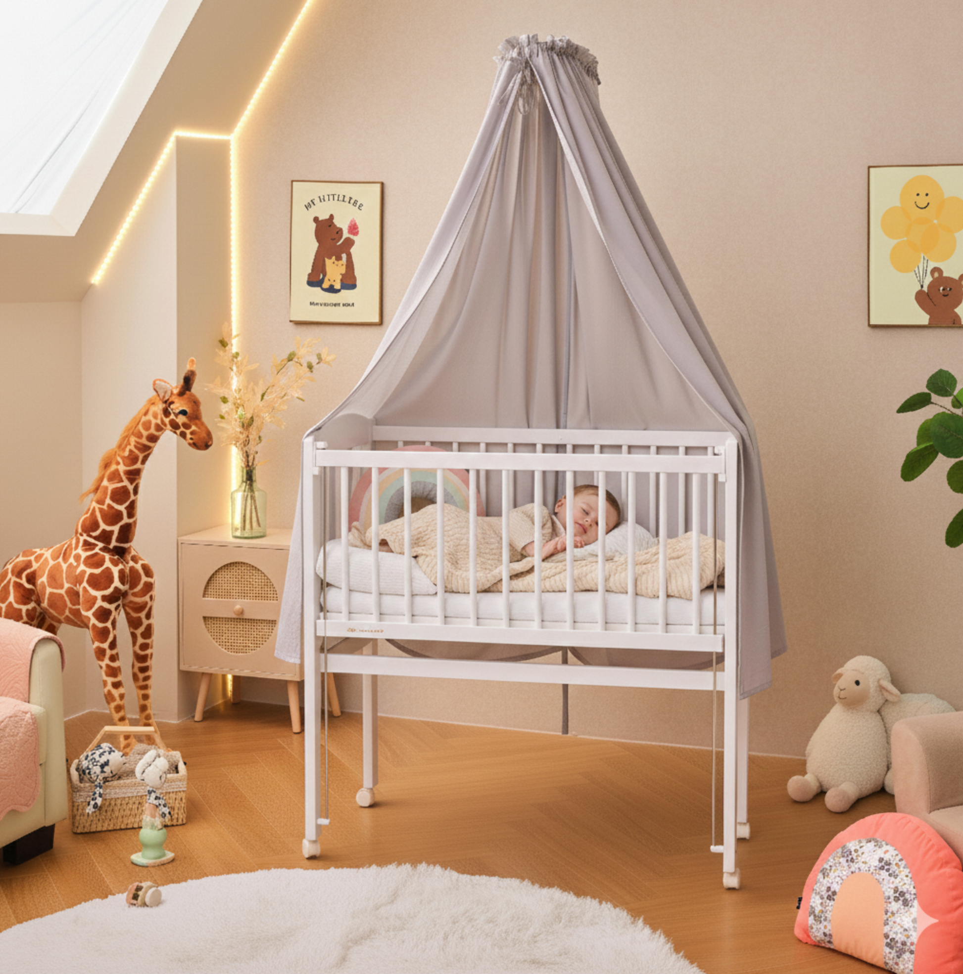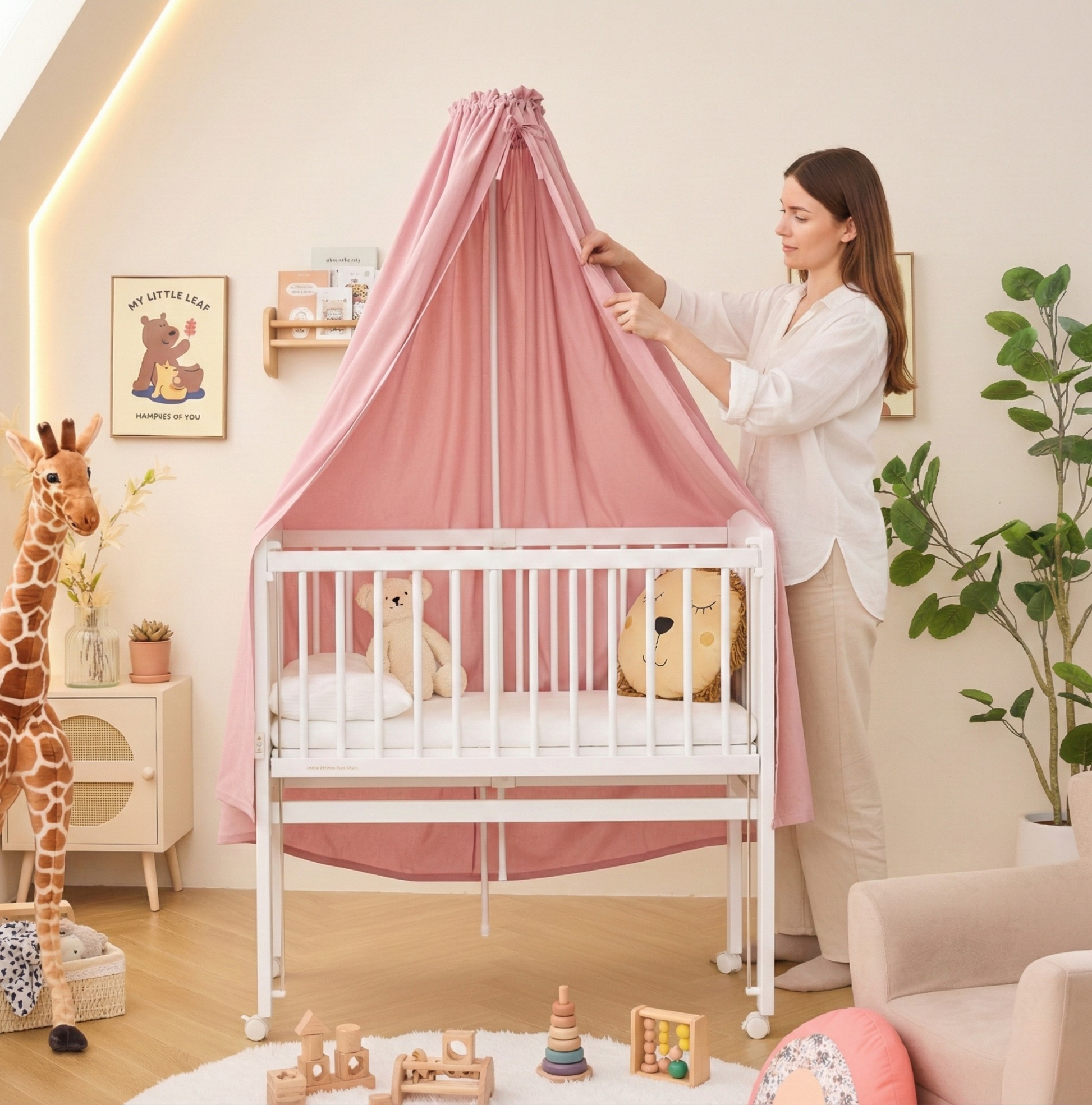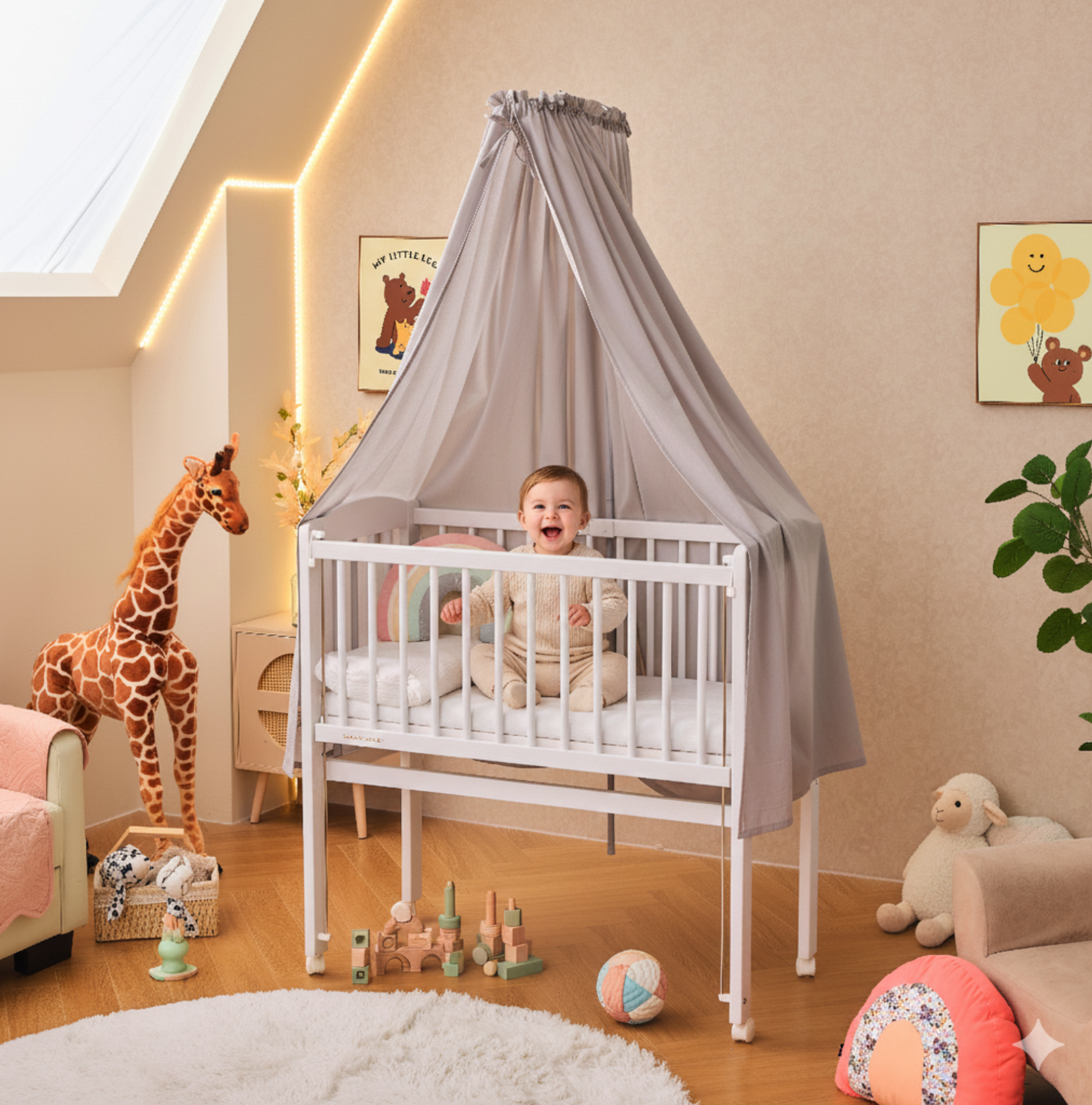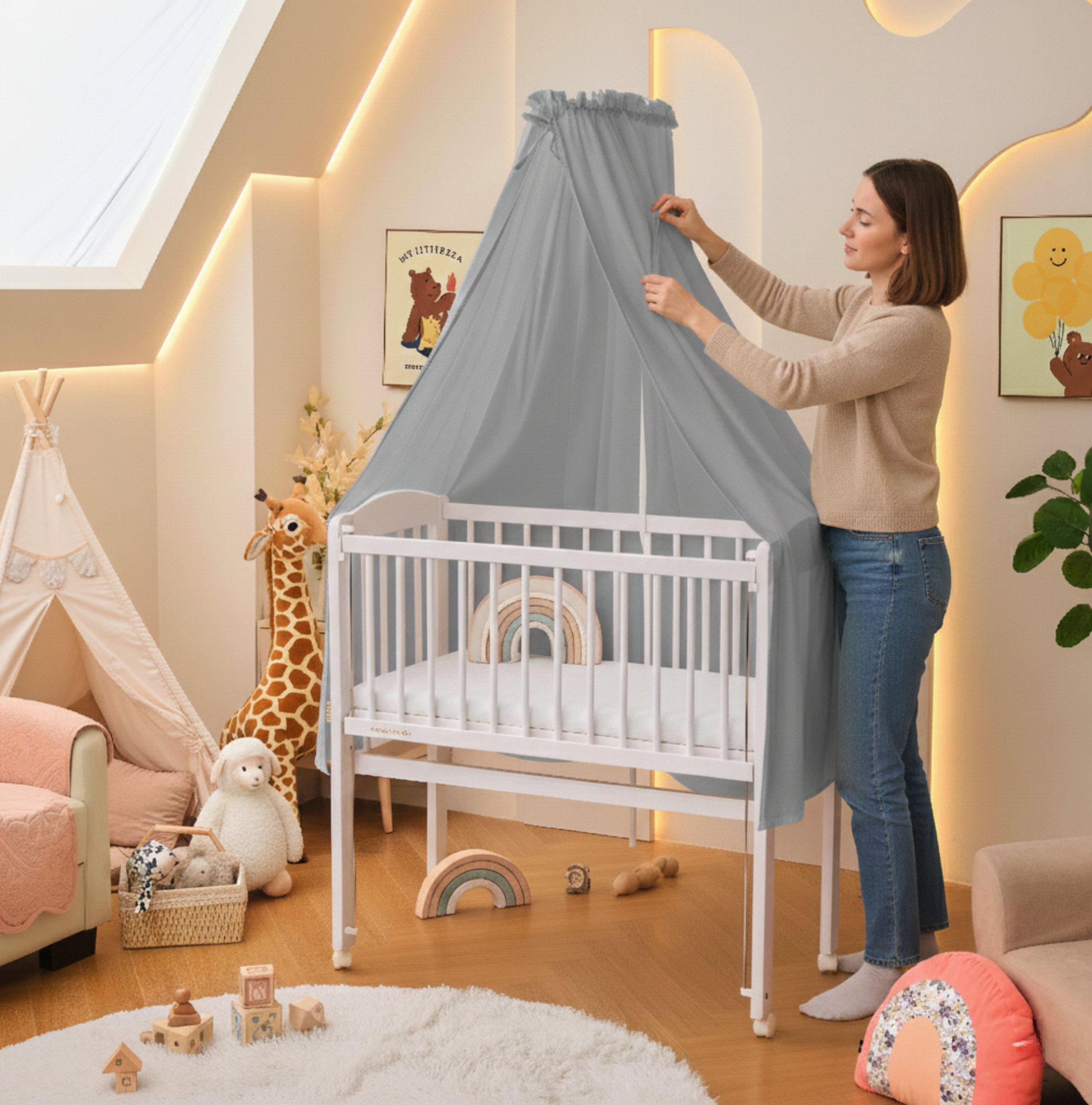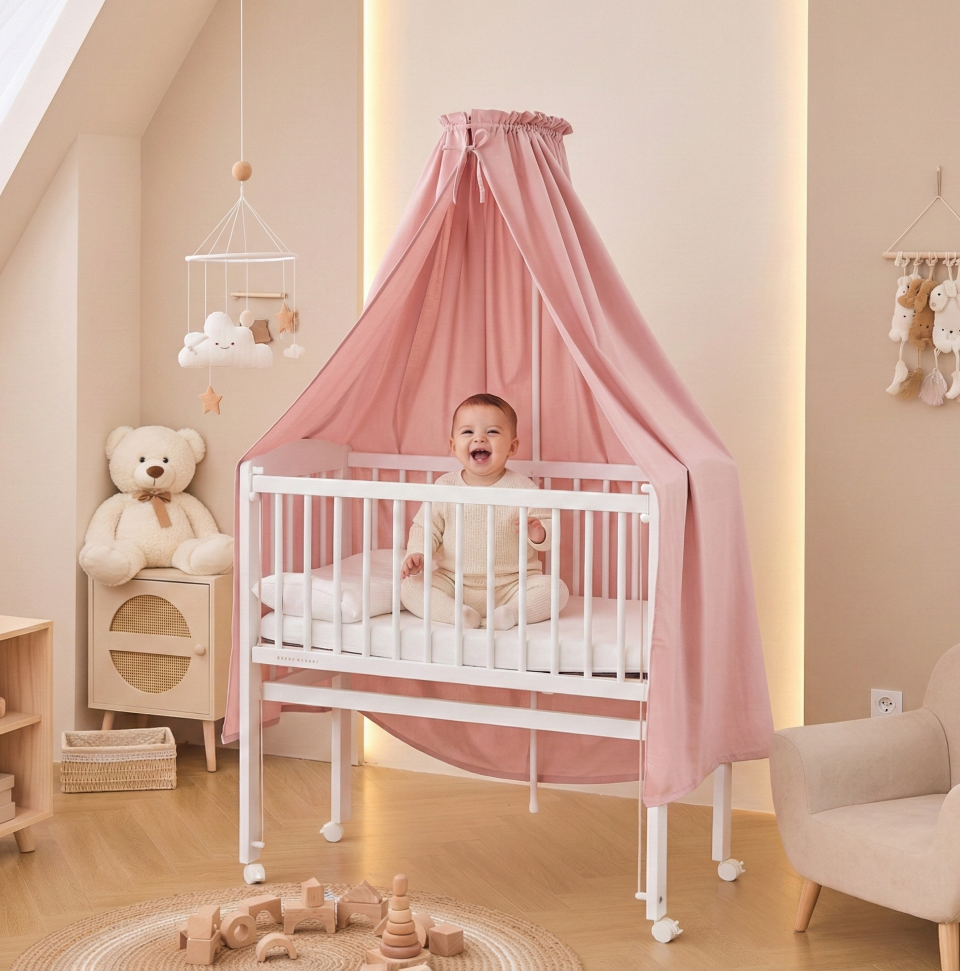 Der Betthimmel ist zweigeteilt und kann sowohl für die Quer- als auch die Längsseite des Bettes verwendet werden. Der Stoff lässt sich zusammenbinden, um verschiedene Stimmungen zu erzeugen, und schützt teilweise vor Mücken und anderen Insekten. Unser Betthimmel-Set passt universell auf alle Babybetten mit den Standardmatratzengrößen 60 x 120 cm und 70 x 140 cm.