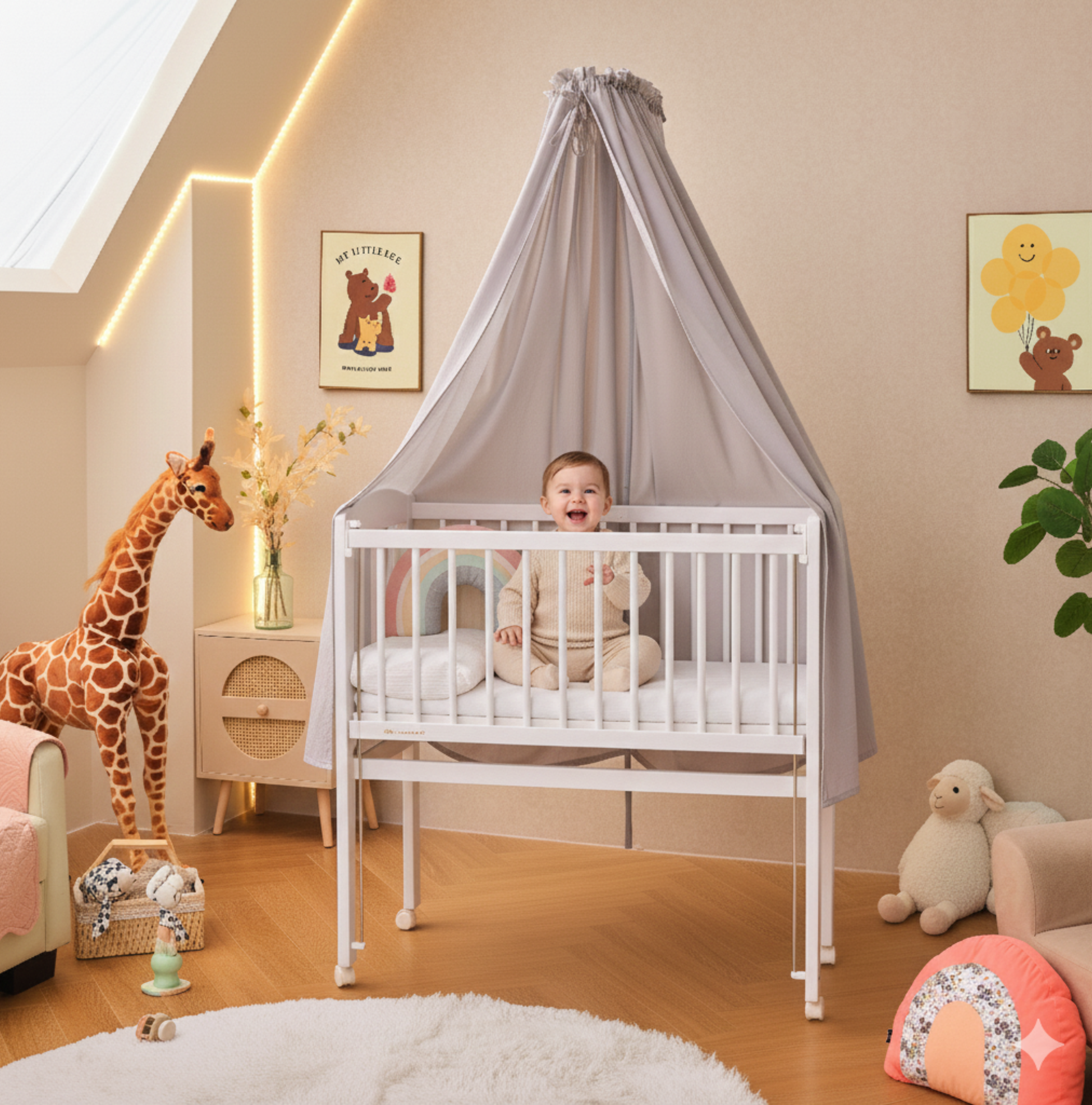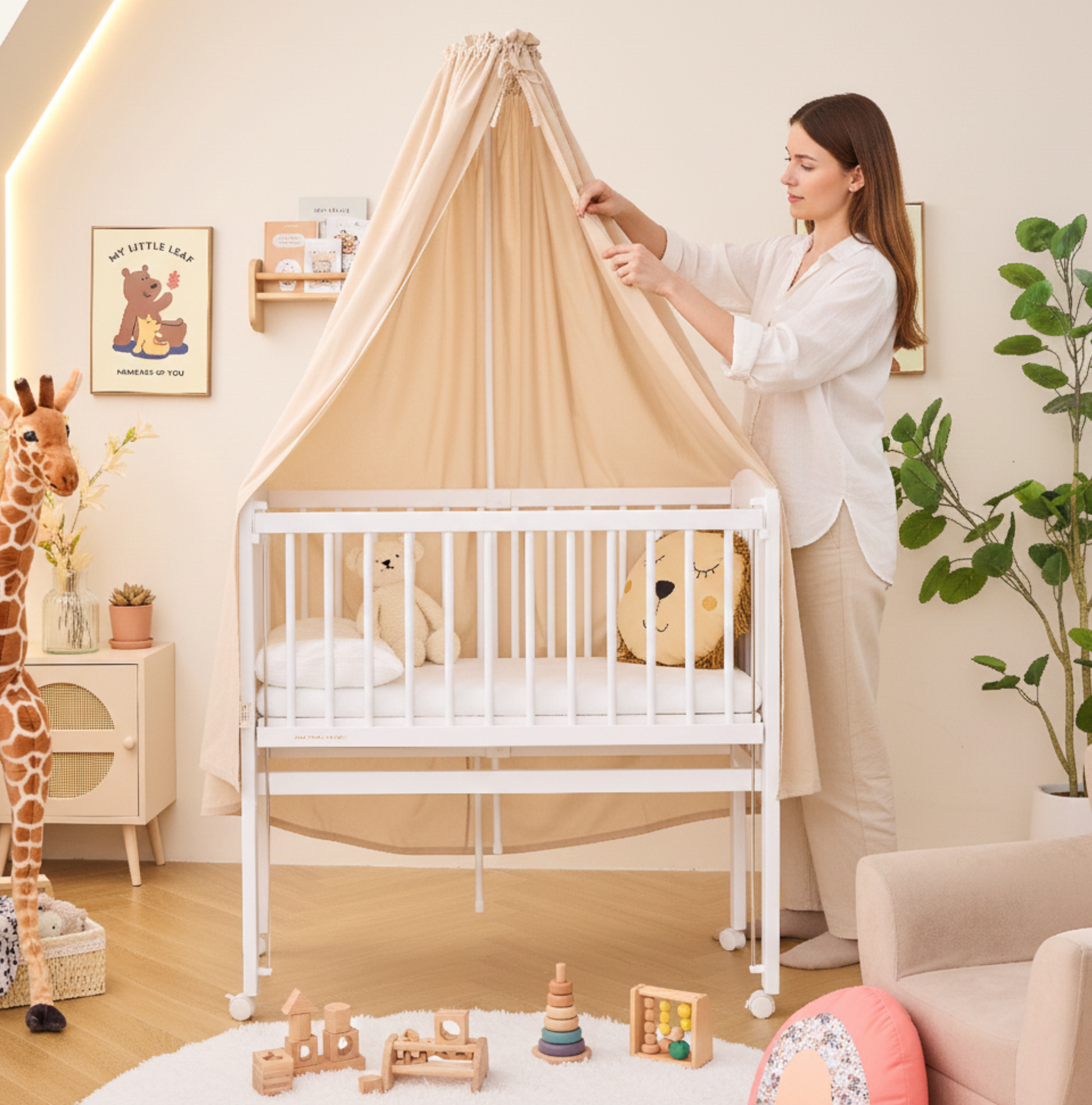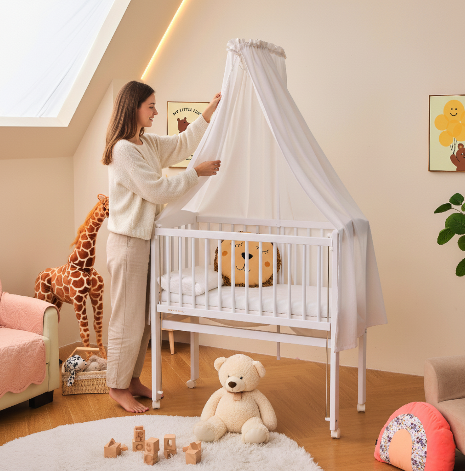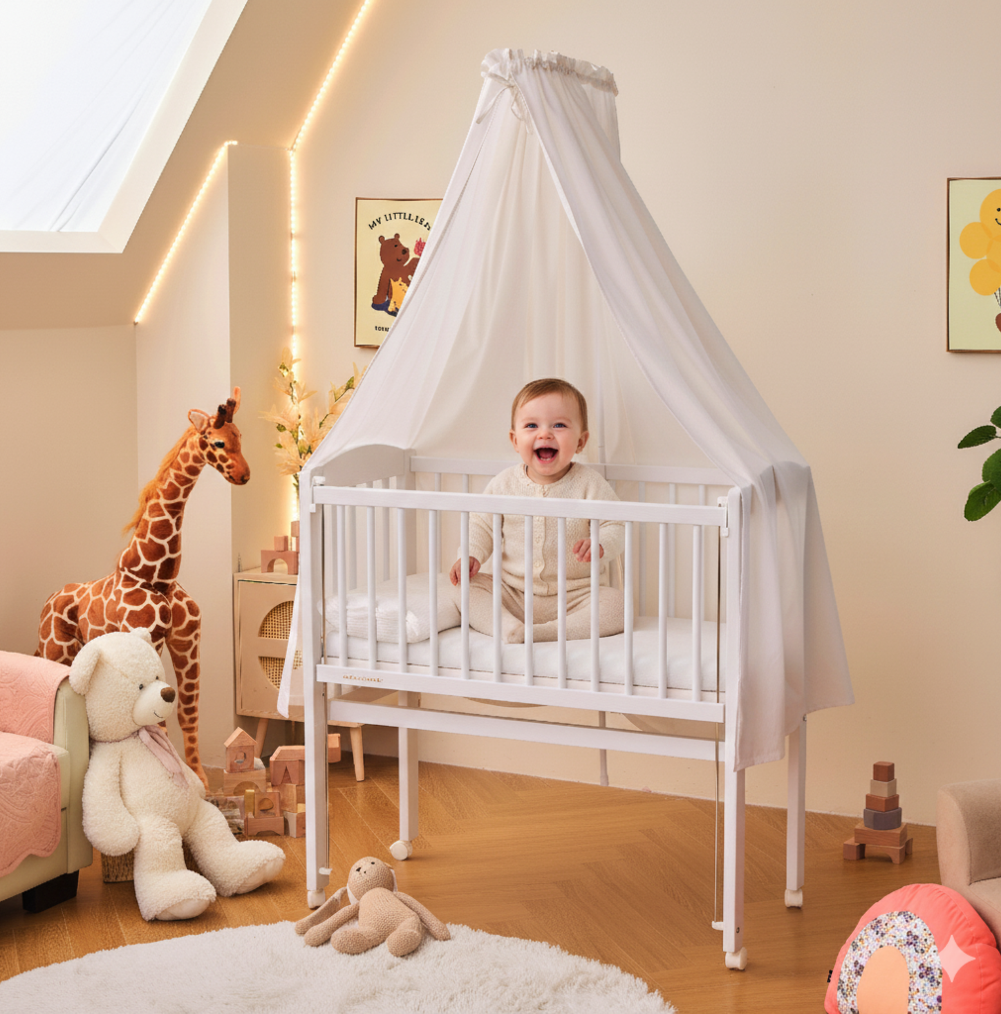 Der Betthimmel ist zweigeteilt und kann sowohl für die Quer- als auch die Längsseite des Bettes verwendet werden. Der Stoff lässt sich zusammenbinden, um verschiedene Stimmungen zu erzeugen, und schützt teilweise vor Mücken und anderen Insekten. Unser Betthimmel-Set passt universell auf alle Babybetten mit den Standardmatratzengrößen 60 x 120 cm und 70 x 140 cm.