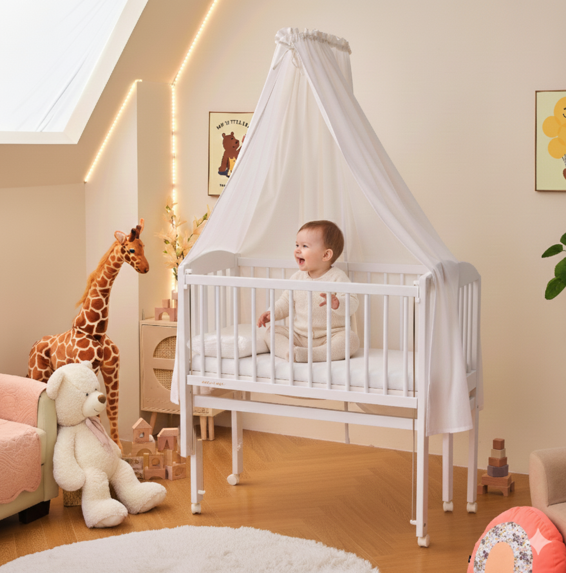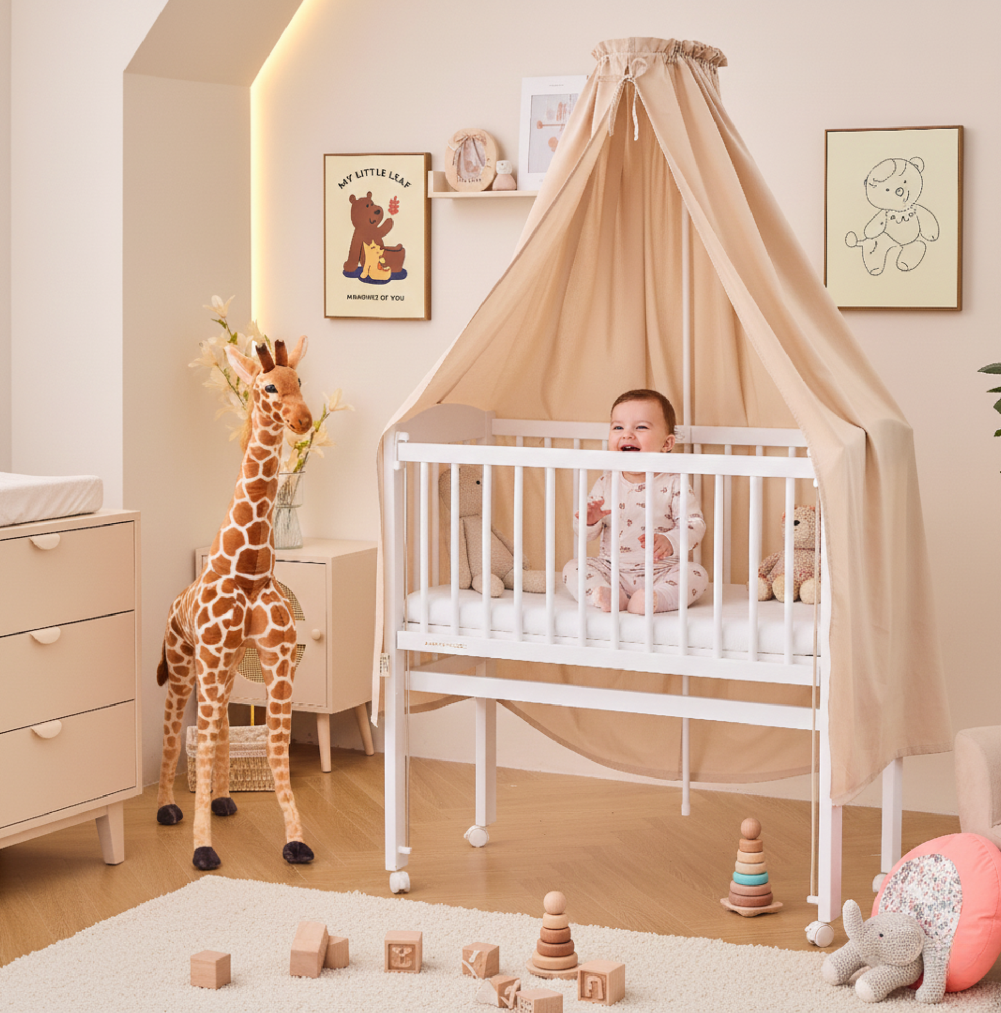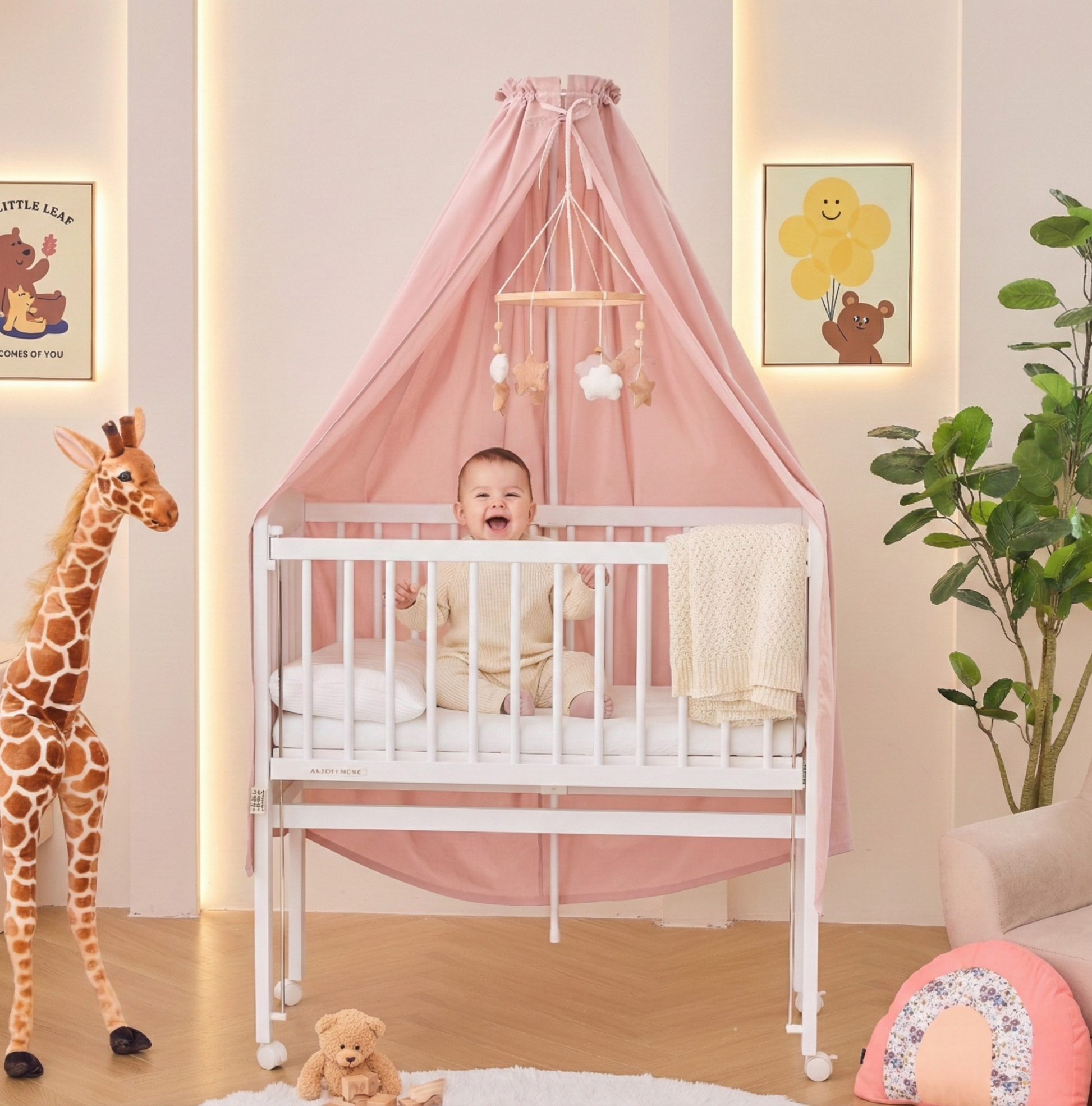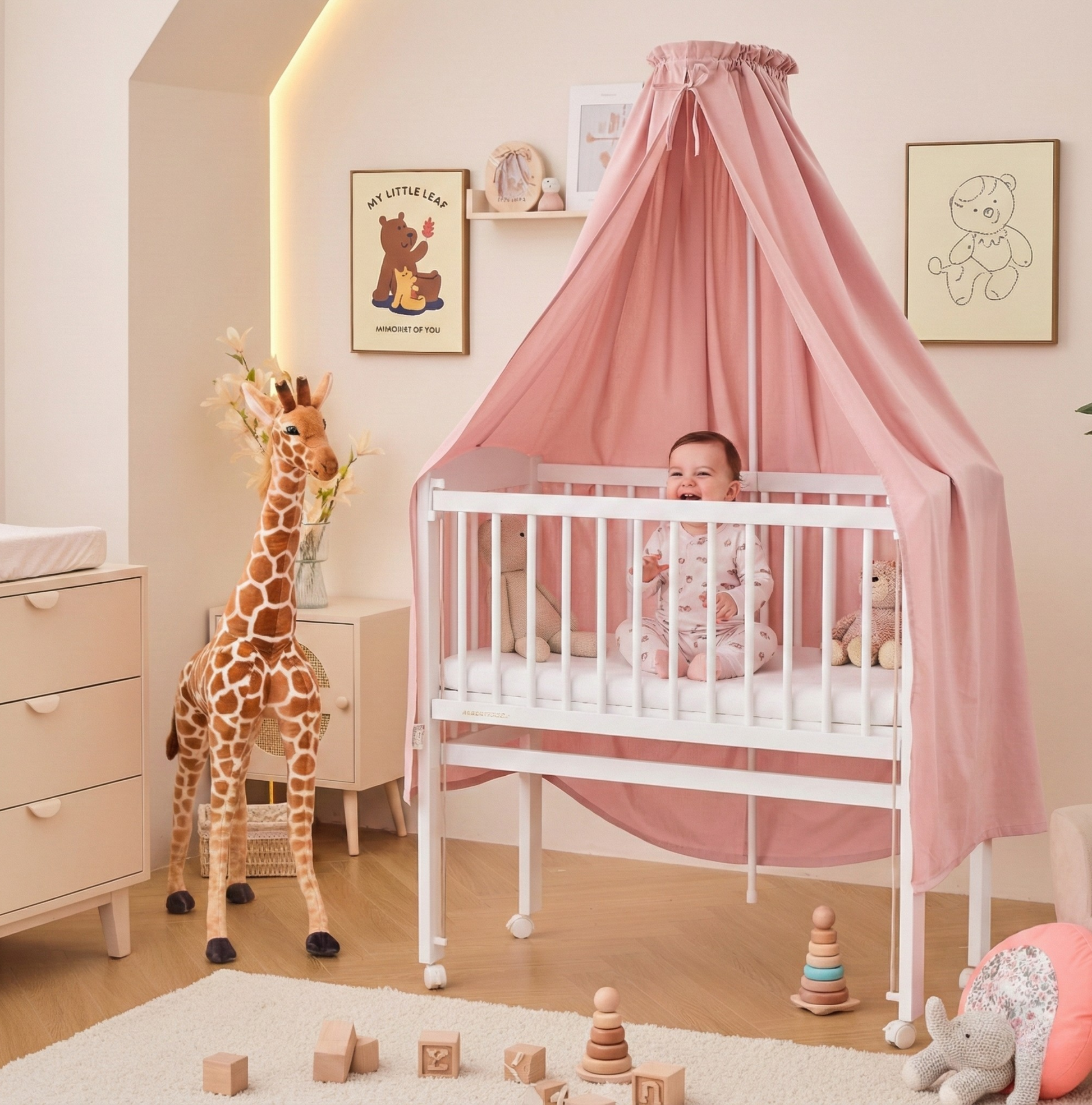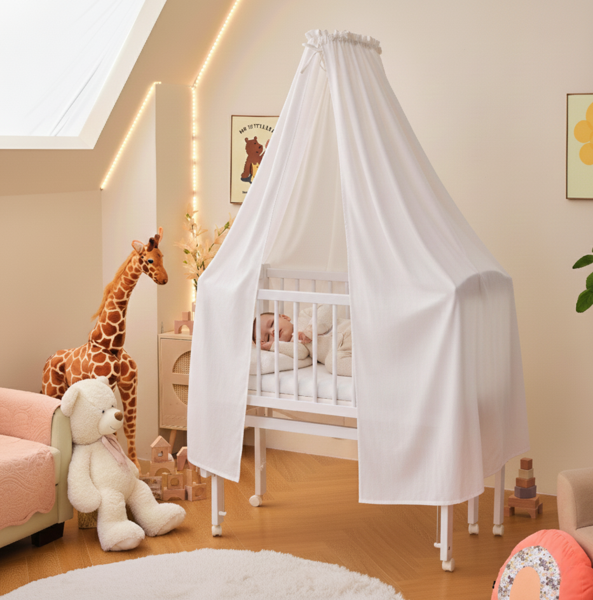 Der Betthimmel ist zweigeteilt und kann sowohl für die Quer- als auch die Längsseite des Bettes verwendet werden. Der Stoff lässt sich zusammenbinden, um verschiedene Stimmungen zu erzeugen, und schützt teilweise vor Mücken und anderen Insekten. Unser Betthimmel-Set passt universell auf alle Babybetten mit den Standardmatratzengrößen 60 x 120 cm und 70 x 140 cm.