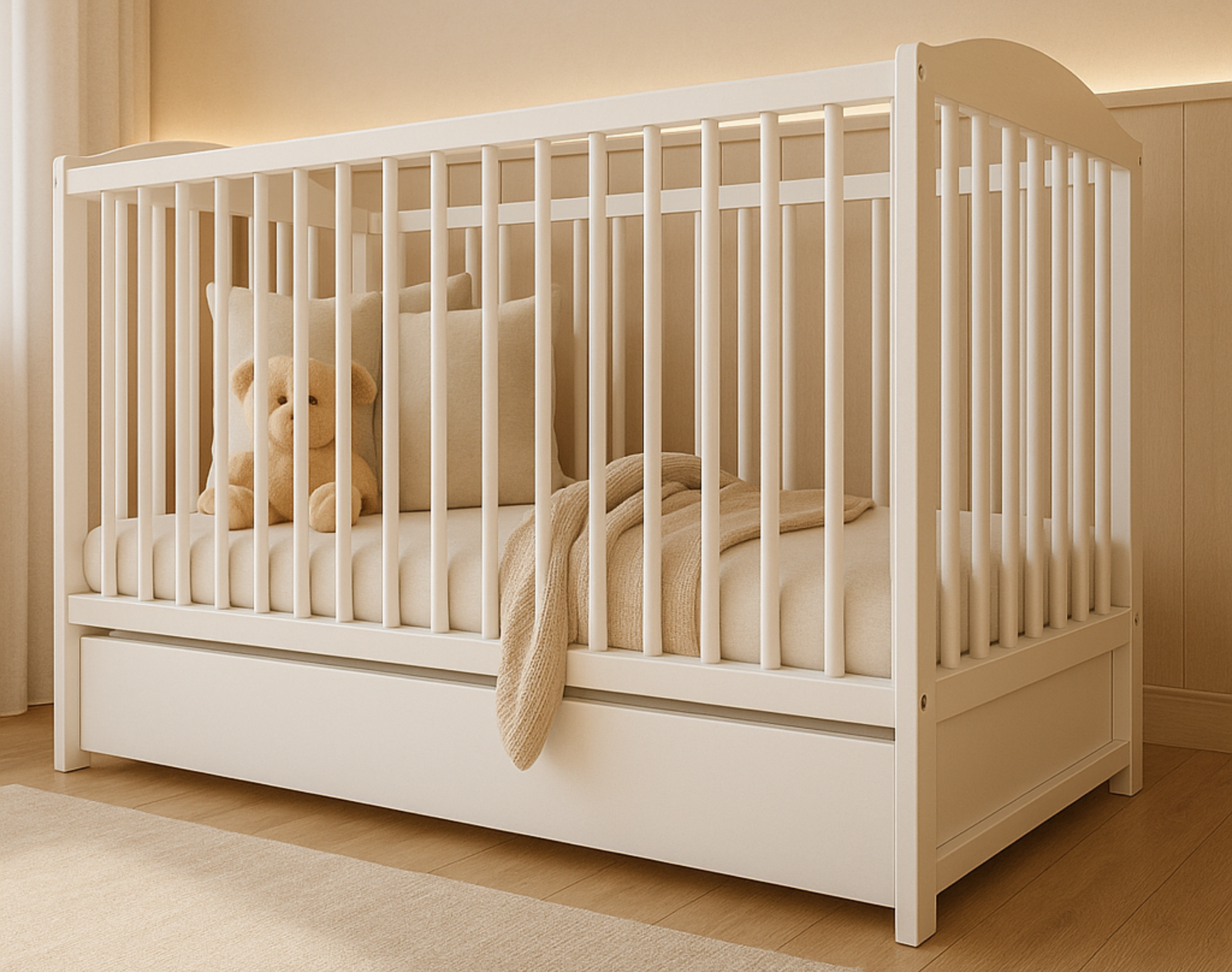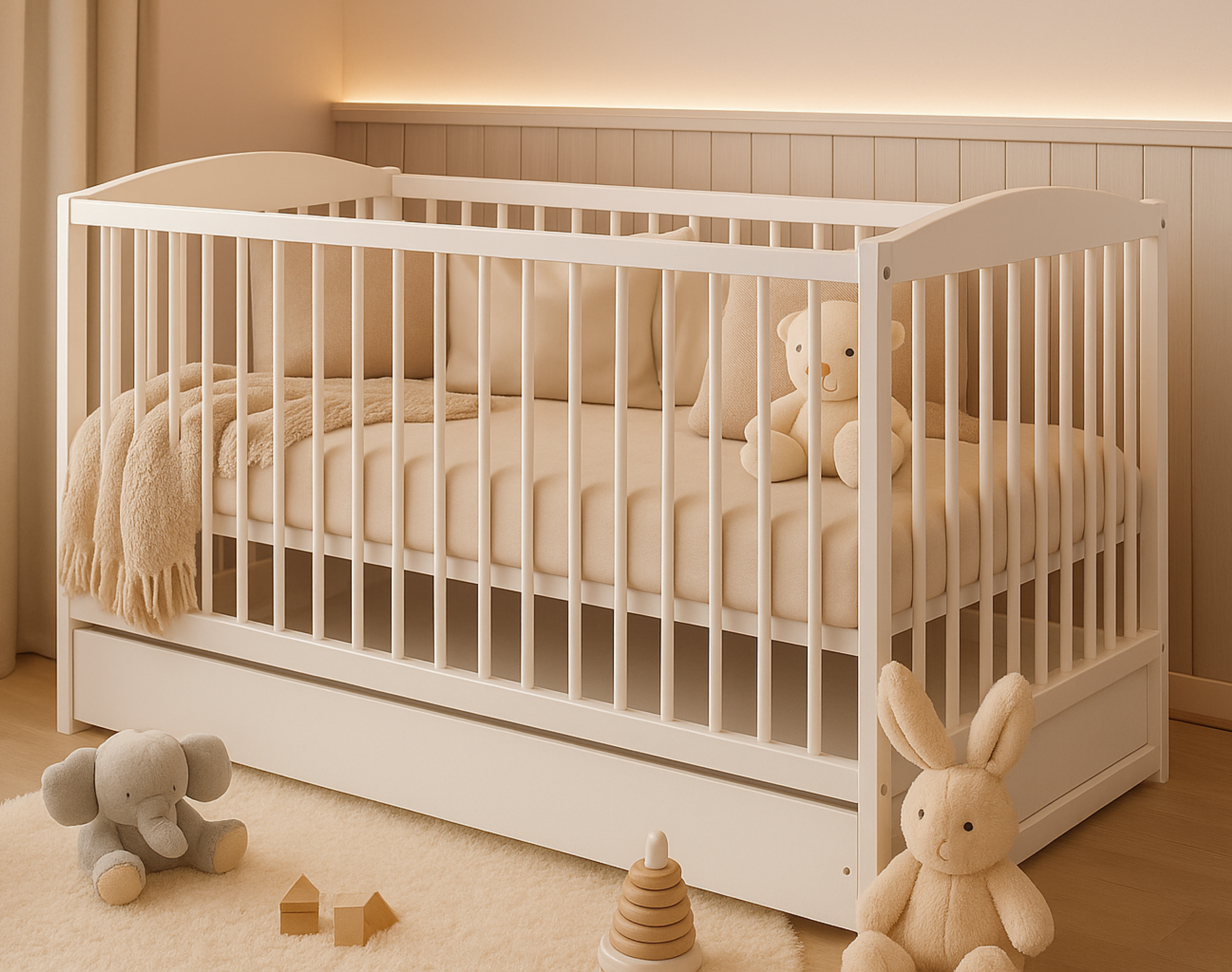 Das Babybett NALA bietet mit einer Liegefläche von 60x120 cm viel Platz zum Schlafen und Wachsen. Es ist aus hochwertigen Materialien gefertigt und trägt bis zu 80 kg – ideal für sicheren Schlaf und gemeinsame Kuschelstunden. Der inklusive Lattenrost sorgt für Stabilität und Belüftung. Dank des mitgelieferten Montagematerials ist der Aufbau schnell und unkompliziert erledigt.