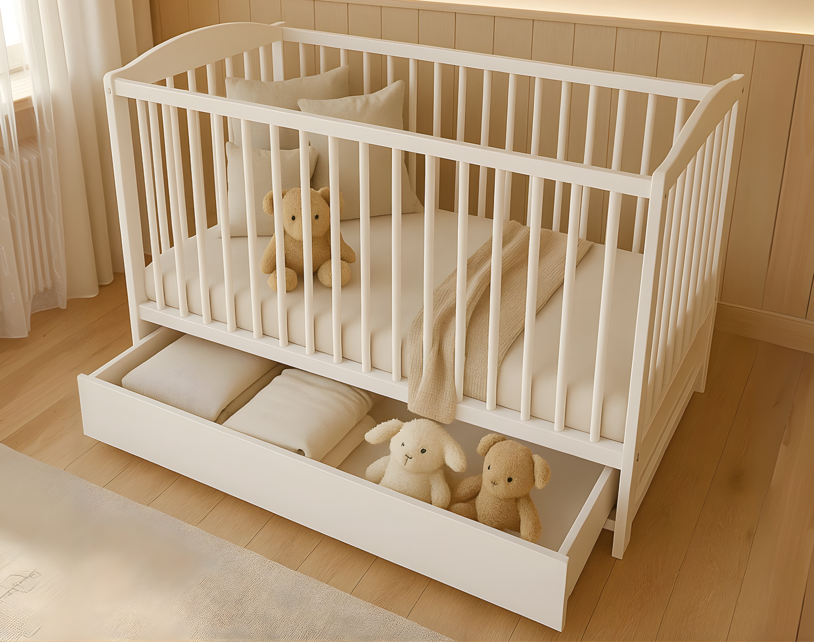 NALA kann mit einer großen, vollintegrierten Schublade mitbestellt werden – ideal zur Aufbewahrung von Bettwäsche, Kleidung oder Wickelzubehör. Die optional erhältliche Schublade ist mit leichtgängigen Rollen ausgestattet, praktisch, platzsparend und funktional – für ein aufgeräumtes und gut organisiertes Kinderzimmer. Bestellen Sie diese praktische Aufbewahrungslösung einfach direkt mit.