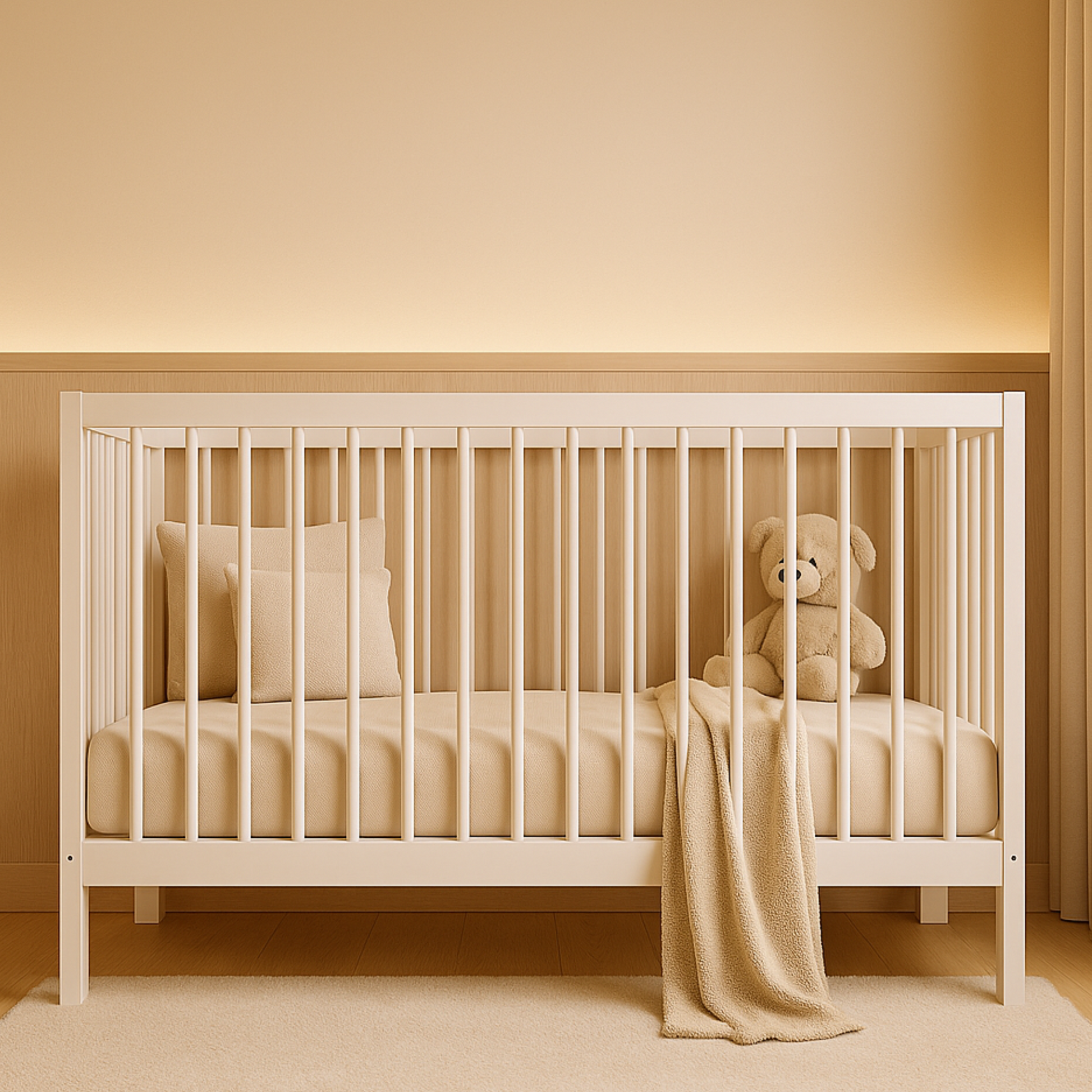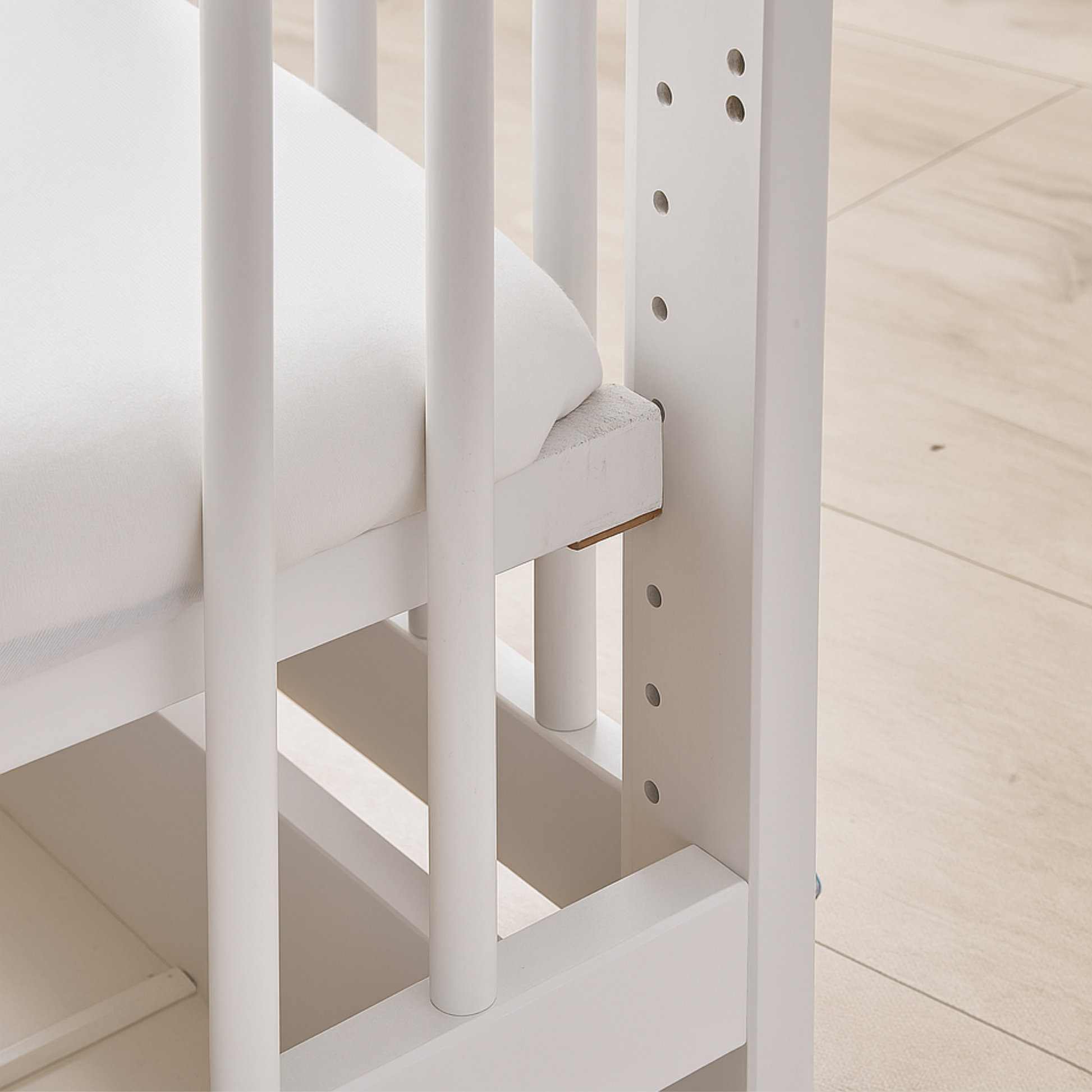 Unser Babybett aus edlem Massivholz der Buche vereint höchste Handwerkskunst mit stilvollem Design. Erhältlich in der Größe 60x120 cm und 70x140cm, passt es perfekt in jedes Babyzimmer. Hergestellt in Europa, bietet es nicht nur eine ästhetische Bereicherung, sondern auch höchste Qualität und Sicherheit für Ihr Kind. Dieses vielseitige Gitterbett ist 9-fach höhenverstellbar, sodass Sie die Liegefläche perfekt an die Bedürfnisse Ihres Kindes und die Höhe Ihres Elternbettes anpassen können. Dank der einfachen Anpassung in ca. 3-cm-Schritten zwischen 19 und 45 cm ist das Bett vielseitig einsetzbar und wächst mit Ihrem Kind mit. Optional ist das Babybett mit einer praktischen Schublade erhältlich, die zusätzlichen Stauraum für Windeln, Decken und andere Babyutensilien bietet. Drei herausnehmbare Schlupfsprossen ermöglichen es Ihrem Kind, selbstständig ein- und auszusteigen, sobald es größer ist. Der hochwertige Lattenrost aus Buchenholz sorgt für Stabilität und Langlebigkeit. Wir verwenden ausschließlich Rohstoffe von höchster Qualität. Der Rahmen und die Stäbe sind aus massivem Buchenholz gefertigt und mit kinderfreundlichem, wasserbasiertem Lack behandelt. Dieser und speichelfeste Lack schützt das Holz und sorgt für eine natürliche, angenehme Duftnote, anstatt unangenehmer Lackgerüche. Buchenholz ist bekannt für seine Robustheit und Langlebigkeit, was dieses Bett zu einer nachhaltigen Investition macht. Das Bett erfüllt alle geltenden europäischen Sicherheitsnormen, darunter DIN EN 716-1 und EN 716-2. Die abgerundeten Kanten minimieren das Verletzungsrisiko, und die robuste Konstruktion hält Belastungen bis zu 60 Kilogramm stand. So können Sie sicher sein, dass Ihr Kind in einer sicheren und geschützten Umgebung schläft.