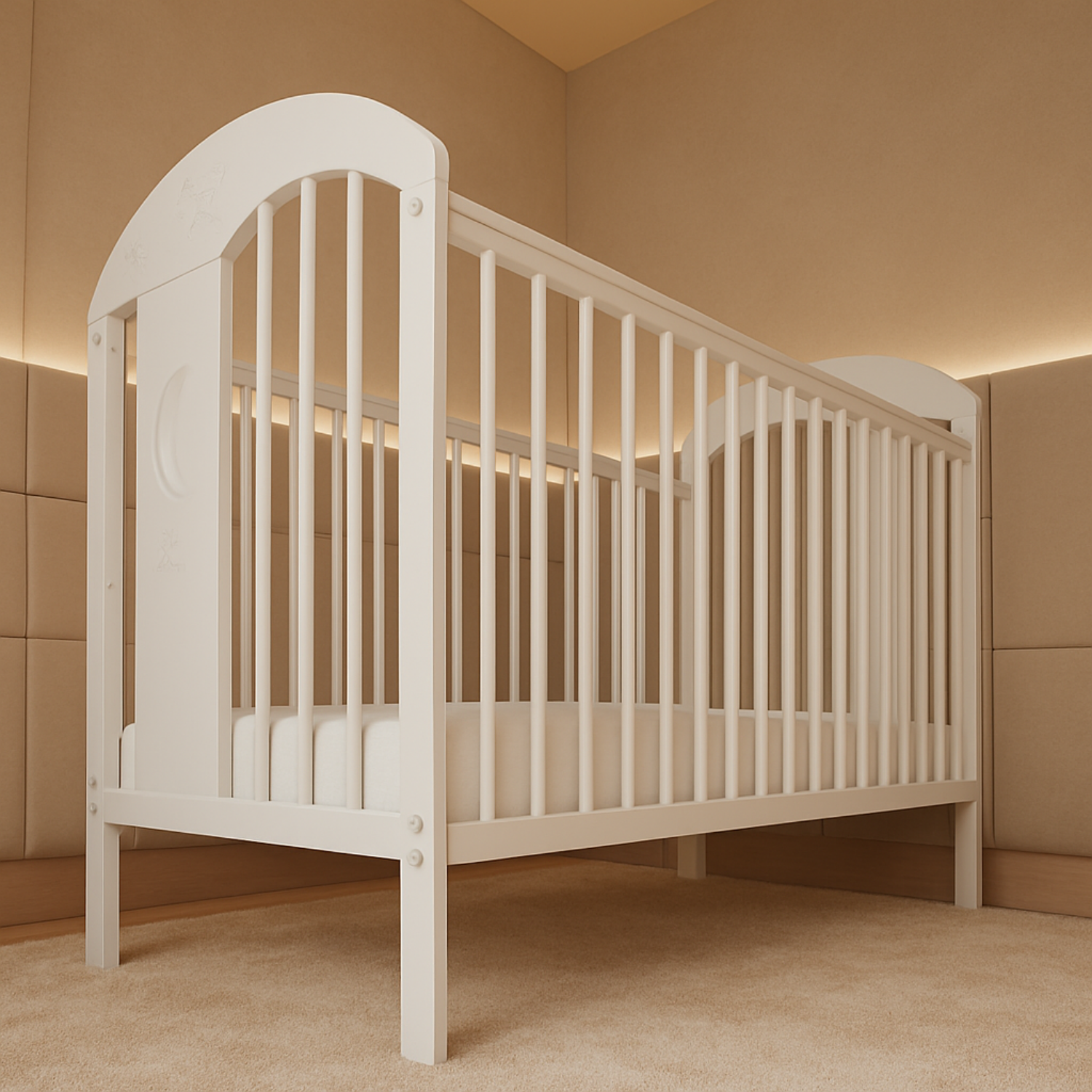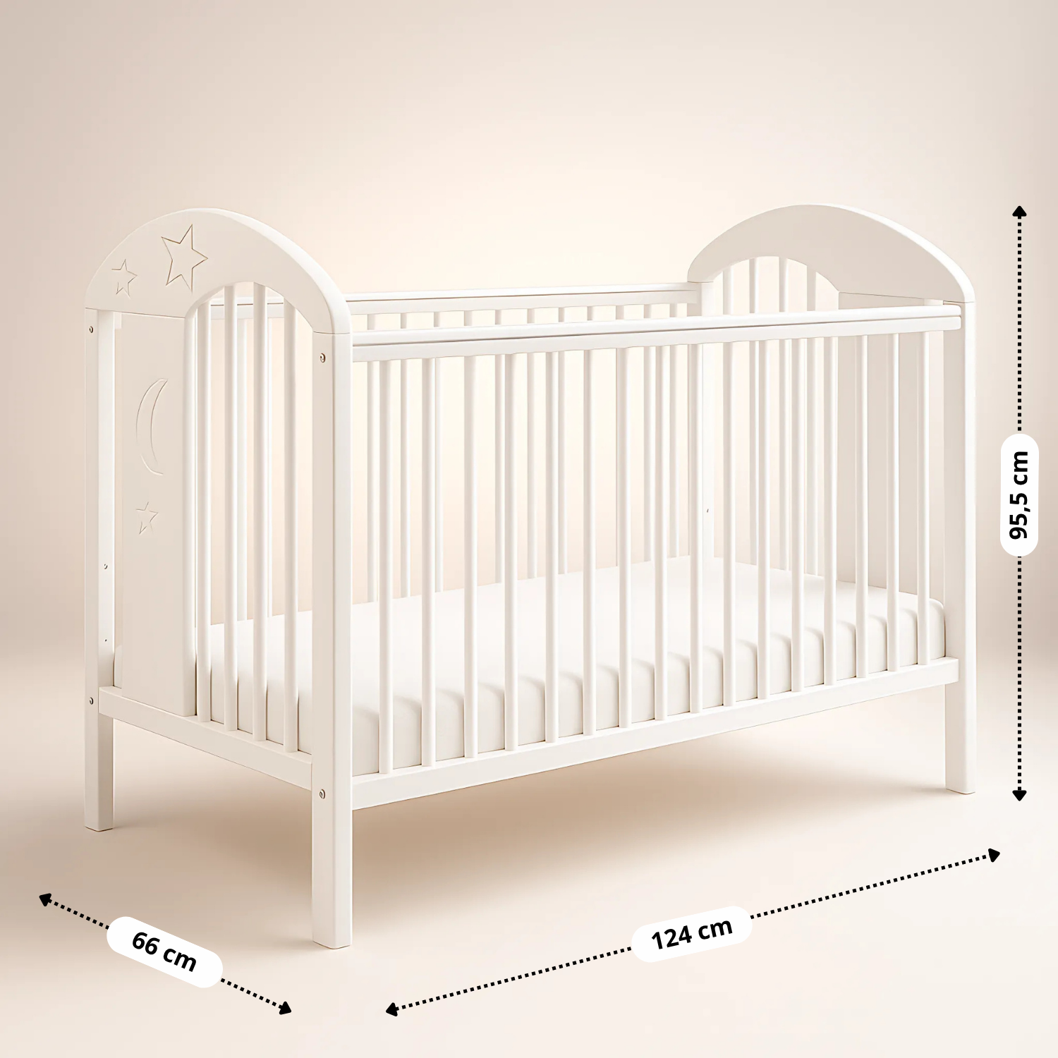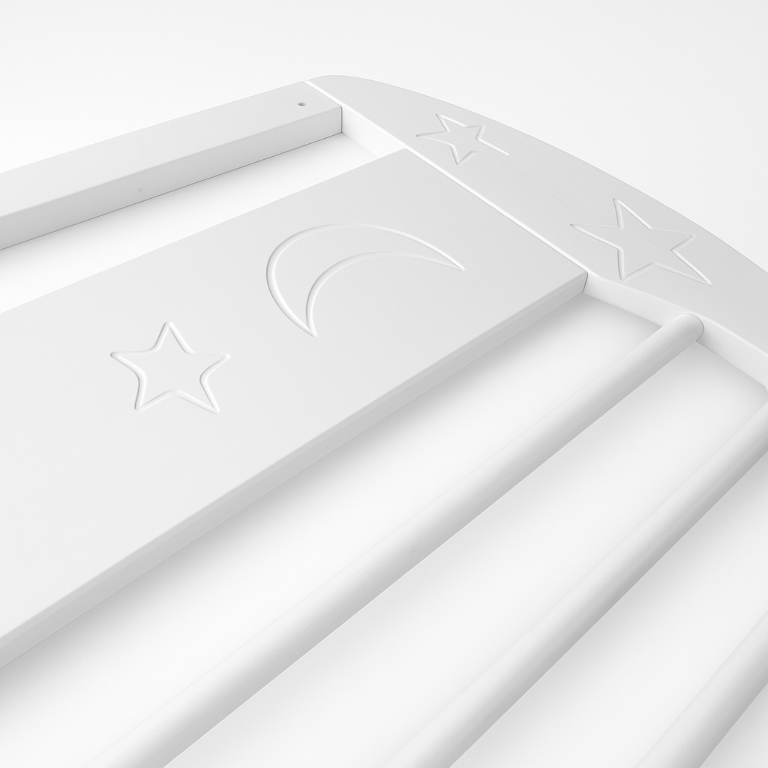 Das Babybett Tonia von Alavya Home steht für kompromisslose Qualität und zeitloses Design. Gefertigt aus hochwertigem, massivem Kiefernholz aus nachhaltiger Forstwirtschaft, vereint es die Schönheit der Natur mit skandinavischer Schlichtheit. Die wasserbasierte Lackierung ist speichelfest und hebt die natürliche Holzstruktur stilvoll hervor – für eine gesunde und sichere Schlafumgebung. Ob Neugeborenes oder Kleinkind – das Tonia Babybett wächst mit. Der Lattenrost ist in drei Höhen verstellbar (18,5, 33 und 48 cm), sodass sich das Bett optimal an die Entwicklungsstufe Ihres Kindes anpassen lässt. Herausnehmbare Schlupfsprossen ermöglichen älteren Babys ein sicheres Ein- und Aussteigen – ganz ohne elterliche Hilfe. Gefertigt in einer renommierten EU-Möbelmanufaktur erfüllt das Tonia Bett sämtliche Anforderungen der Norm DIN EN 716-1. Abgerundete Kanten, stabile Rundstäbe (Ø 16 mm) und ein verstärkter Bettrahmen sorgen für maximale Stabilität und Schutz. Alle eingesetzten Farben und Lacke sind streng geprüft, zertifiziert und 100 % unbedenklich für Kinder. Ein kleines Detail mit großer Wirkung: Die liebevoll eingravierten Stern- und Mondformen auf der Frontseite machen das Babybett Tonia zu einem besonderen Blickfang im Kinderzimmer. Sie schaffen eine warme, einladende Atmosphäre, in der sich Ihr Kind sicher und geborgen fühlt – Tag und Nacht.