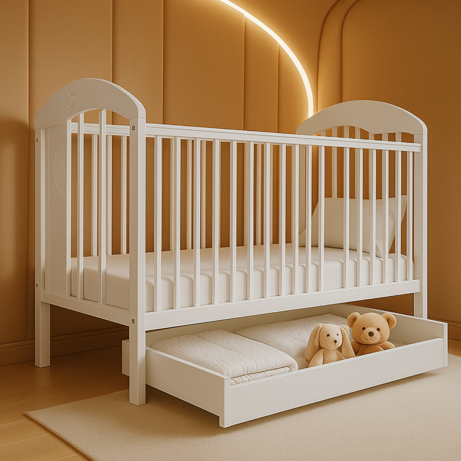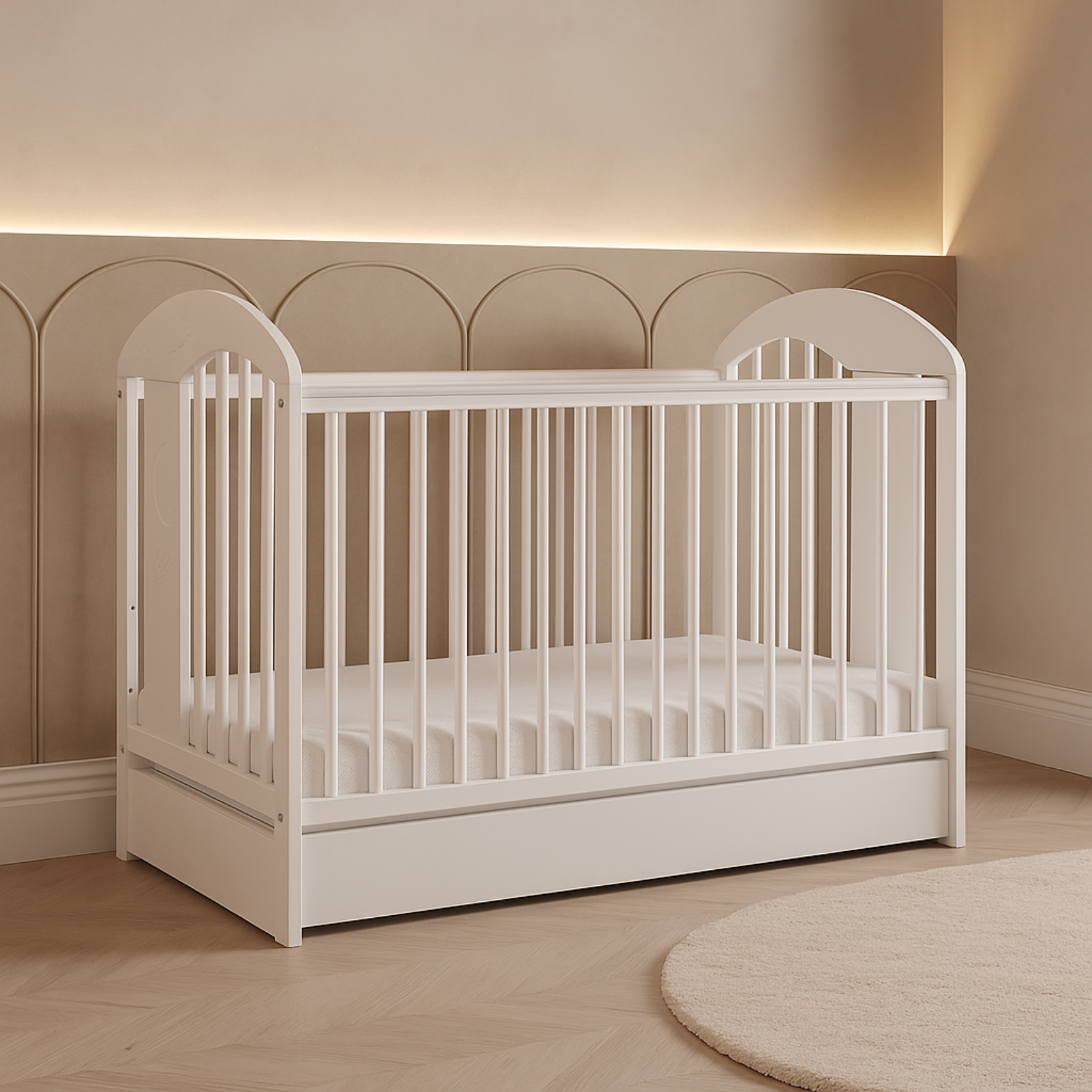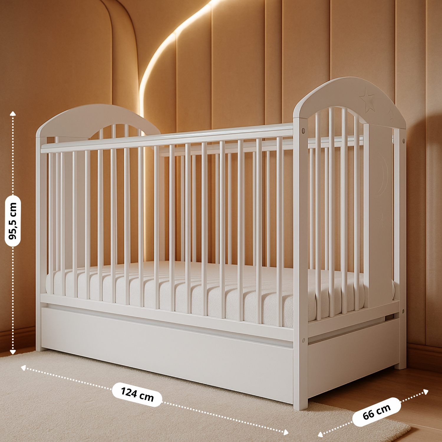 Das Babybett Tonia von Alavya Home steht für kompromisslose Qualität und zeitloses Design. Gefertigt aus hochwertigem, massivem Kiefernholz aus nachhaltiger Forstwirtschaft, vereint es die Schönheit der Natur mit skandinavischer Schlichtheit. Die wasserbasierte Lackierung ist speichelfest und hebt die natürliche Holzstruktur stilvoll hervor – für eine gesunde und sichere Schlafumgebung. Ob Neugeborenes oder Kleinkind – das Tonia Babybett wächst mit. Der Lattenrost ist in drei Höhen verstellbar (18,5, 33 und 48 cm), sodass sich das Bett optimal an die Entwicklungsstufe Ihres Kindes anpassen lässt. Herausnehmbare Schlupfsprossen ermöglichen älteren Babys ein sicheres Ein- und Aussteigen – ganz ohne elterliche Hilfe. Gefertigt in einer renommierten EU-Möbelmanufaktur erfüllt das Tonia Bett sämtliche Anforderungen der Norm DIN EN 716-1. Abgerundete Kanten, stabile Rundstäbe (Ø 16 mm) und ein verstärkter Bettrahmen sorgen für maximale Stabilität und Schutz. Alle eingesetzten Farben und Lacke sind streng geprüft, zertifiziert und 100 % unbedenklich für Kinder. Ein kleines Detail mit großer Wirkung: Die liebevoll eingravierten Stern- und Mondformen auf der Frontseite machen das Babybett Tonia zu einem besonderen Blickfang im Kinderzimmer. Sie schaffen eine warme, einladende Atmosphäre, in der sich Ihr Kind sicher und geborgen fühlt – Tag und Nacht.