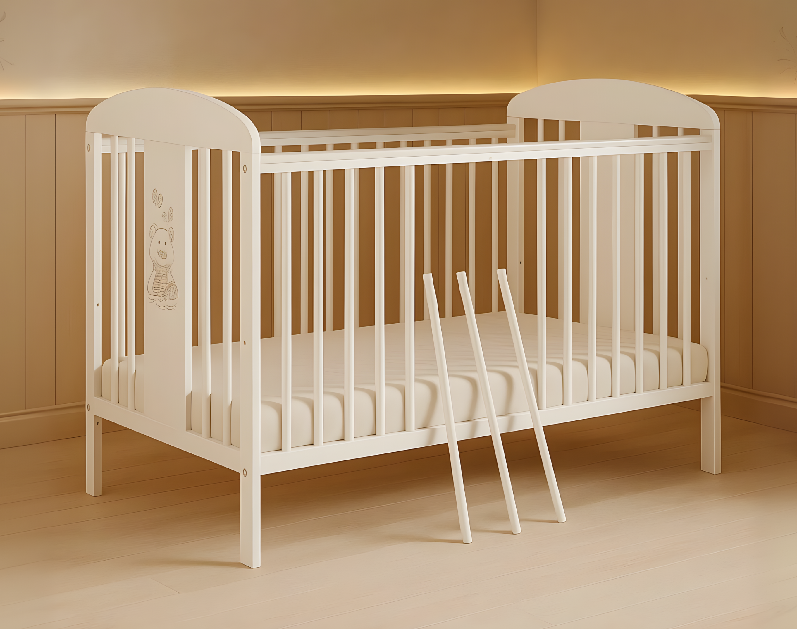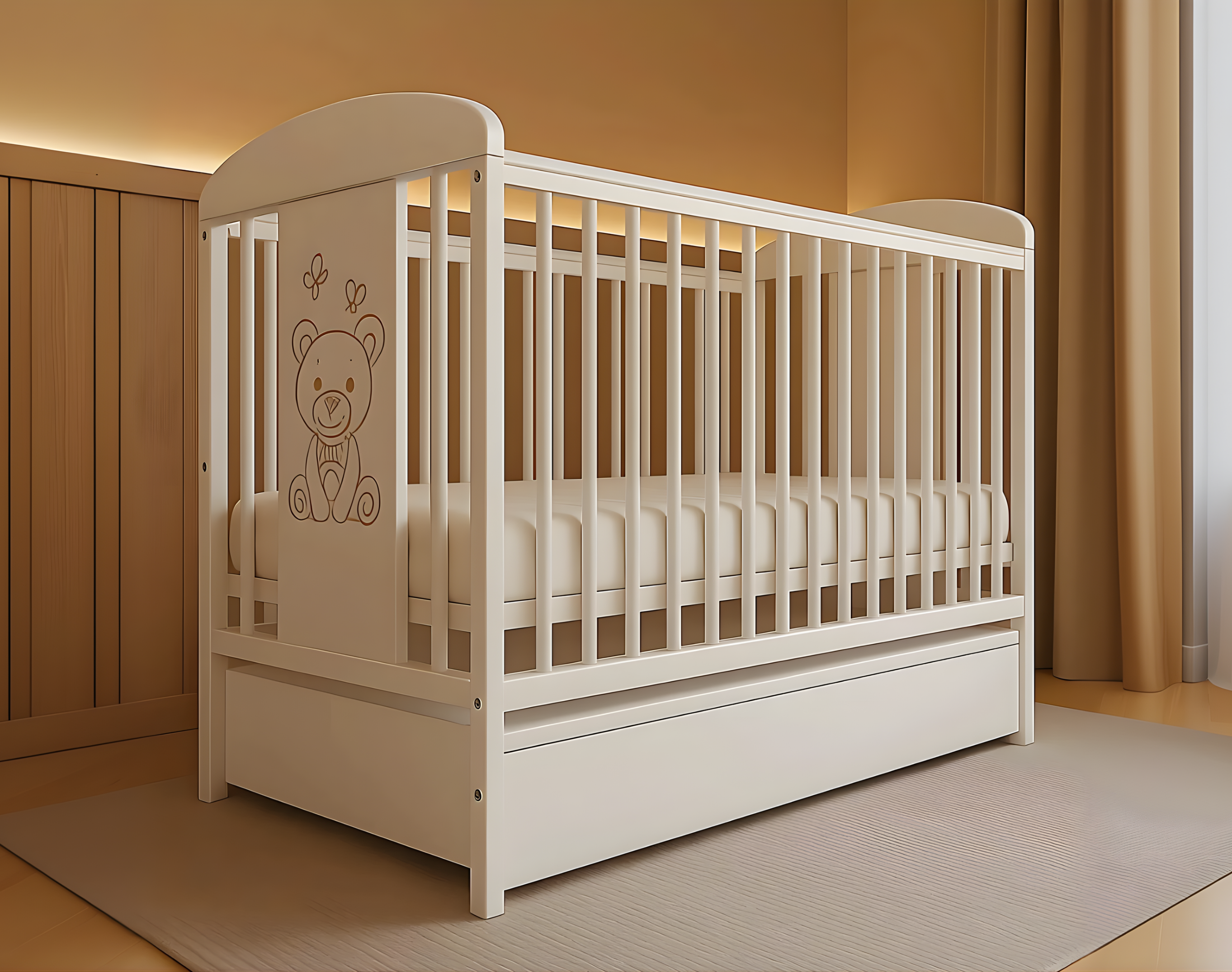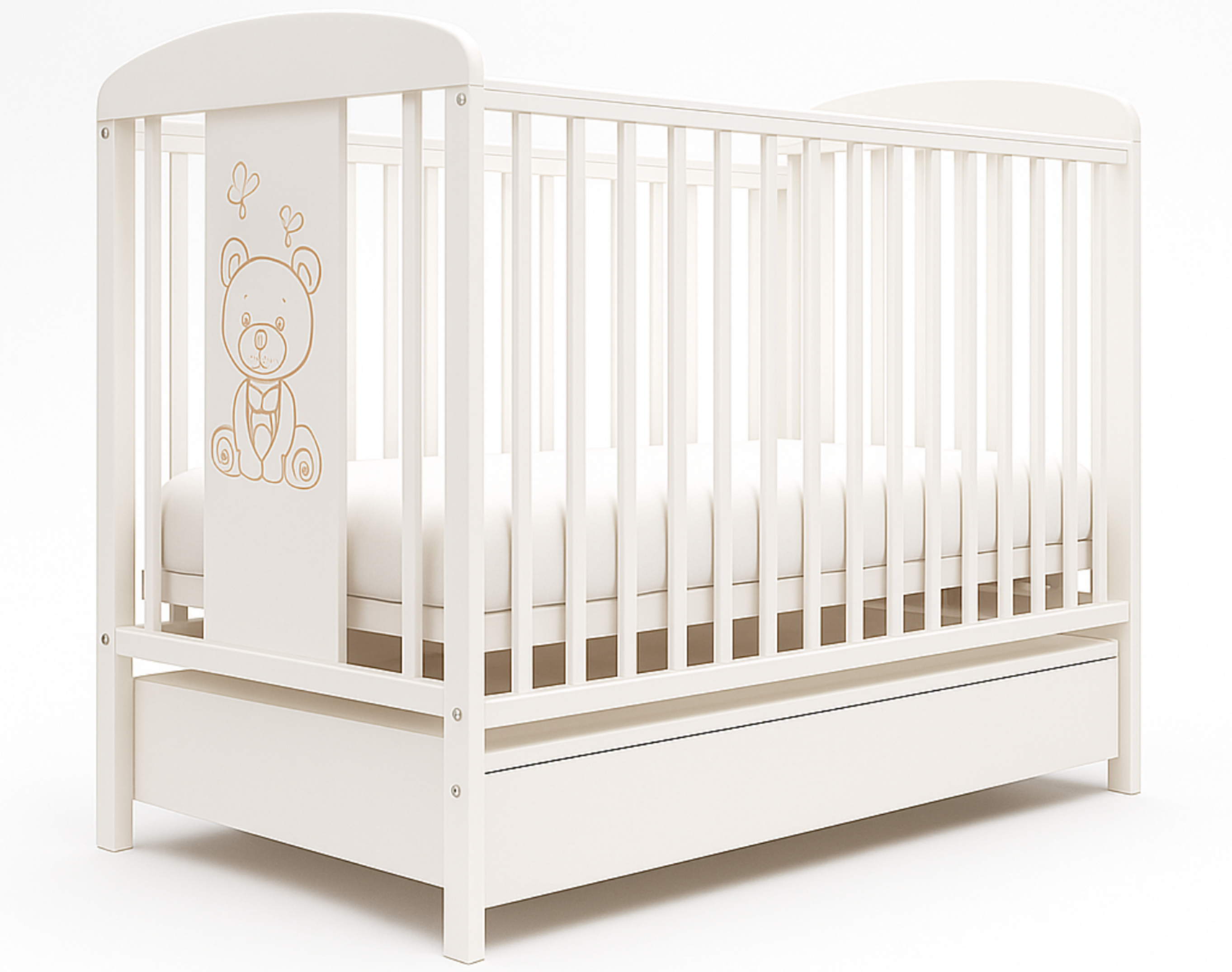 Ein kleines Detail mit großer Wirkung: Das liebevoll eingravierte Teddybär Motiv auf der Frontseite machen das Babybett TORA zu einem besonderen Blickfang im Kinderzimmer. Sie schaffen eine warme, einladende Atmosphäre, in der sich Ihr Kind sicher und geborgen fühlt – Tag und Nacht. Für noch mehr Komfort ist das Bett optional mit einer Babymatratze und Schublade erhältlich