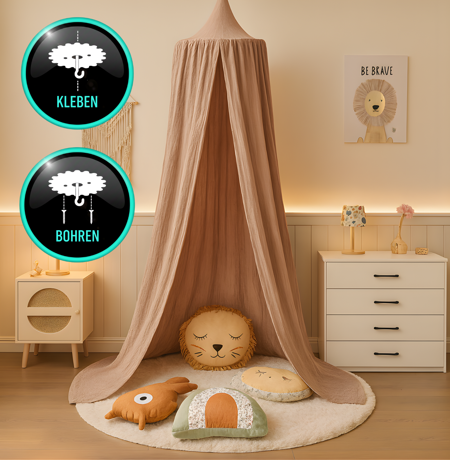Tauchen Sie mit unserem zauberhaften Baldachin in eine Welt der Gemütlichkeit und Fantasie ein! Dieses bezaubernde Accessoire verwandelt jedes Kinderzimmer im Handumdrehen in eine gemütliche Wohlfühloase, die zum Spielen, Kuscheln und Träumen einlädt. Hergestellt aus 100% zertifizierter Bio-Musselin-Baumwolle, ist unser Baldachin nicht nur unglaublich weich und angenehm, sondern auch ein klares Statement für Umweltfreundlichkeit. Die Bio-Baumwolle wird unter strengen ökologischen Standards angebaut und produziert, ohne den Einsatz von chemischen Pestiziden oder Düngemitteln. Die Montage dieses Traum-Baldachins ist ein Kinderspiel. Mit dem mitgelieferten Montageset kann er mühelos an der Decke befestigt werden, entweder durch Bohren mit den mitgelieferten Dübeln und Schrauben oder ganz ohne Bohren dank des optionalen Klebepads. So wird der Baldachin nicht nur zum stilvollen Highlight, sondern schafft auch eine behütete Atmosphäre, die die Fantasie Ihres Kindes beflügelt. Die einzigartige Musselin-Textur verleiht jedem Kinderzimmer eine gemütliche und stilvolle Note. Ob als Lese- und Spielecke, Versteck oder einfach zur Verschönerung – dieser Baldachin schafft ein magisches Raumgefühl für Ihr Kind. Dank seiner hypoallergenen Eigenschaften ist das zertifizierte Material besonders sanft zur empfindlichen Kinderhaut. Die hochwertige Verarbeitung garantiert eine lange Nutzungsdauer und unbeschwerten Spaß.