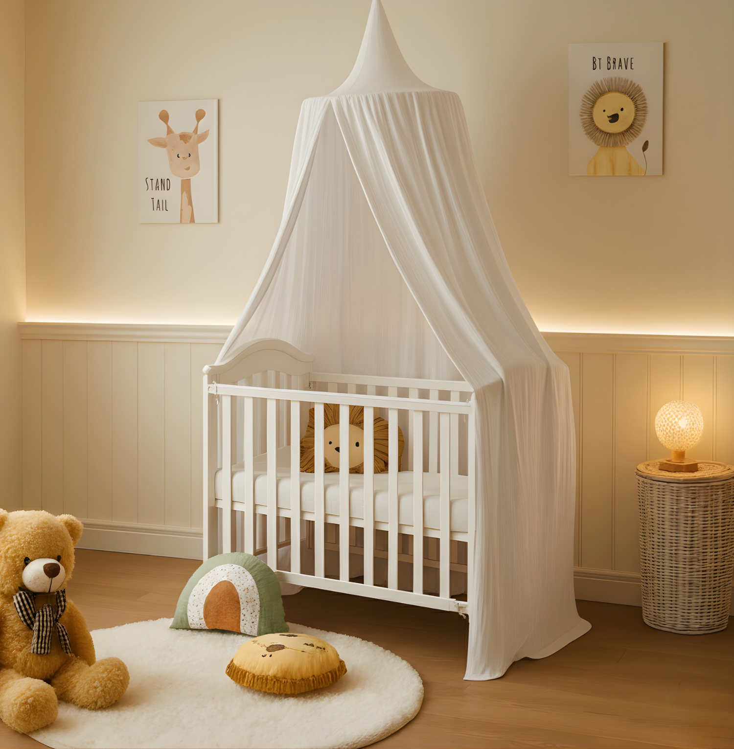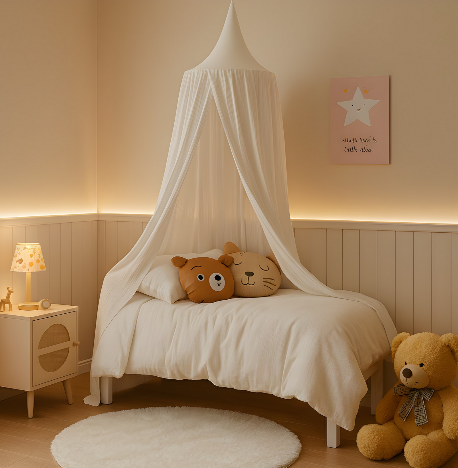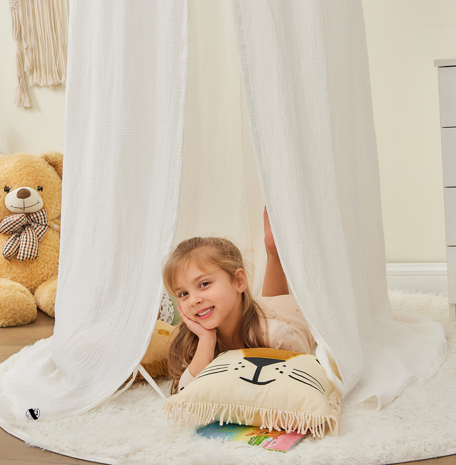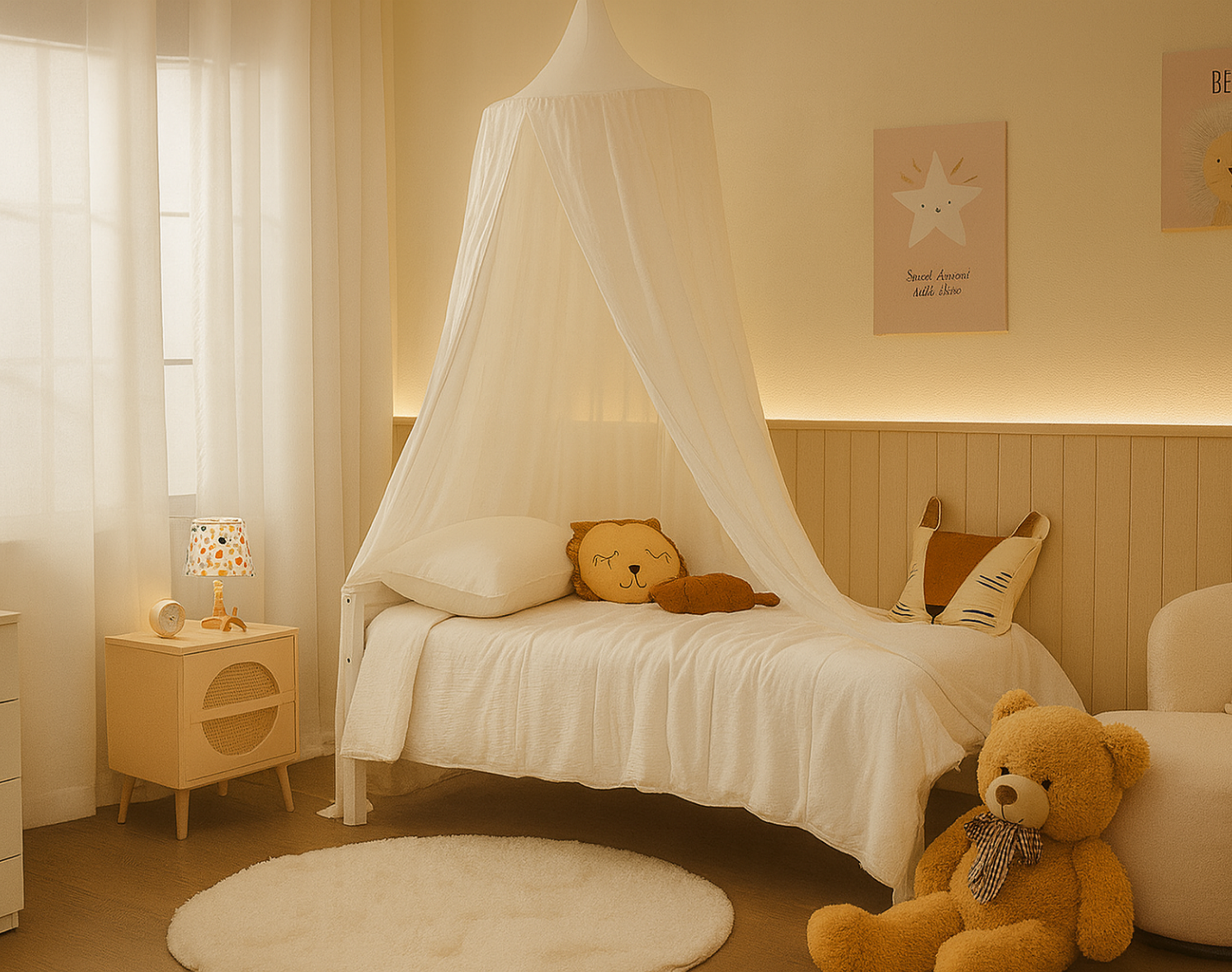 Die einzigartige Musselin-Textur verleiht jedem Kinderzimmer eine gemütliche und stilvolle Note. Ob als Lese- und Spielecke, Versteck oder einfach zur Verschönerung – dieser Baldachin schafft ein magisches Raumgefühl für Ihr Kind. Dank seiner hypoallergenen Eigenschaften ist das zertifizierte Material besonders sanft zur empfindlichen Kinderhaut. Die hochwertige Verarbeitung garantiert eine lange Nutzungsdauer und unbeschwerten Spaß.