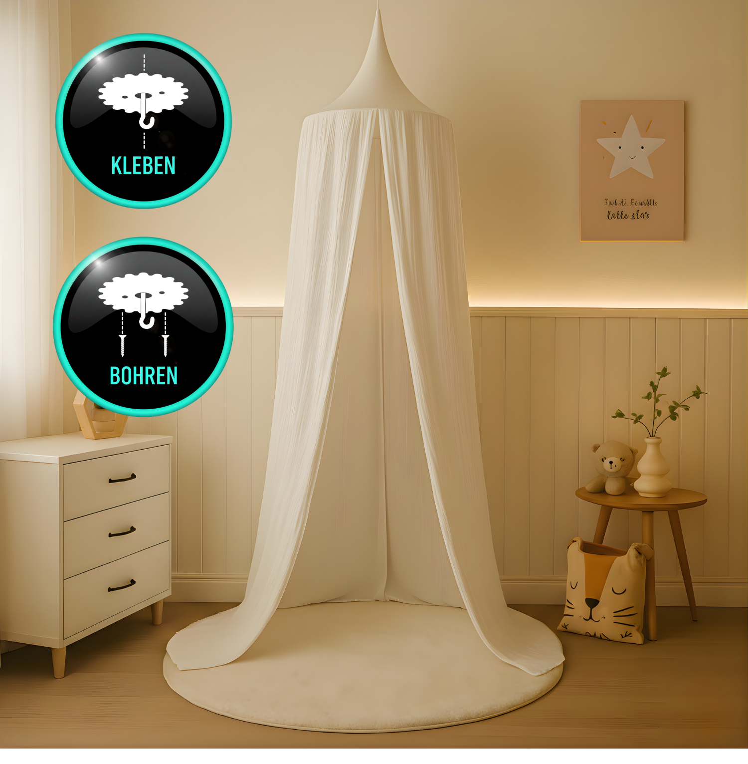 Die Montage dieses Traum-Baldachins ist ein Kinderspiel. Mit dem mitgelieferten Montageset kann er mühelos an der Decke befestigt werden, entweder durch Bohren mit den mitgelieferten Dübeln und Schrauben oder ganz ohne Bohren dank des optionalen Klebepads. So wird der Baldachin nicht nur zum stilvollen Highlight, sondern schafft auch eine behütete Atmosphäre, die die Fantasie Ihres Kindes beflügelt.