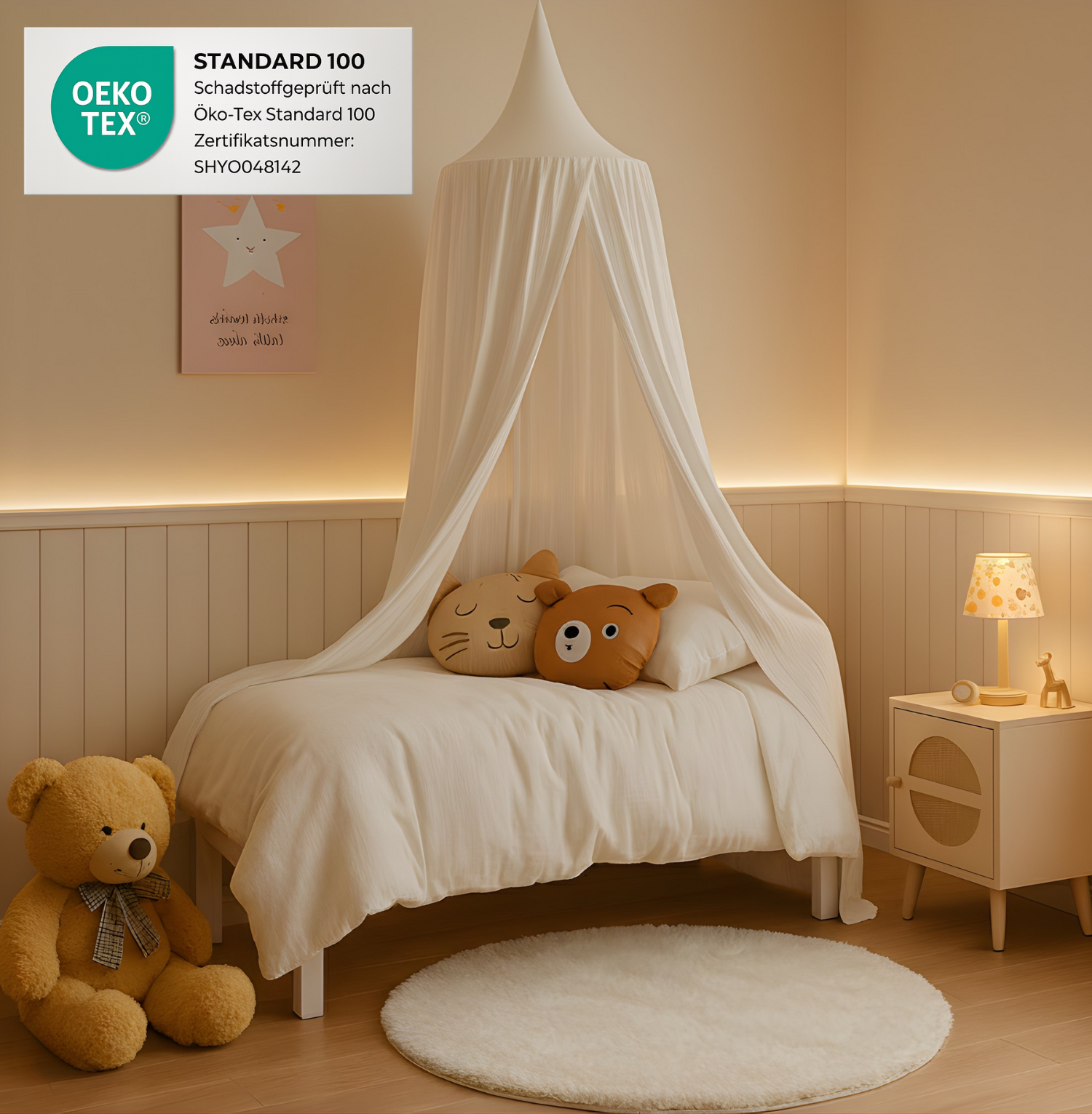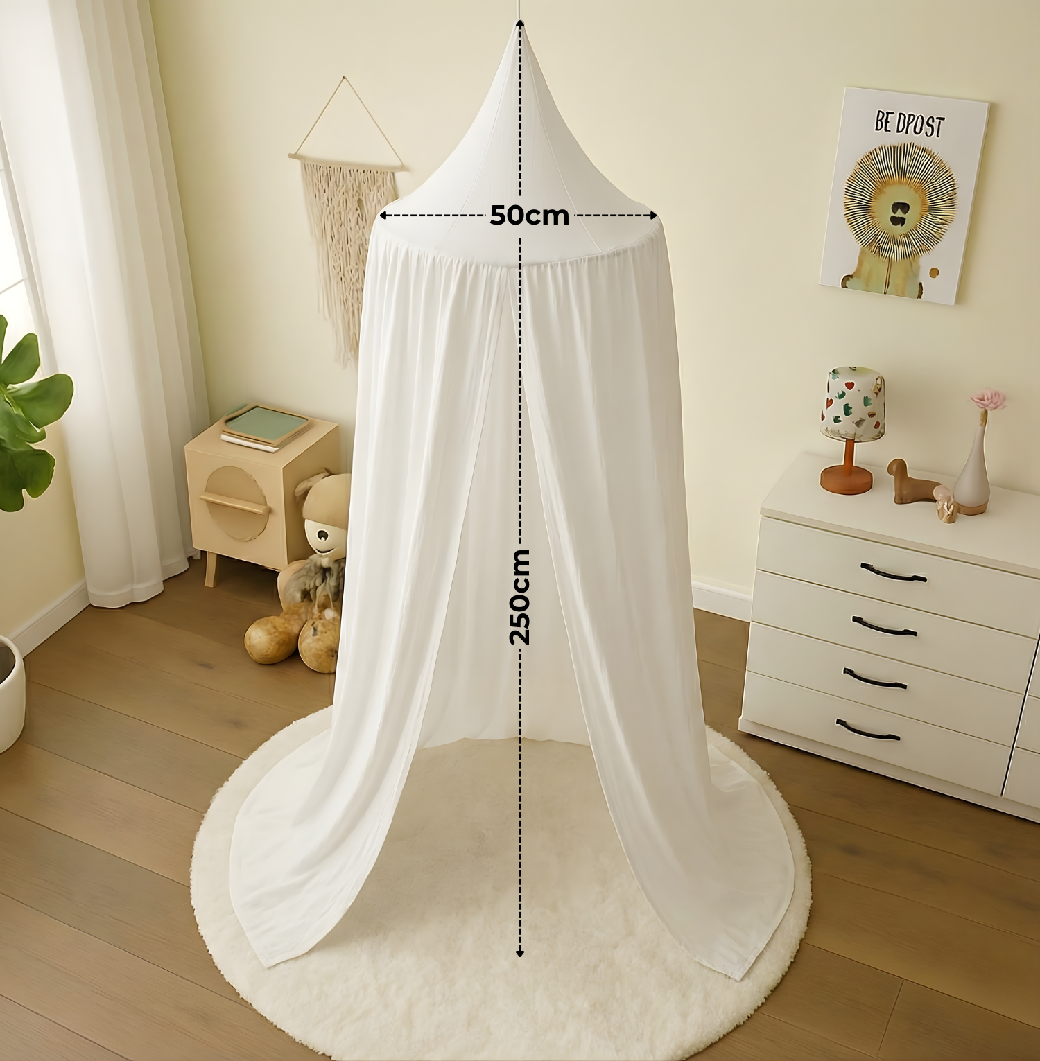 Tauchen Sie mit unserem zauberhaften Baldachin in eine Welt der Gemütlichkeit und Fantasie ein! Dieses bezaubernde Accessoire verwandelt jedes Kinderzimmer im Handumdrehen in eine gemütliche Wohlfühloase, die zum Spielen, Kuscheln und Träumen einlädt. Hergestellt aus 100% zertifizierter Bio-Musselin-Baumwolle, ist unser Baldachin nicht nur unglaublich weich und angenehm, sondern auch ein klares Statement für Umweltfreundlichkeit. Die Bio-Baumwolle wird unter strengen ökologischen Standards angebaut und produziert, ohne den Einsatz von chemischen Pestiziden oder Düngemitteln. Die Montage dieses Traum-Baldachins ist ein Kinderspiel. Mit dem mitgelieferten Montageset kann er mühelos an der Decke befestigt werden, entweder durch Bohren mit den mitgelieferten Dübeln und Schrauben oder ganz ohne Bohren dank des optionalen Klebepads. So wird der Baldachin nicht nur zum stilvollen Highlight, sondern schafft auch eine behütete Atmosphäre, die die Fantasie Ihres Kindes beflügelt. Die einzigartige Musselin-Textur verleiht jedem Kinderzimmer eine gemütliche und stilvolle Note. Ob als Lese- und Spielecke, Versteck oder einfach zur Verschönerung – dieser Baldachin schafft ein magisches Raumgefühl für Ihr Kind. Dank seiner hypoallergenen Eigenschaften ist das zertifizierte Material besonders sanft zur empfindlichen Kinderhaut. Die hochwertige Verarbeitung garantiert eine lange Nutzungsdauer und unbeschwerten Spaß.