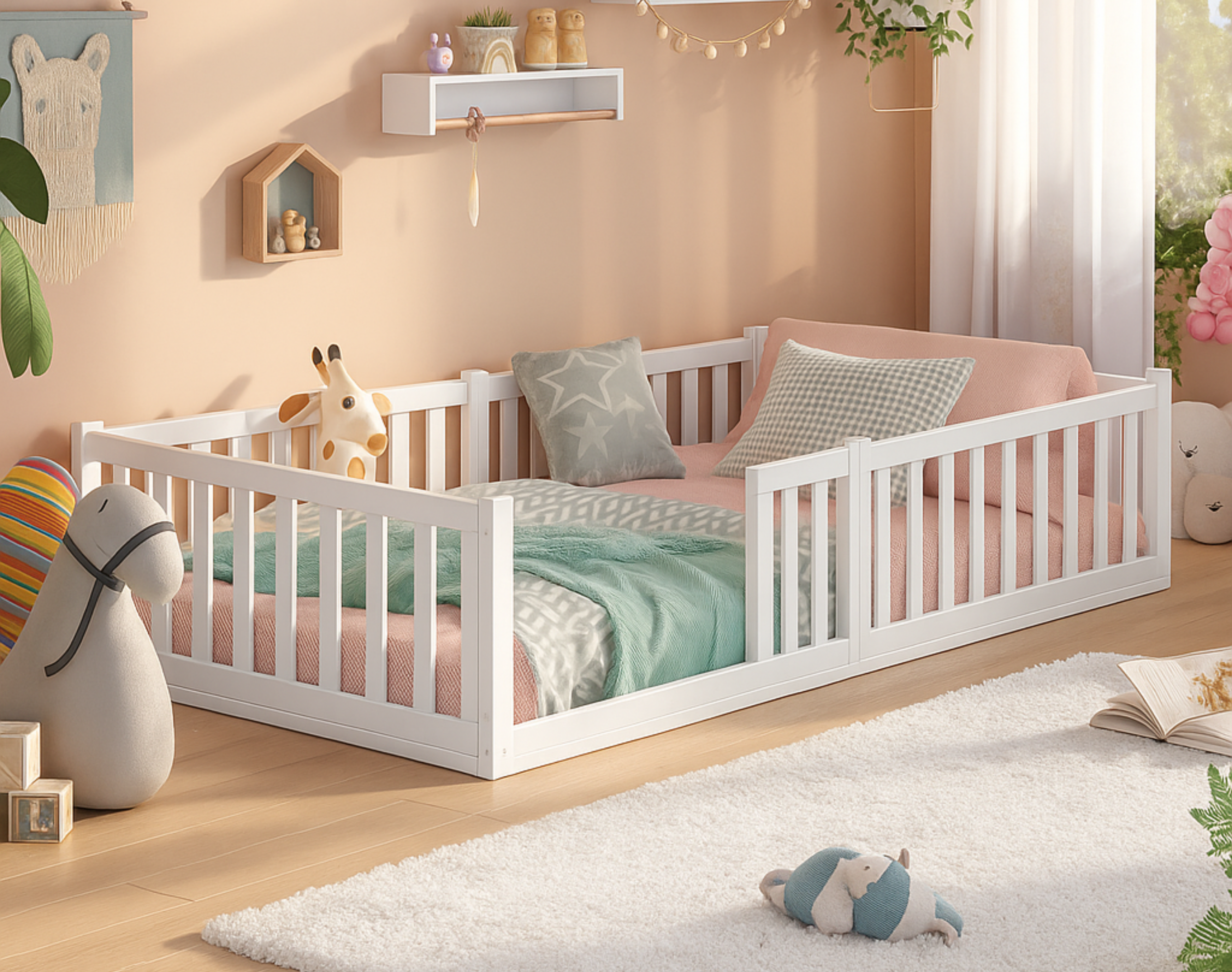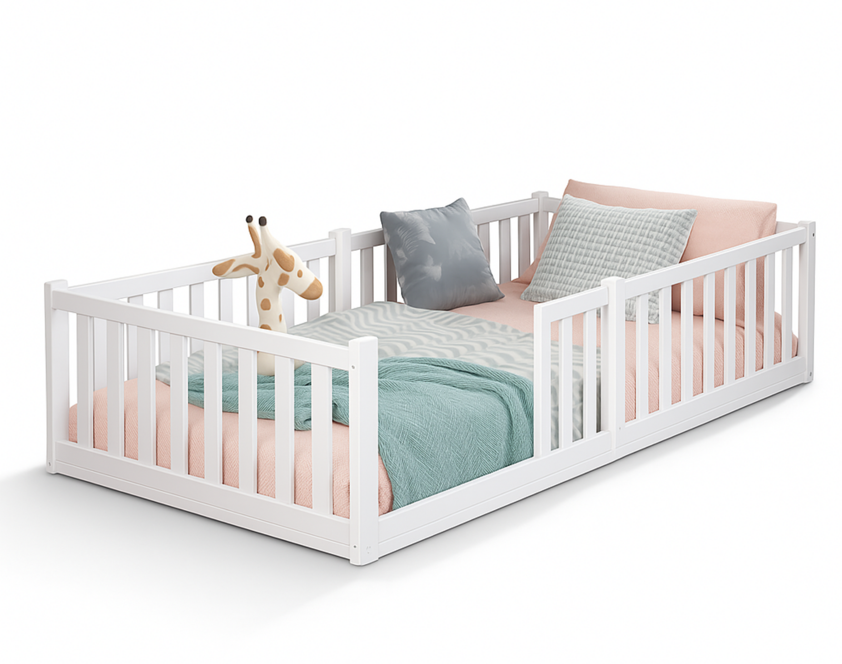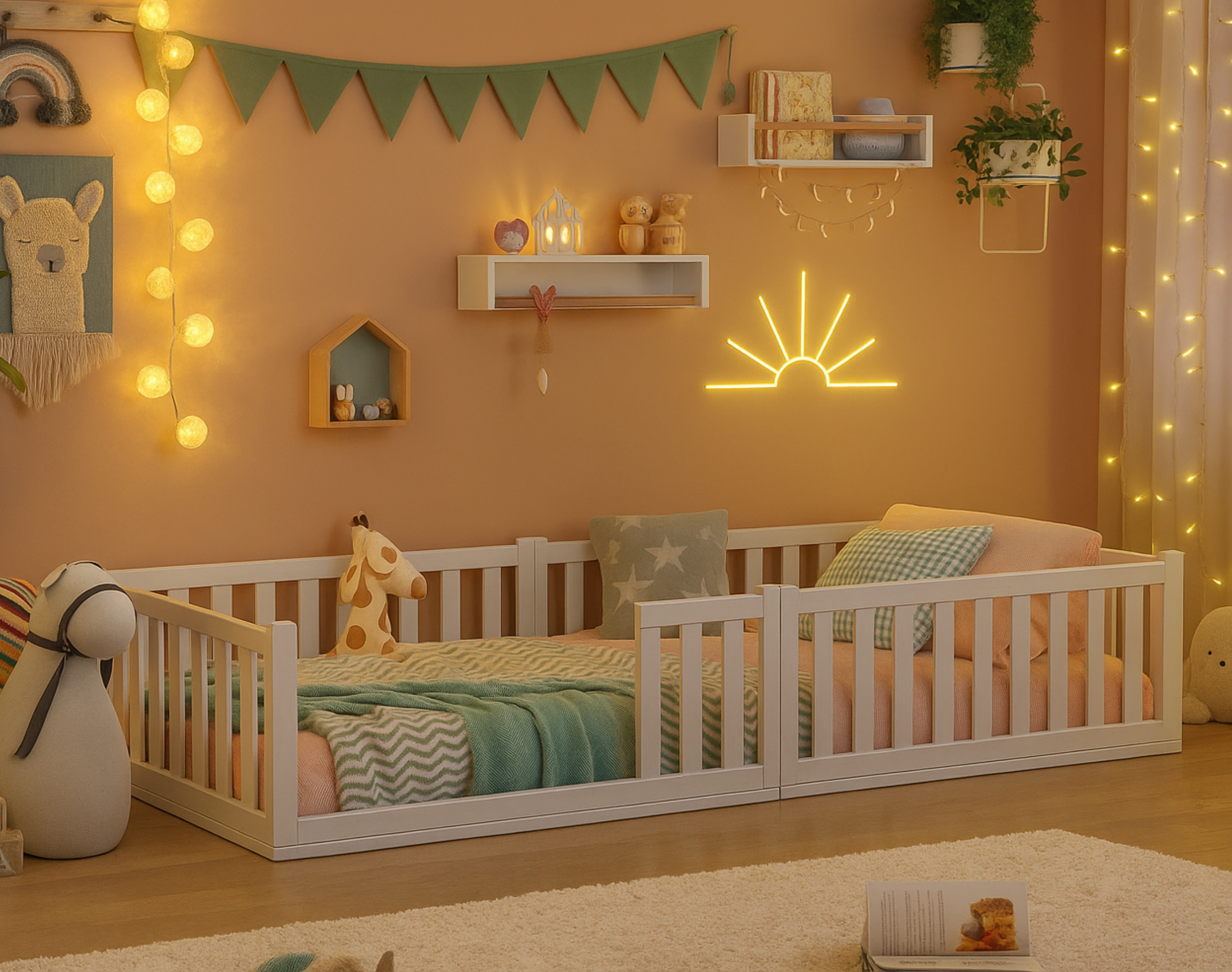 Bei der Herstellung des Bodenbett Titans wurden ausschließlich Materialien von höchster Qualität verwendet, um maximale Sicherheit und Langlebigkeit zu garantieren. Die Farben und Lacke, die bei der Fertigung des Bodenbettes verwendet werden, sind schadstofffrei und entsprechen den höchsten europäischen Sicherheitsstandards. Sie sind zertifiziert und auf ihre Unbedenklichkeit geprüft, sodass Eltern sicher sein können, dass ihre Kinder in einer gesunden und sicheren Umgebung schlafen und spielen. Die wasserbasierte Lackierung ist DIN EN 71-3:2019 zertifiziert, geruchsneutral und sorgt dafür, dass kein unangenehmer Geruch im Kinderzimmer entsteht. Unser Bodenbett überzeugt durch eine außergewöhnliche Tragkraft von bis zu 180 kg und abgerundete Kanten, die Verletzungsrisiken minimieren. Es ist frei von Schadstoffen, um eine reizfreie Schlafumgebung zu gewährleisten, und wird nach den strengen Anforderungen der DIN EN 716-1 gebaut. Die stabilen und langlebigen Konstruktionen aus hochwertigem Buchenholz machen das Bett zu einem sicheren und beständigen Begleiter im Kinderzimmer.Die Farben des Bettes sind speichelfest und kindgerecht gestaltet, sodass sie auch den härtesten Beanspruchungen standhalten. Die geprüfte Qualität und die stabile Konstruktion sorgen für eine sichere und angenehme Schlafumgebung. Das Alavya Home Bodenbett Titan aus Buchenholz verbindet Stabilität, Sicherheit und kindgerechtes Design zu einem langlebigen Möbelstück, das Ihr Kind lieben wird. Der Rausfallschutz unseres Bodenbetts kann sowohl links als auch rechts montiert werden. Sobald Ihr Kind groß genug ist, lässt sich der Fallschutz komplett entfernen. Dieses Bett wächst mit Ihrem Kind und passt sich seinen Bedürfnissen perfekt an. Bereits vor dem Laufalter ermöglicht unser Kinderbett eigenständiges Ein- und Aussteigen, fördert gemäß den Montessori-Prinzipien die Eigenständigkeit und unterstützt die motorische Entwicklung Ihres Kindes.