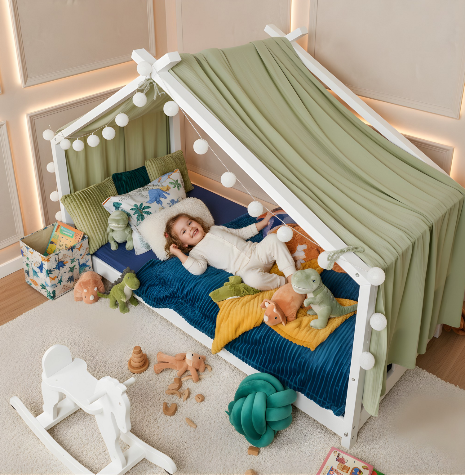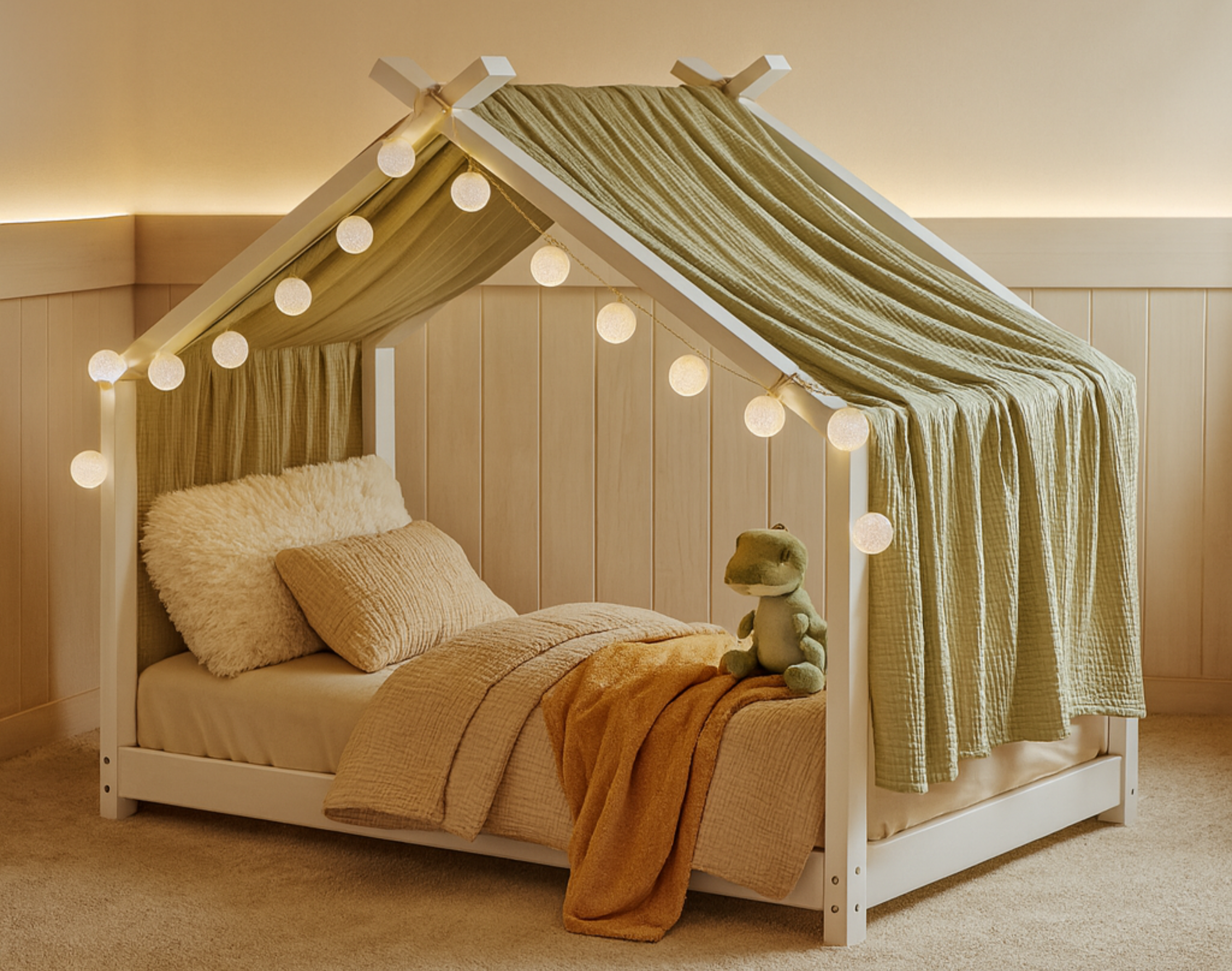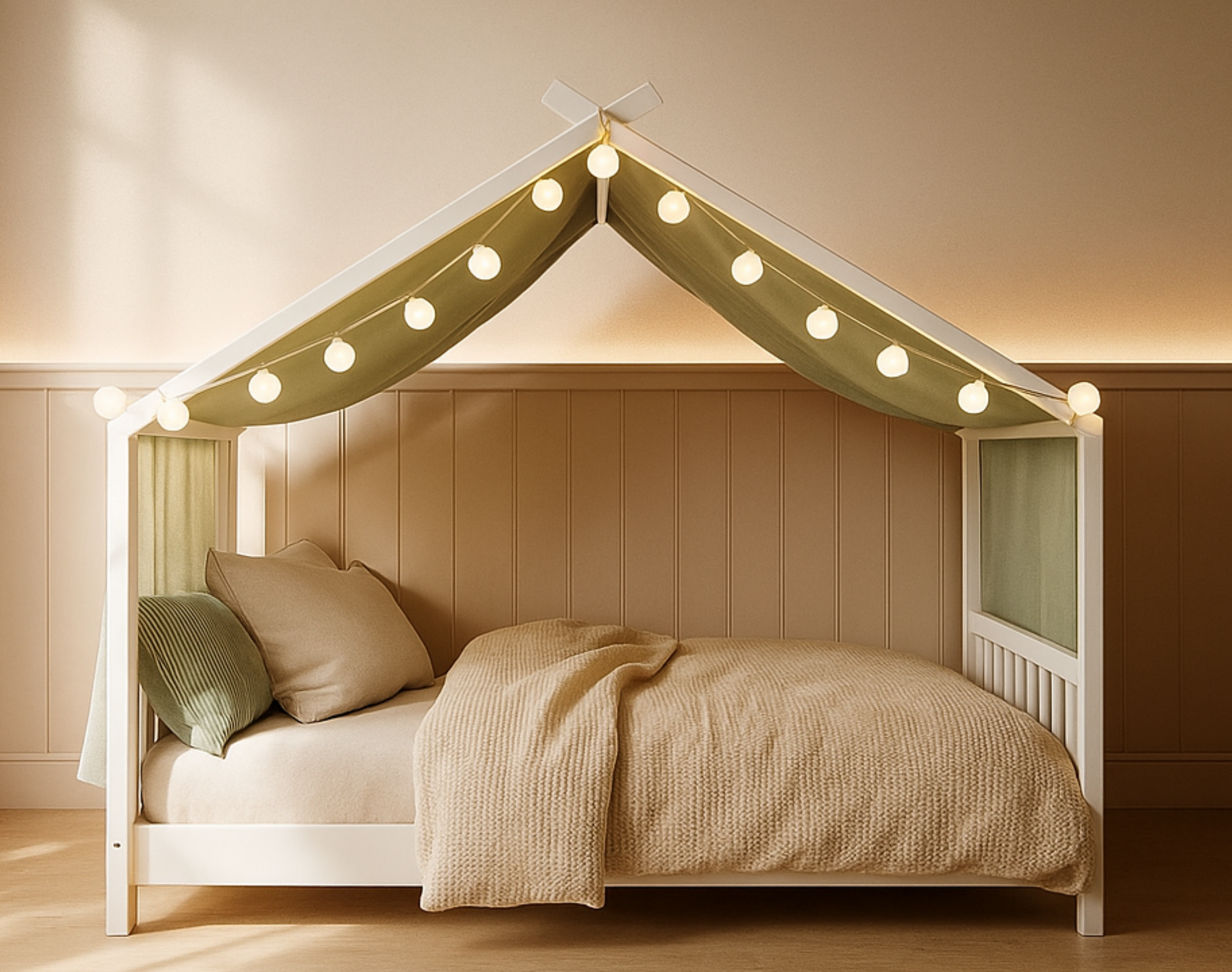 Unser exklusives Hausbett-Dekoset "Moon" zaubert eine einzigartige Atmosphäre in jedes Kinderzimmer. Es ist weit mehr als nur eine Dekoration – es öffnet die Tür zu Fantasie und Abenteuer. Das Set beinhaltet einen bezaubernden Betthimmel, der mühelos am Dach und den Pfosten befestigt werden kann. Hergestellt aus 100% GOTS-zertifizierter Bio-Musselin-Baumwolle, verspricht er nicht nur eine traumhafte Optik, sondern auch höchste Qualität.Die mitgelieferte LED-Lichterkette mit 20 Baumwollkugeln taucht den Raum in ein märchenhaftes Licht und schafft eine gemütliche Atmosphäre unter dem Betthimmel. Diese einzigartige Beleuchtung sorgt für eine magische Stimmung, die die Vorstellungskraft jedes Kindes beflügelt. Die Pflege des Dekosets gestaltet sich unkompliziert, denn es lässt sich problemlos bei 30°C waschen, ohne an Strahlkraft zu verlieren. Die Farben bleiben lebendig, die Stoffe bleiben weich, und die Qualität bleibt unverändert – eine langanhaltende Freude für jedes Kinderzimmer.