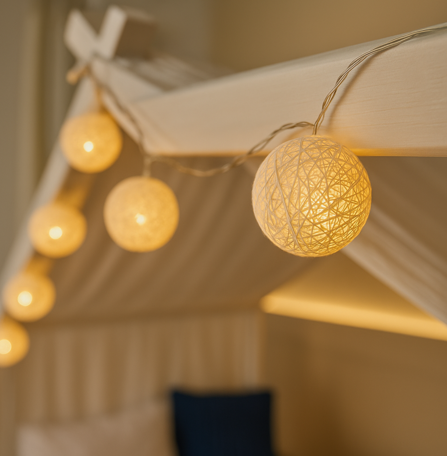 Unser Dekoset umfasst ebenso eine bezaubernde LED-Lichterkette mit 20 Baumwollkugeln, die jedes Zimmer in eine märchenhafte Oase verwandelt. Diese Lichterkette dient als zauberhaftes Nachtlicht und taucht die kuschelige Ecke unter dem Betthimmel in ein sanftes, warmes Licht für eine behagliche Schlafatmosphäre. Diese Kugeln können nicht nur als zauberhaftes Nachtlicht dienen, sondern auch die kuschelige Ecke unter dem Betthimmel erhellen.