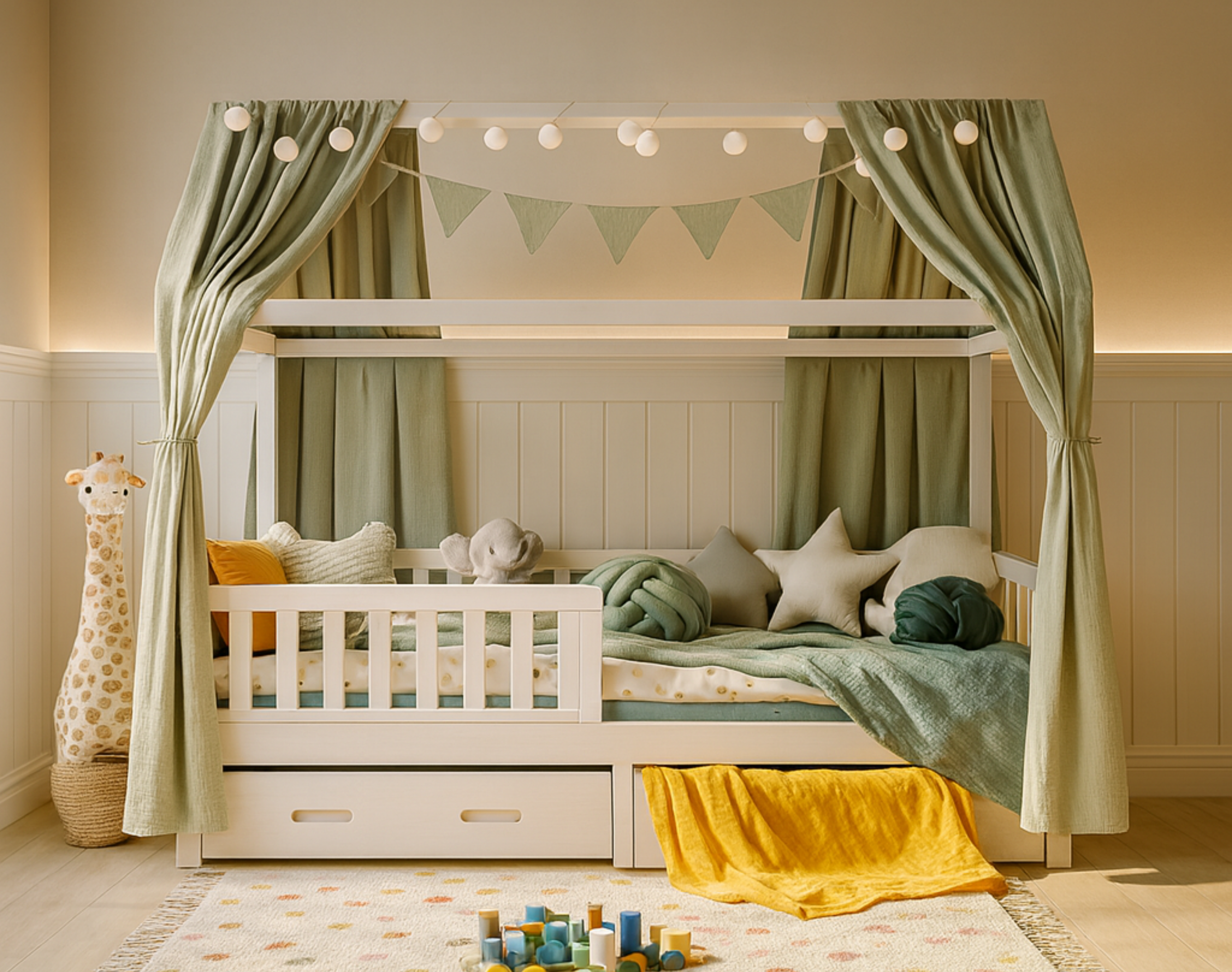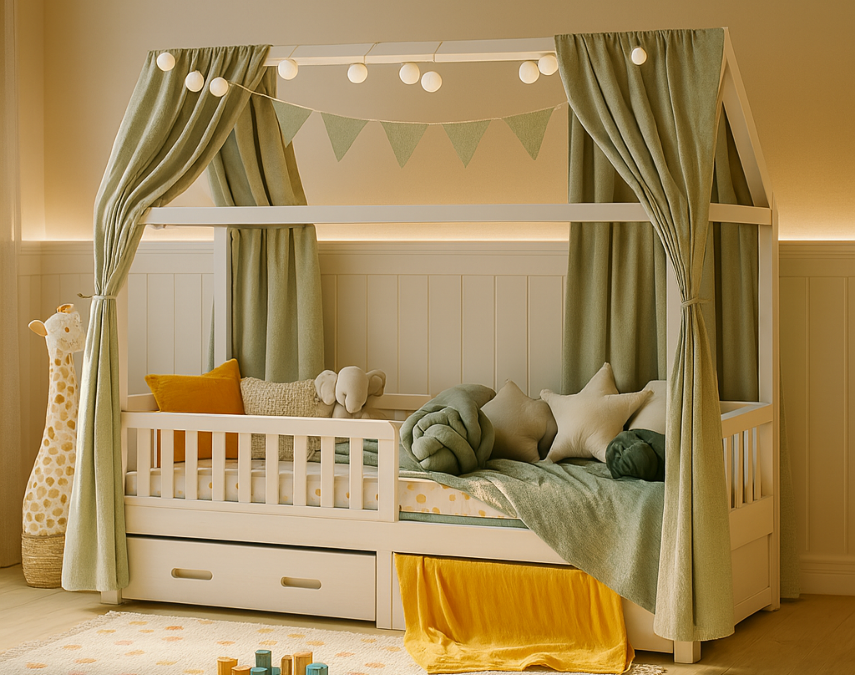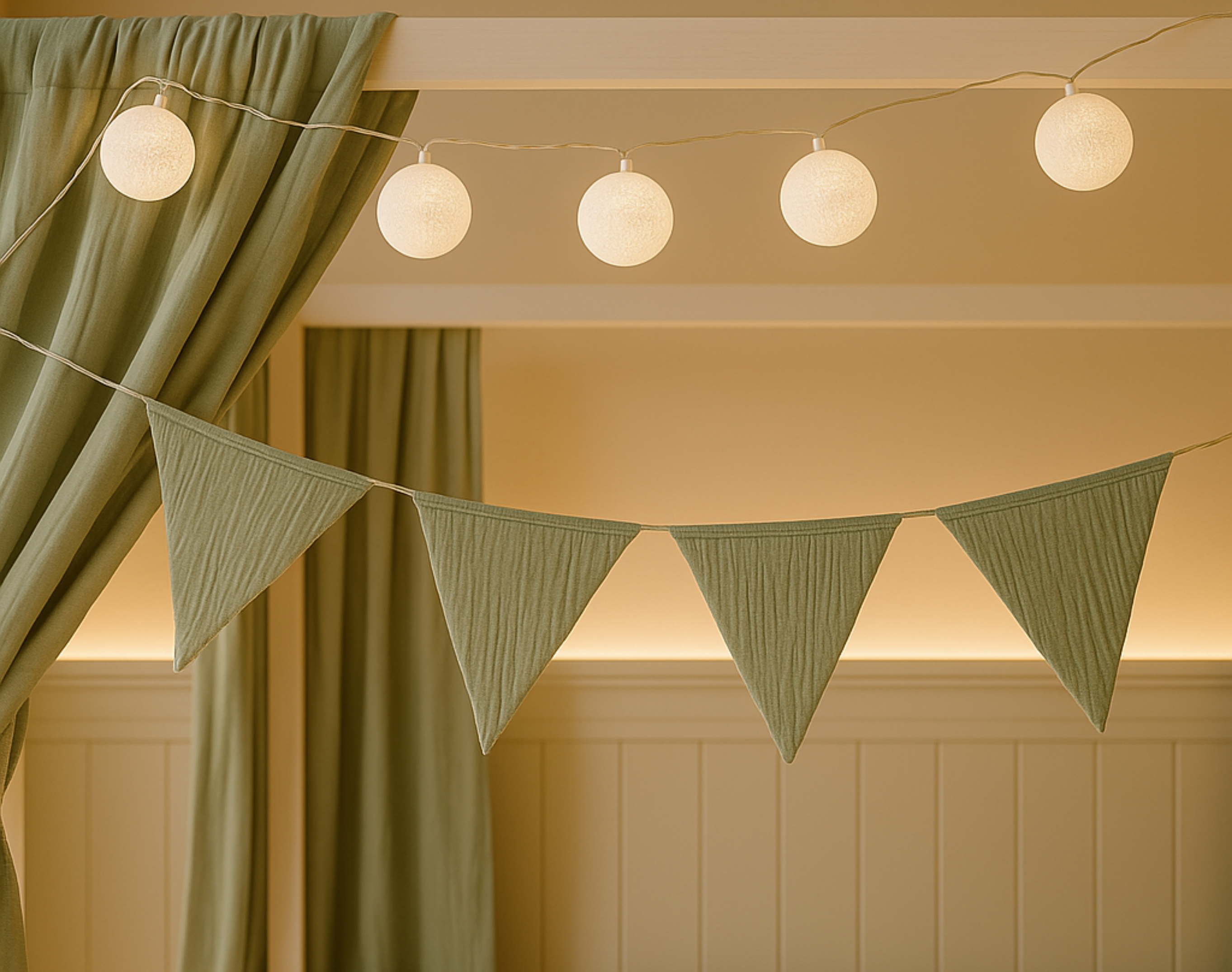 Verleihen Sie dem Schlafbereich Ihres Hausbettes eine traumhafte Note mit unserem exquisiten Dekoset. Dieses Set schafft einen gemütlichen Ort zum Schlafen und Kuscheln, der eine zauberhafte Schlafatmosphäre in jedem Kinderzimmer kreiert. Das Material unseres Dekosets besteht zu 100% aus zertifizierter Bio-Musselin Baumwolle, was nicht nur für außergewöhnliche Weichheit sorgt, sondern auch einen exklusiven Look verleiht. Unser liebevoll zusammengestelltes Set besteht aus einer Wimpelkette mit 9 Stück Wimpeln und zwei Betthimmeln, die mit Schlaufen zur einfachen Befestigung am Dach ausgestattet sind. Diese Kombination schafft eine harmonische und stilvolle Dekoration für jedes Kinderzimmer. Mit unserem einzigartigen Dekoset verwandeln Sie das Kinderzimmer in einen Ort der Geborgenheit und Eleganz. Schaffen Sie eine besondere Umgebung für Ihre Kleinen, die nicht nur schön anzusehen ist, sondern auch höchsten Ansprüchen an Qualität und Nachhaltigkeit gerecht wird.