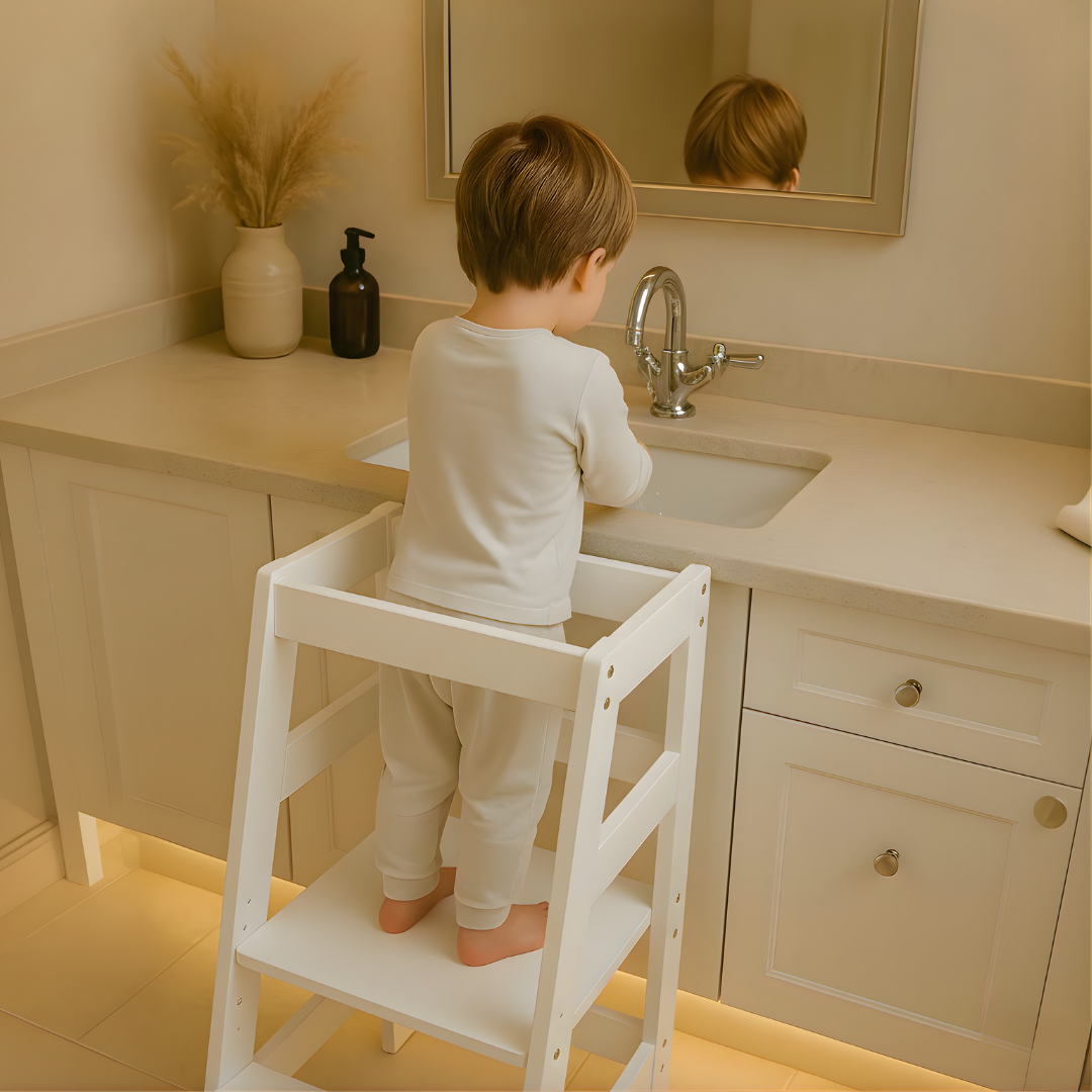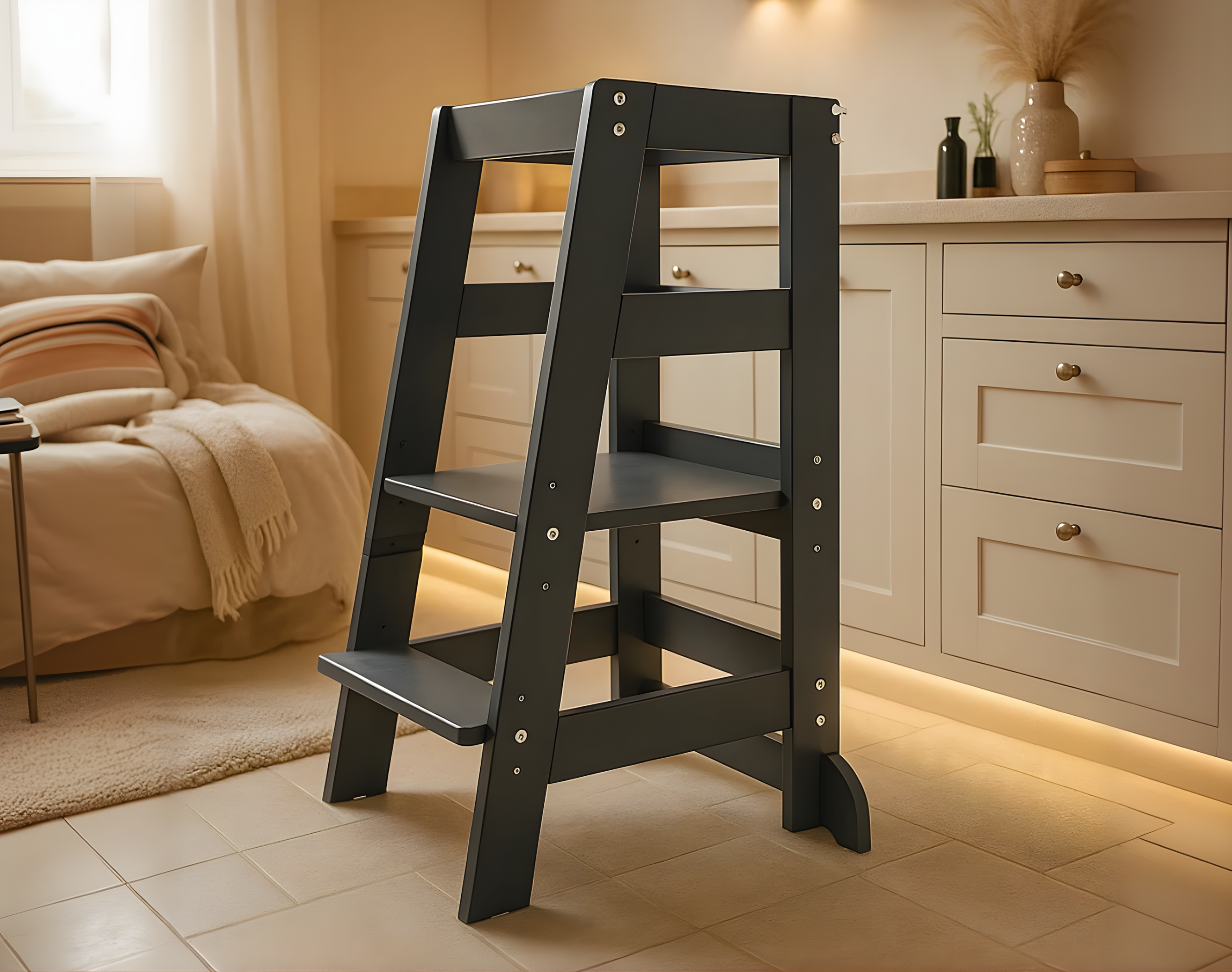 Unser NEO Lernturm ist in drei verschiedenen höhenverstellbar, damit er perfekt auf das Alter und die Bedürfnisse Ihres Kindes abgestimmt werden kann. Von den ersten Schritten bis zum fünften Geburtstag – dieser Lernturm wächst mit Ihrem Kind mit. Hergestellt aus massivem Buchenholz, zeichnet sich der NEO Lernturm durch seine erstklassige Qualität aus. Jedes Teil wird von Hand geformt und abgerundet, um maximale Sicherheit für Ihre Liebsten zu gewährleisten. Unsere verwendeten Farben sind nicht nur geruchsneutral, sondern auch nach DIN EN 71-3:2019 zertifiziert und somit absolut kindgerecht. Sie können sicher sein, dass Ihr Kind in einer gesunden und sicheren Umgebung aufwächst. Der NEO Lernturm ist von der Montessori-Philosophie inspiriert und fördert spielerisches Lernen und die Selbstständigkeit Ihres Kindes. Ob beim Kochen, Backen oder einfach nur beim Händewaschen – Ihr Kind kann aktiv am Geschehen teilnehmen und seine Fähigkeiten entwickeln. Mit dem Lernturm können Kinder jederzeit auf Augenhöhe sein. Sie können nicht nur zusehen, sondern auch tatkräftig mithelfen. Diese Interaktion fördert die kognitive Entwicklung und stärkt das Selbstbewusstsein der kleinen Entdecker. NEO Kinder Lernturm aus massivem Buchenholz mit zeitlosem Design, das sich in jede Raumgestaltung harmonisch einfügt und mit anderen Möbeln perfekt kombinierbar ist. Der umlaufende Rausfallschutz bietet zusätzliche Sicherheit, sodass Sie sich keine Sorgen machen müssen, während Ihr Kind den Lernturm nutzt.