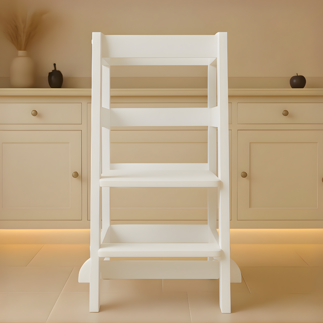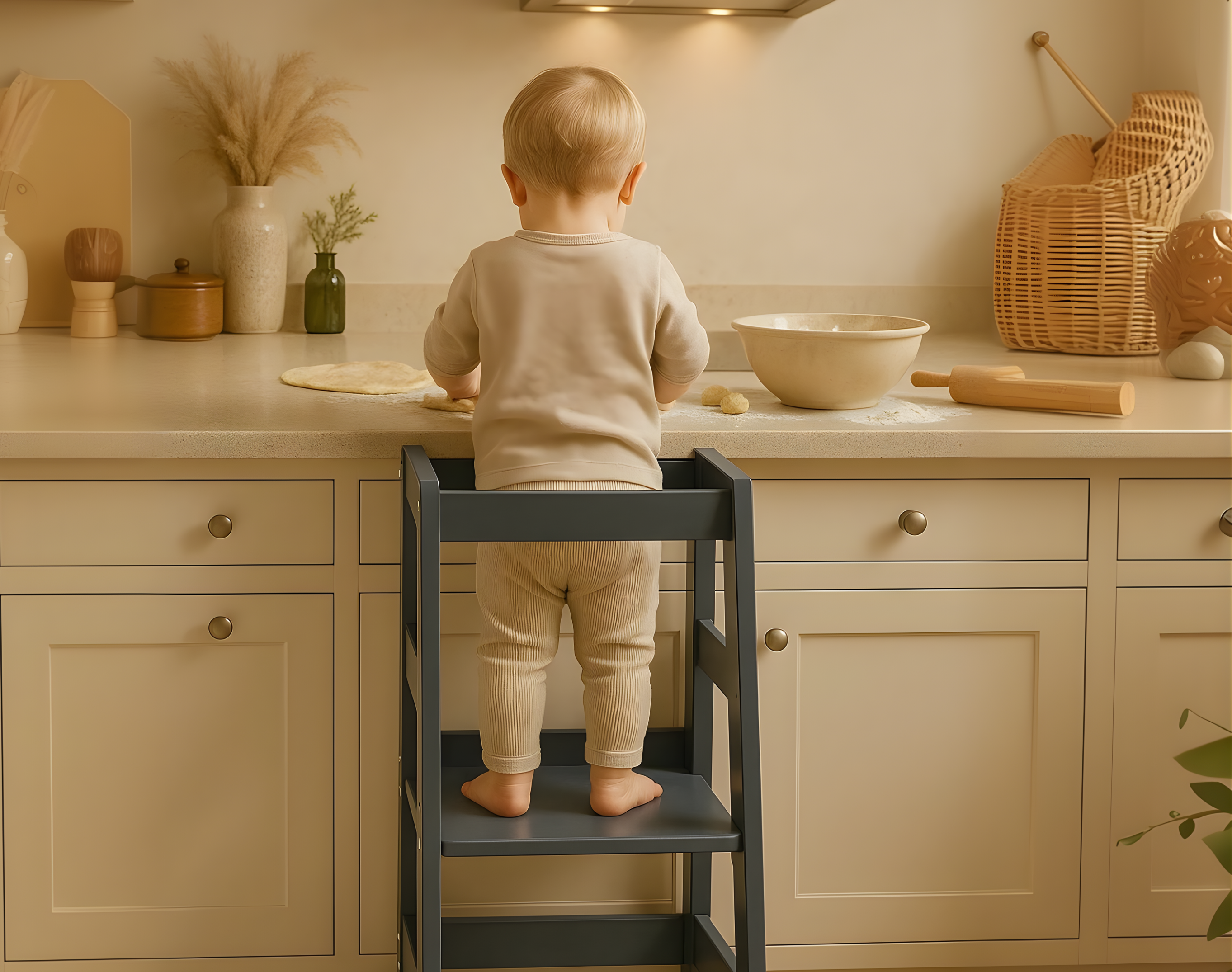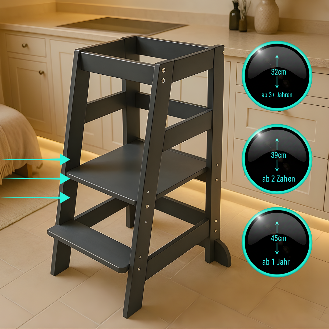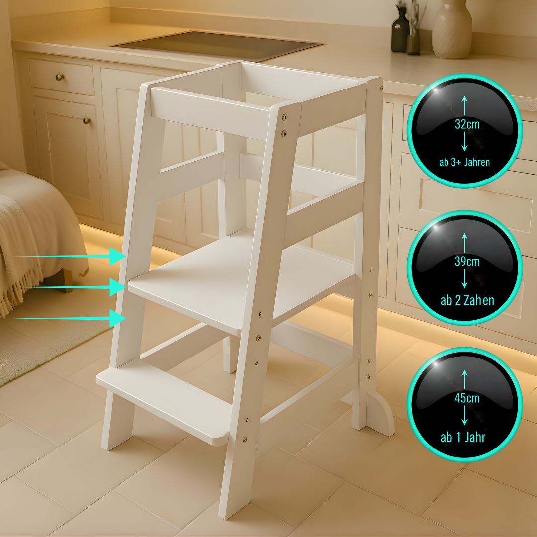 Kinder wachsen – und der NEO Lernturm wächst mit. Mit drei höhenverstellbaren Plattformen passt er sich perfekt an die Entwicklungsstufen Ihres Kindes an. Vom ersten sicheren Stehen bis zum Vorschulalter begleitet er Ihr Kind ergonomisch, sicher und verlässlich – ein treuer Alltagshelfer mit Weitblick. Der umlaufende Rausfallschutz gibt kleinen Entdeckern sicheren Halt bei jeder Aktivität. Ob beim Greifen, Strecken oder Mithelfen – Ihr Kind steht stabil und geschützt.