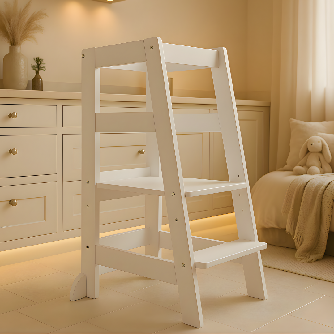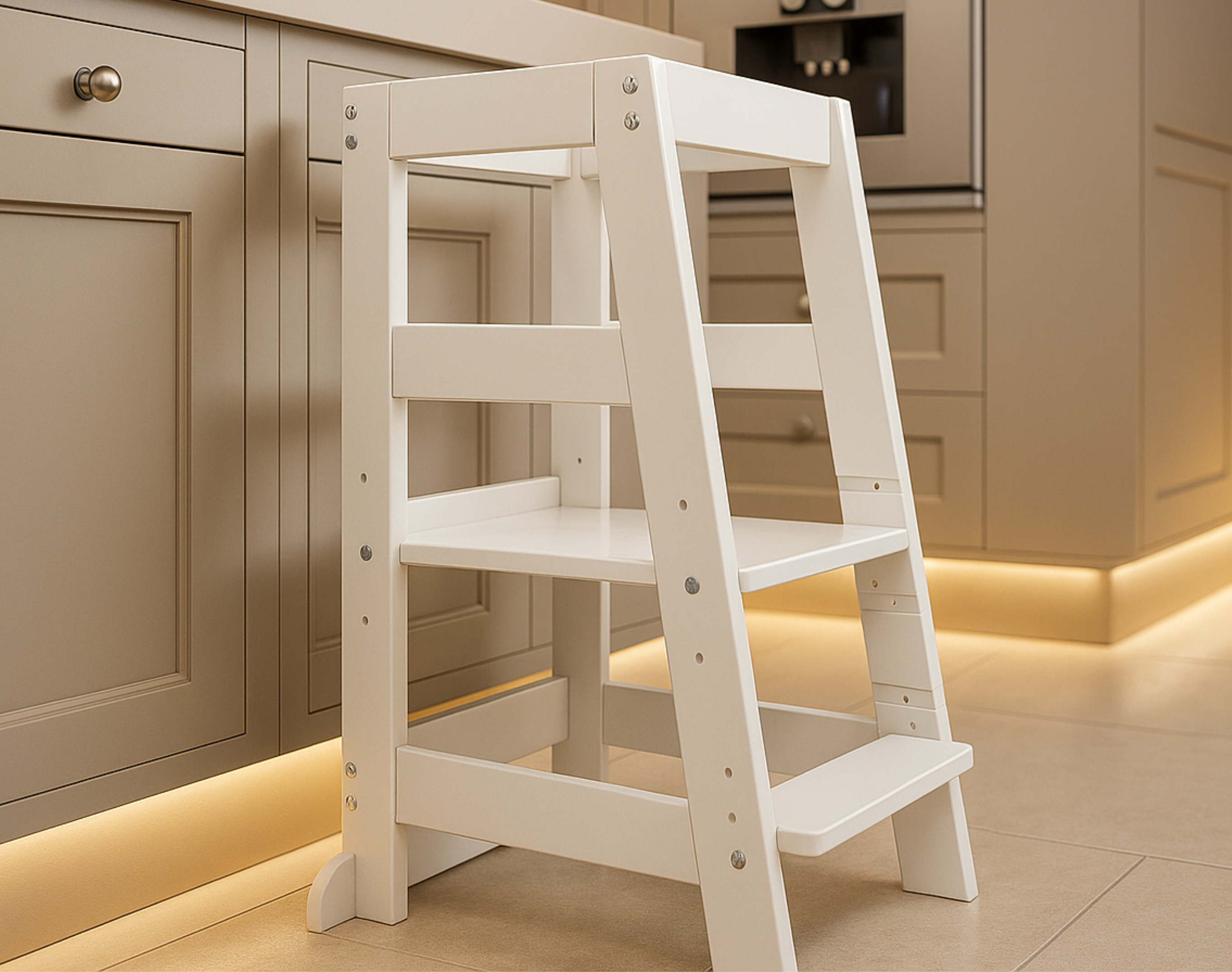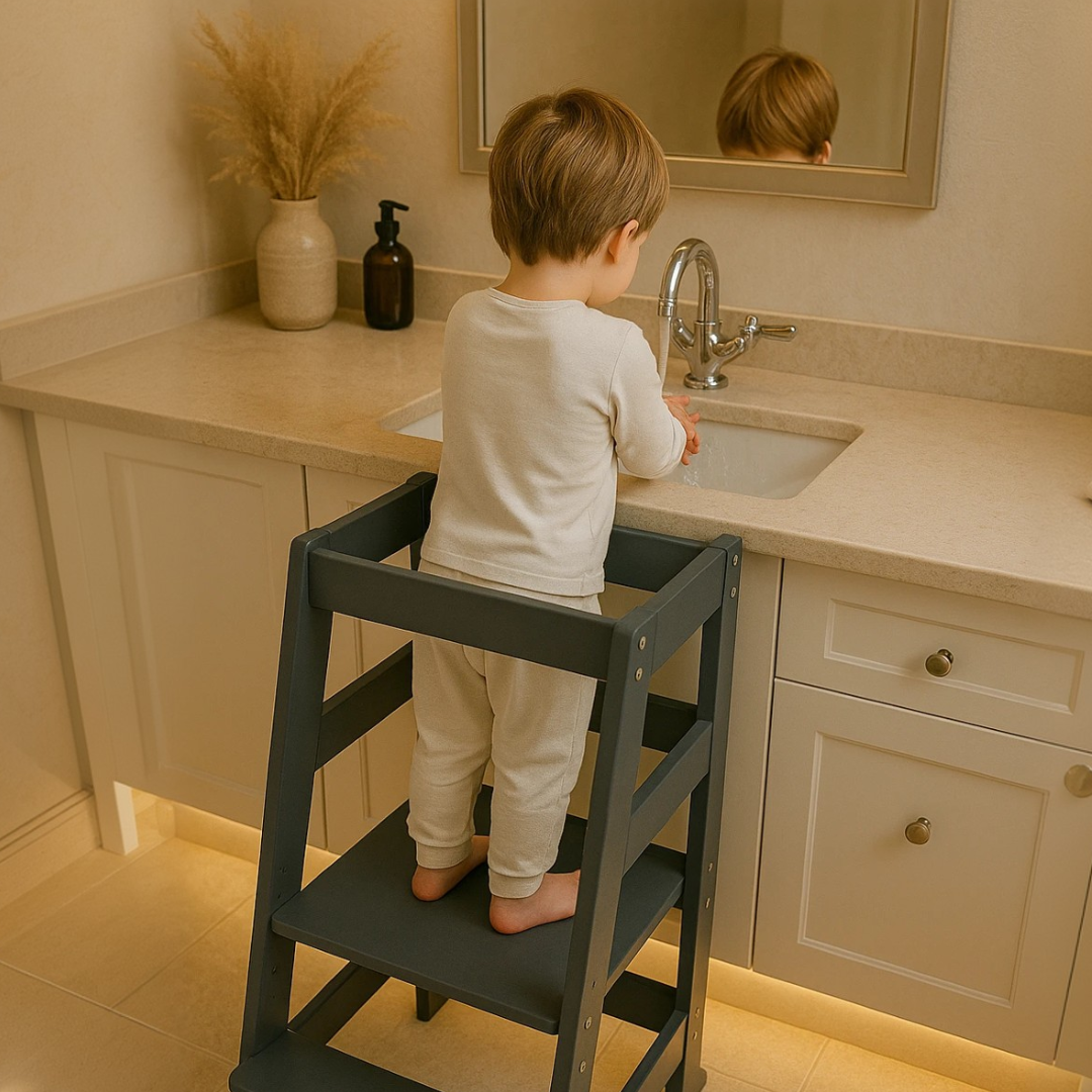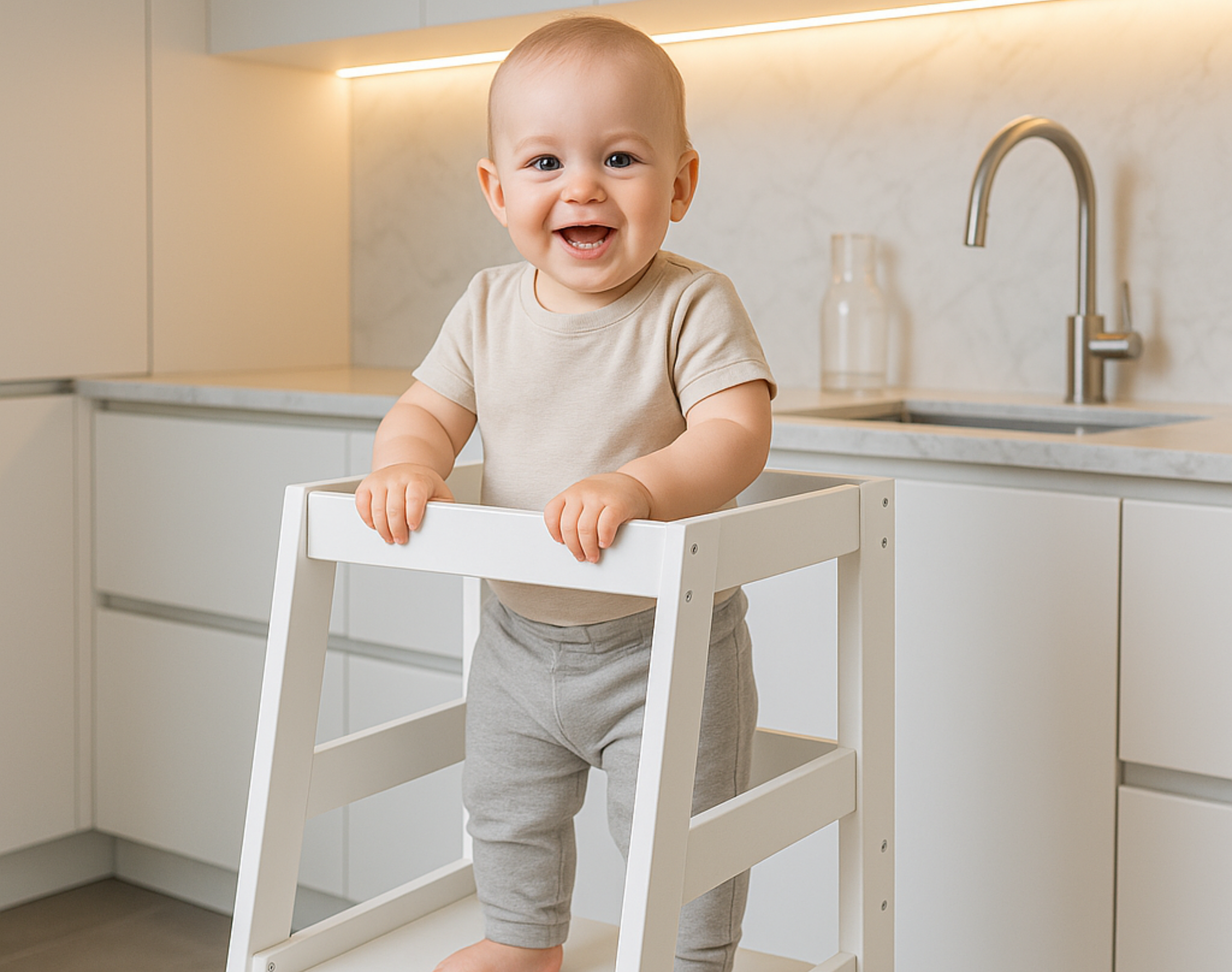 Kinder wachsen – und der NEO Lernturm wächst mit. Mit drei höhenverstellbaren Plattformen passt er sich perfekt an die Entwicklungsstufen Ihres Kindes an. Vom ersten sicheren Stehen bis zum Vorschulalter begleitet er Ihr Kind ergonomisch, sicher und verlässlich – ein treuer Alltagshelfer mit Weitblick. Der umlaufende Rausfallschutz gibt kleinen Entdeckern sicheren Halt bei jeder Aktivität. Ob beim Greifen, Strecken oder Mithelfen – Ihr Kind steht stabil und geschützt.