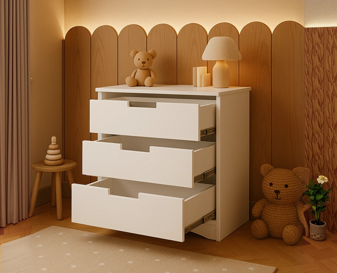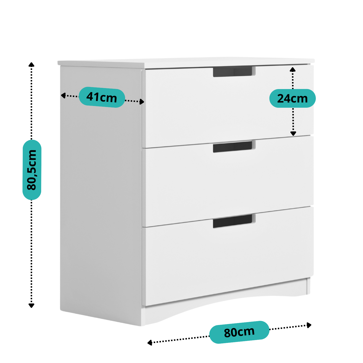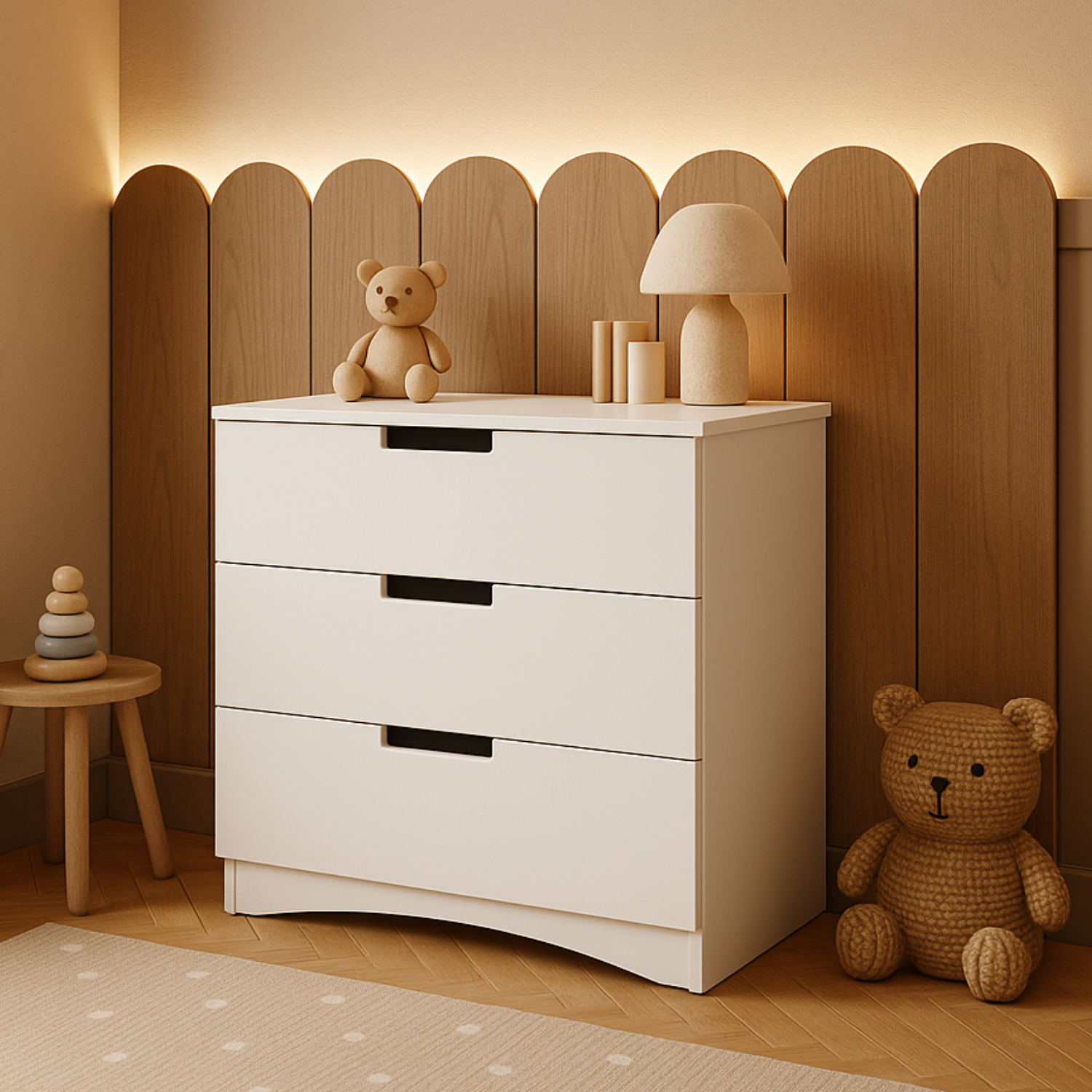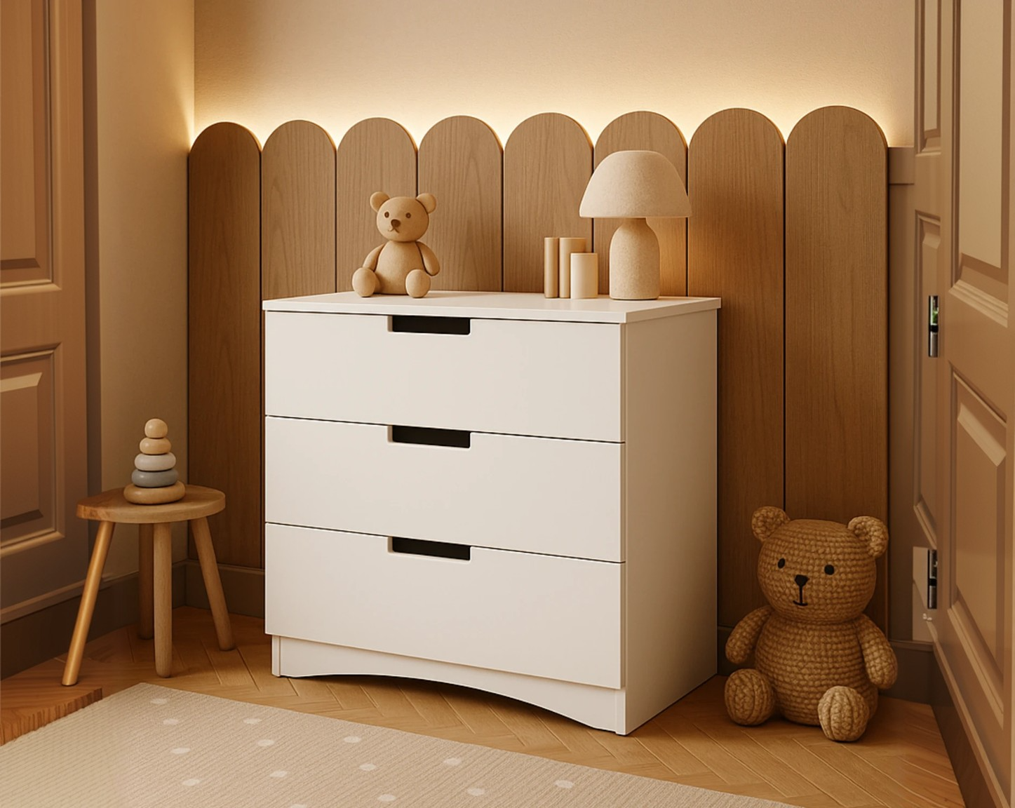 Die NOA Kommode ist weit mehr als nur ein Möbelstück – sie ist ein stilvolles Statement. Ihr minimalistisches, griffloses Design in edlem Weiß fügt sich harmonisch in jedes Interieur ein, besonders in skandinavisch inspirierte Räume. Dank ihrer klaren Linien und der dezenten Farbgebung wirkt sie modern und gleichzeitig zeitlos, sodass sie sowohl im Kinderzimmer als auch in Schlafzimmer, Flur oder Wohnzimmer zum Blickfang wird. Gefertigt aus robuster, laminierter Spanplatte und doppelt lackierten MDF-Fronten (18 mm stark), garantiert die NOA Kommode Stabilität und Langlebigkeit. Der zertifizierte Lack ist nicht nur sicher und geruchsfrei, sondern auch gesundheitlich unbedenklich – perfekt für die Kleinsten im Haus. Hergestellt in der EU, steht dieses Möbelstück für Qualität auf höchstem Niveau. Mit drei geräumigen Schubladen auf kugelgelagerten Schienen (33 cm tief) bietet die NOA Kommode beeindruckend viel Stauraum. Ob Kleidung, Spielzeug, Bücher oder Alltagsgegenstände – hier findet alles seinen Platz. Die ergonomischen Aussparungen sorgen für ein müheloses Öffnen und Schließen, während die speziellen Winkel zur Wandmontage zusätzliche Stabilität und Sicherheit bieten. Diese Kommode ist ein wahres Multitalent. Sie passt nicht nur ins Kinderzimmer, sondern macht auch im Schlafzimmer, Wohnzimmer, Flur oder sogar im Arbeitszimmer und Keller eine exzellente Figur. Die glatte Oberflächenstruktur bietet zusätzlichen Platz für Dekorationen, Lampen oder praktische Alltagshelfer. Die NOA Kommode vereint Ästhetik, Funktionalität und Qualität auf meisterhafte Weise. Sie ist die perfekte Wahl für alle, die ein stilvolles und praktisches Möbelstück suchen, das den Alltag erleichtert und gleichzeitig das Zuhause verschönert. Ob für Kleidung, Spielzeug oder Alltagsgegenstände – die NOA Kommode wird schnell zu einem unverzichtbaren Bestandteil Ihrer Einrichtung.