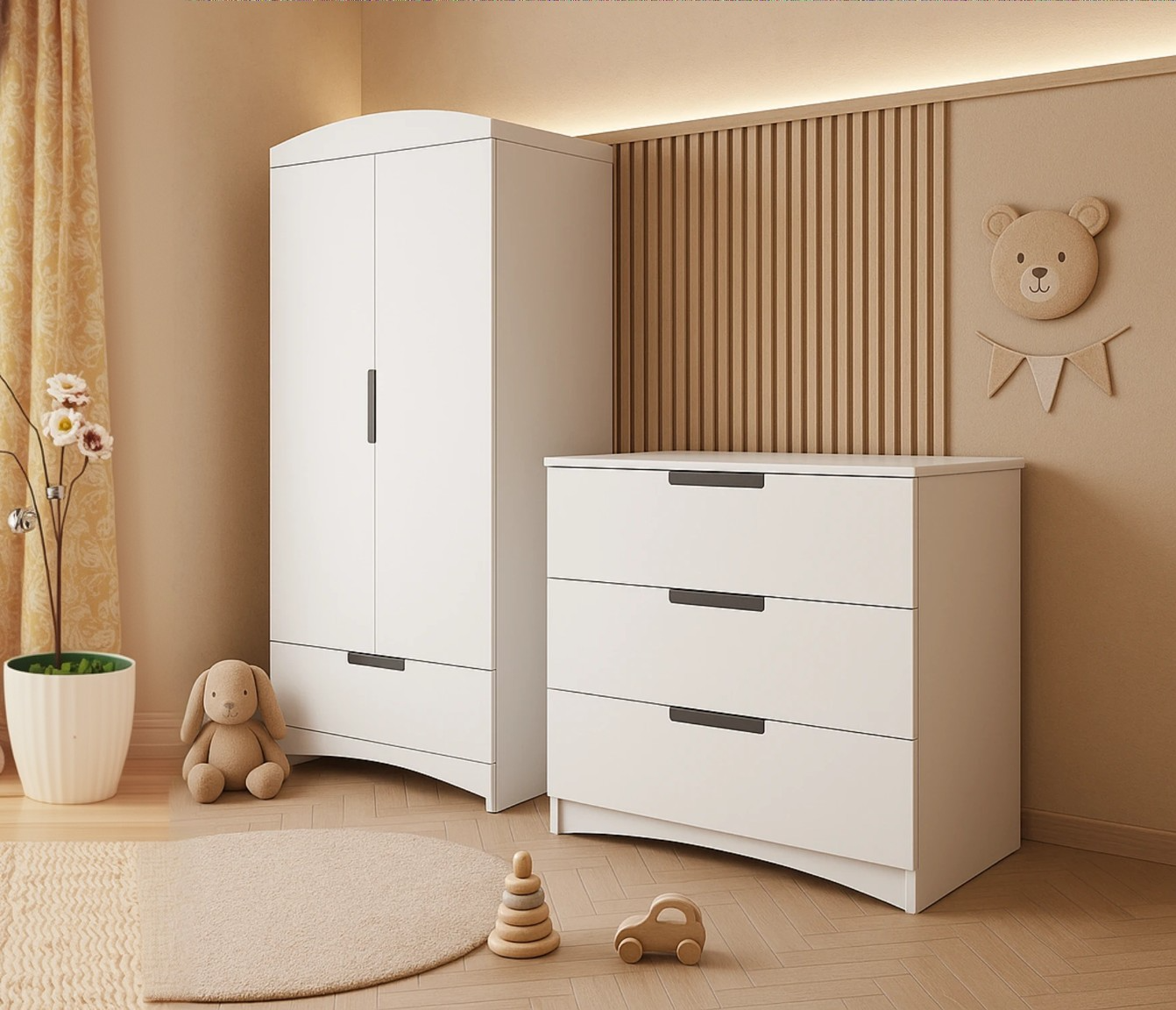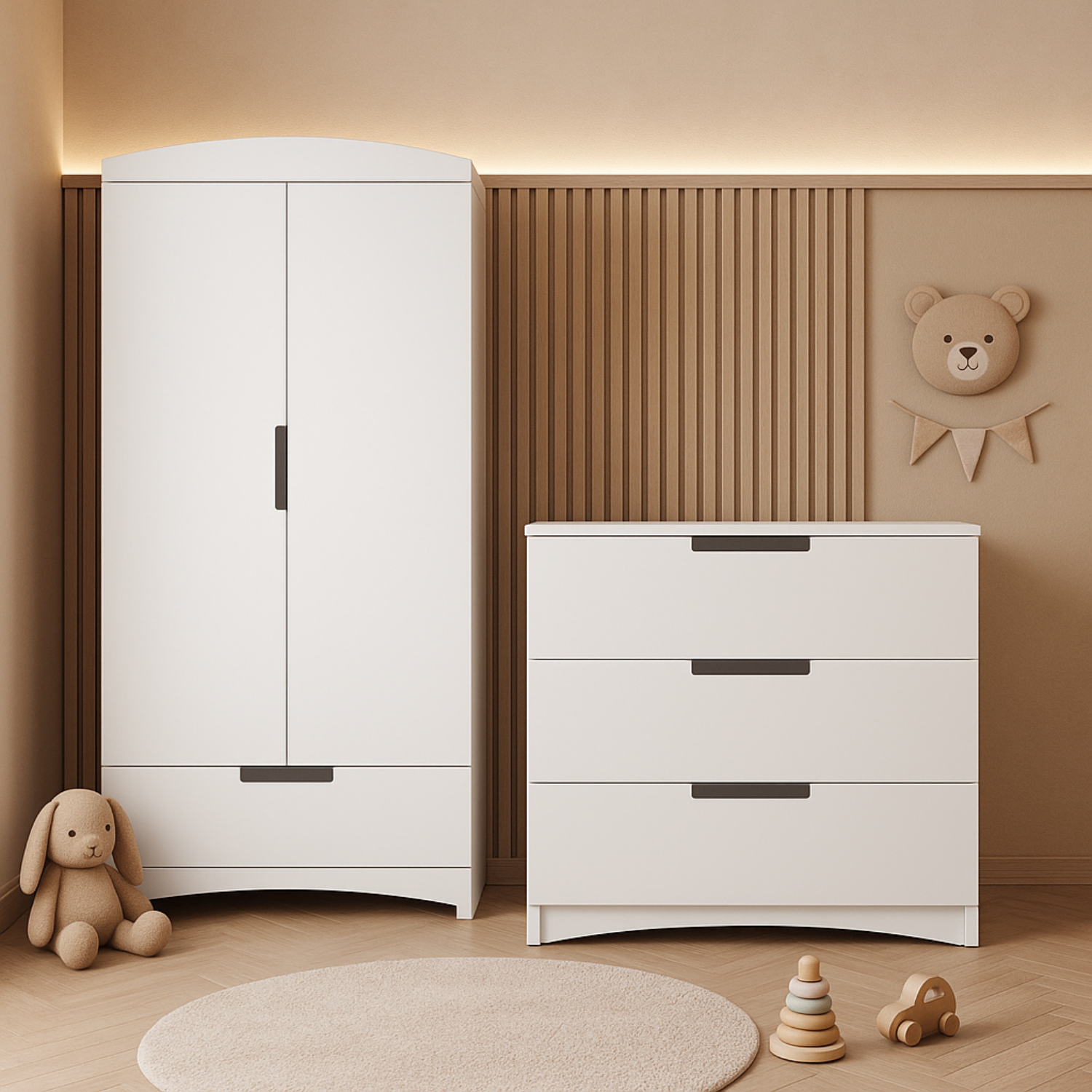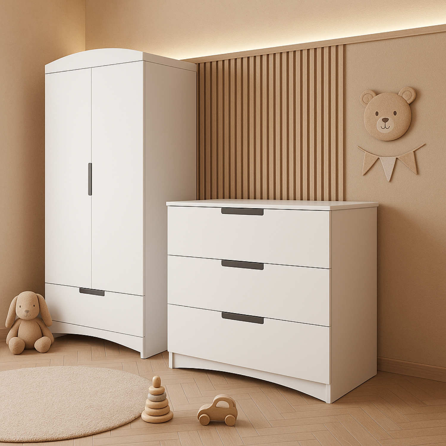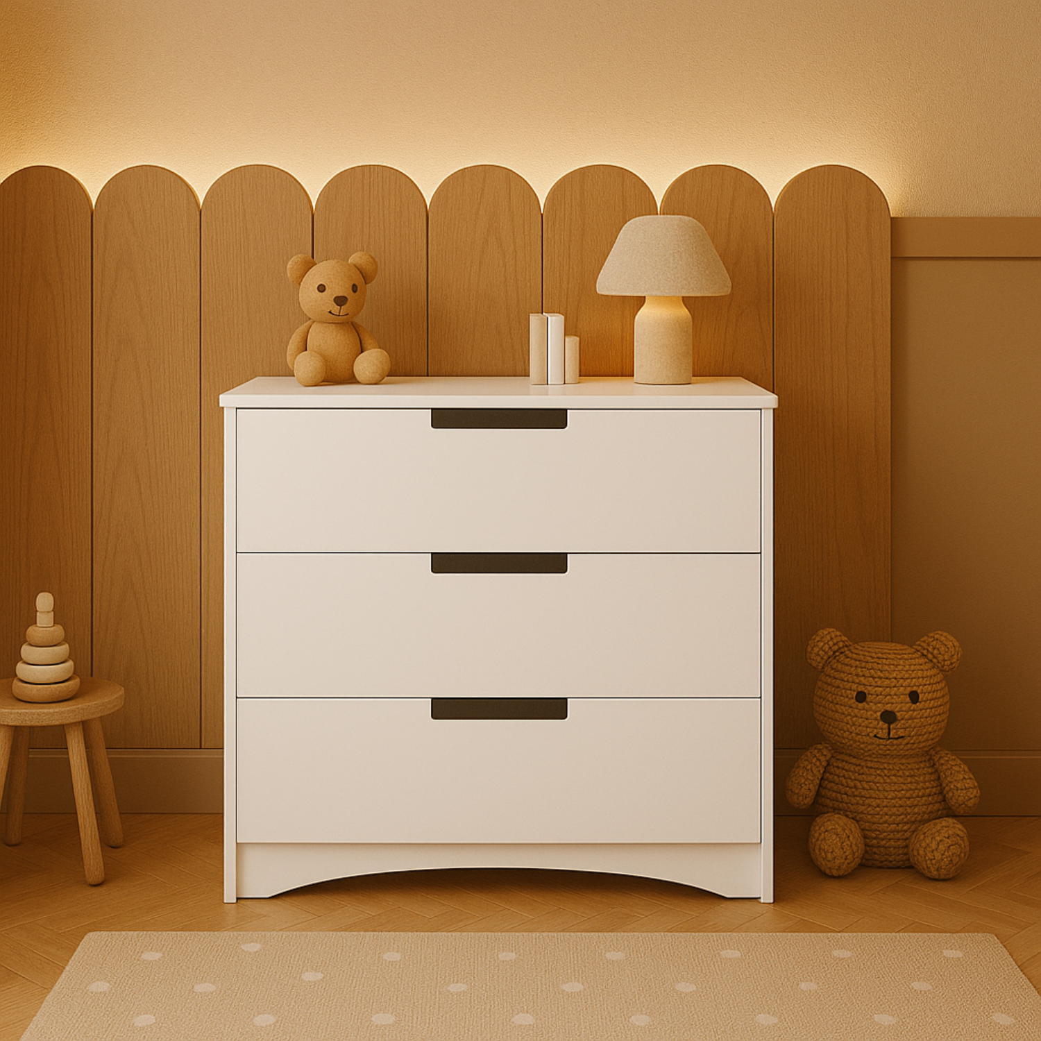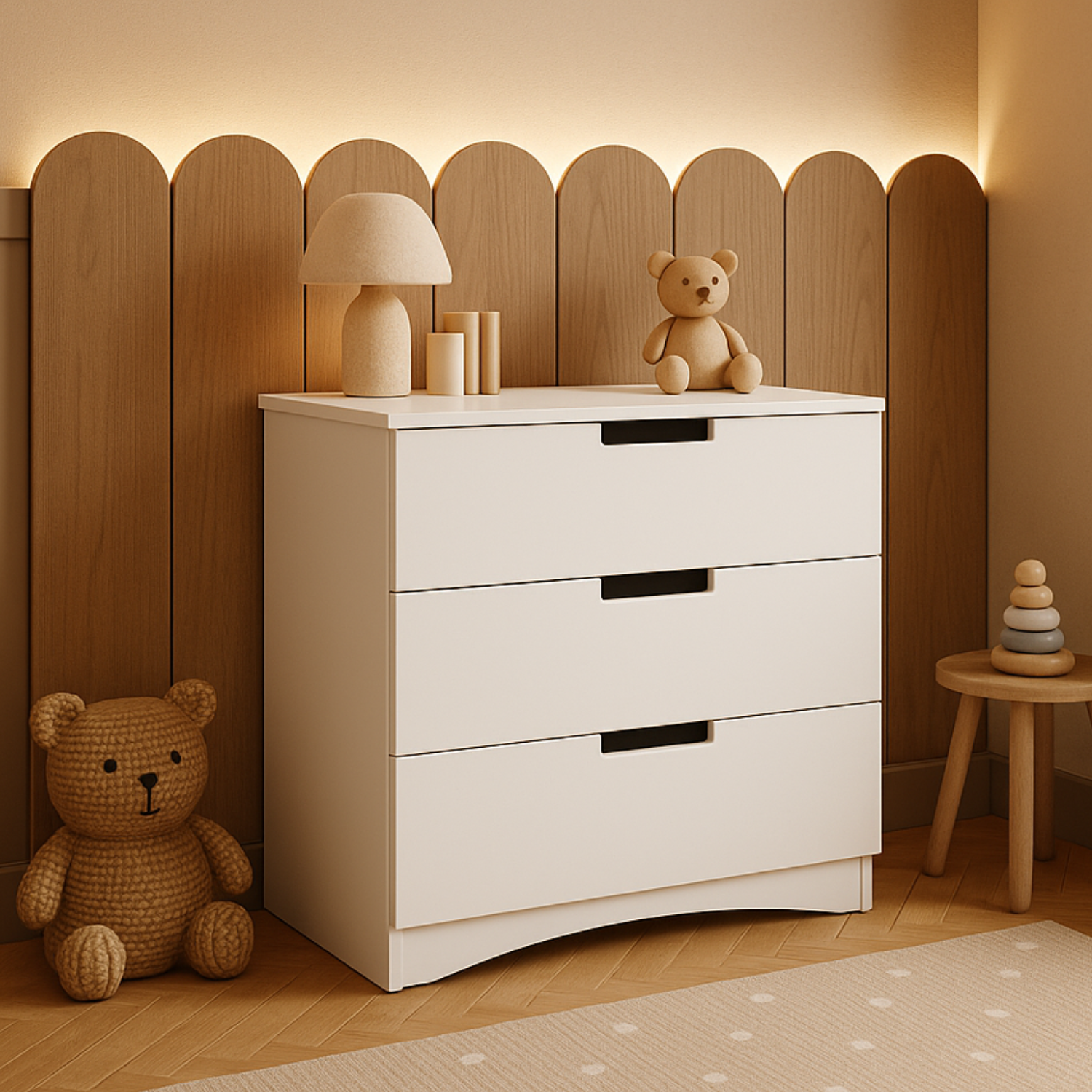Die NOA Kommode ist weit mehr als nur ein Möbelstück – sie ist ein stilvolles Statement. Ihr minimalistisches, griffloses Design in edlem Weiß fügt sich harmonisch in jedes Interieur ein, besonders in skandinavisch inspirierte Räume. Dank ihrer klaren Linien und der dezenten Farbgebung wirkt sie modern und gleichzeitig zeitlos, sodass sie sowohl im Kinderzimmer als auch in Schlafzimmer, Flur oder Wohnzimmer zum Blickfang wird. Gefertigt aus robuster, laminierter Spanplatte und doppelt lackierten MDF-Fronten (18 mm stark), garantiert die NOA Kommode Stabilität und Langlebigkeit. Der zertifizierte Lack ist nicht nur sicher und geruchsfrei, sondern auch gesundheitlich unbedenklich – perfekt für die Kleinsten im Haus. Hergestellt in der EU, steht dieses Möbelstück für Qualität auf höchstem Niveau. Mit drei geräumigen Schubladen auf kugelgelagerten Schienen (33 cm tief) bietet die NOA Kommode beeindruckend viel Stauraum. Ob Kleidung, Spielzeug, Bücher oder Alltagsgegenstände – hier findet alles seinen Platz. Die ergonomischen Aussparungen sorgen für ein müheloses Öffnen und Schließen, während die speziellen Winkel zur Wandmontage zusätzliche Stabilität und Sicherheit bieten. Diese Kommode ist ein wahres Multitalent. Sie passt nicht nur ins Kinderzimmer, sondern macht auch im Schlafzimmer, Wohnzimmer, Flur oder sogar im Arbeitszimmer und Keller eine exzellente Figur. Die glatte Oberflächenstruktur bietet zusätzlichen Platz für Dekorationen, Lampen oder praktische Alltagshelfer. Die NOA Kommode vereint Ästhetik, Funktionalität und Qualität auf meisterhafte Weise. Sie ist die perfekte Wahl für alle, die ein stilvolles und praktisches Möbelstück suchen, das den Alltag erleichtert und gleichzeitig das Zuhause verschönert. Ob für Kleidung, Spielzeug oder Alltagsgegenstände – die NOA Kommode wird schnell zu einem unverzichtbaren Bestandteil Ihrer Einrichtung.