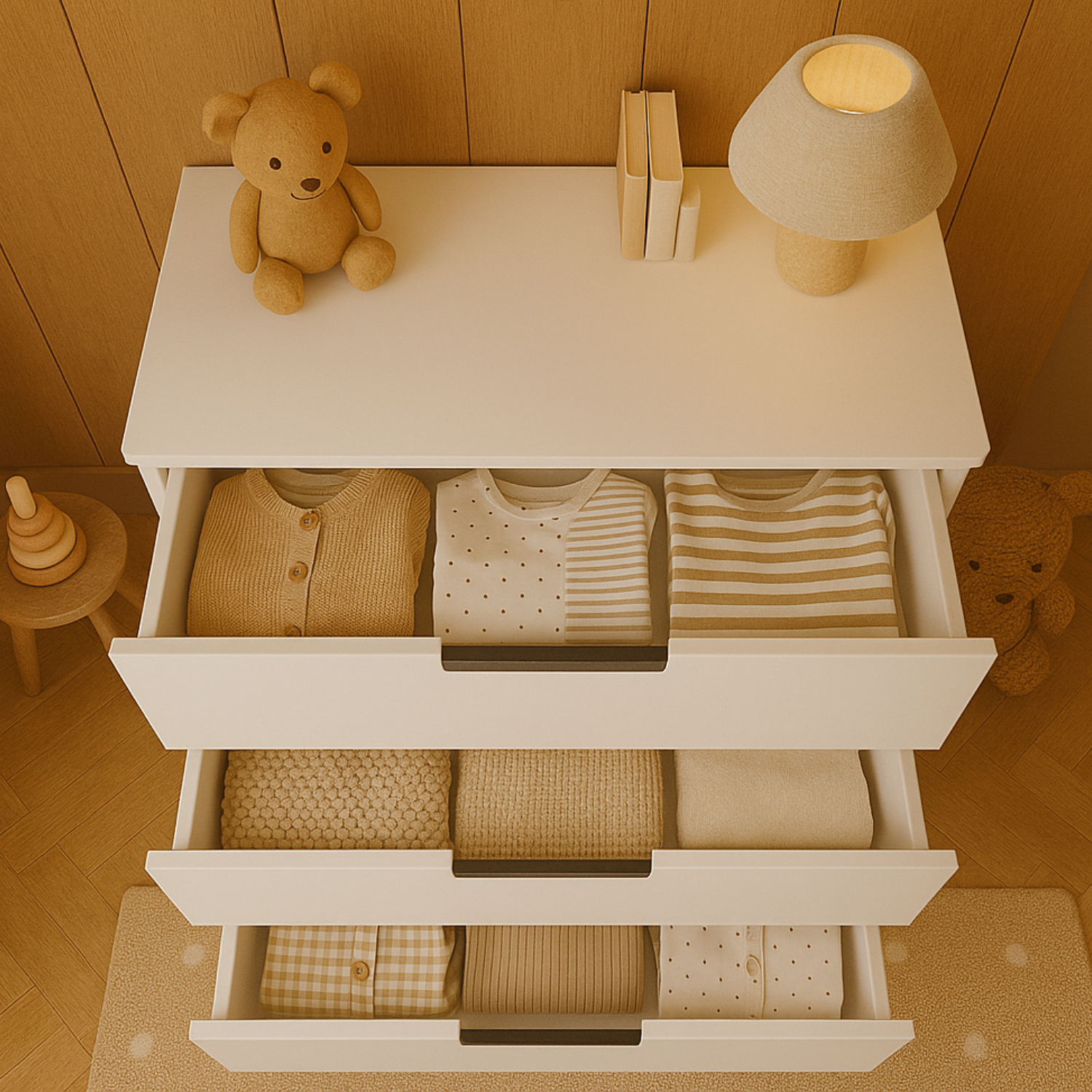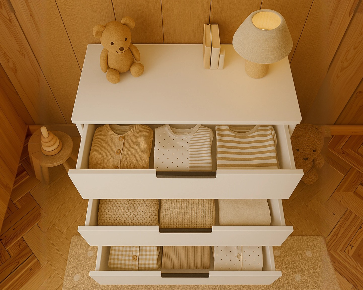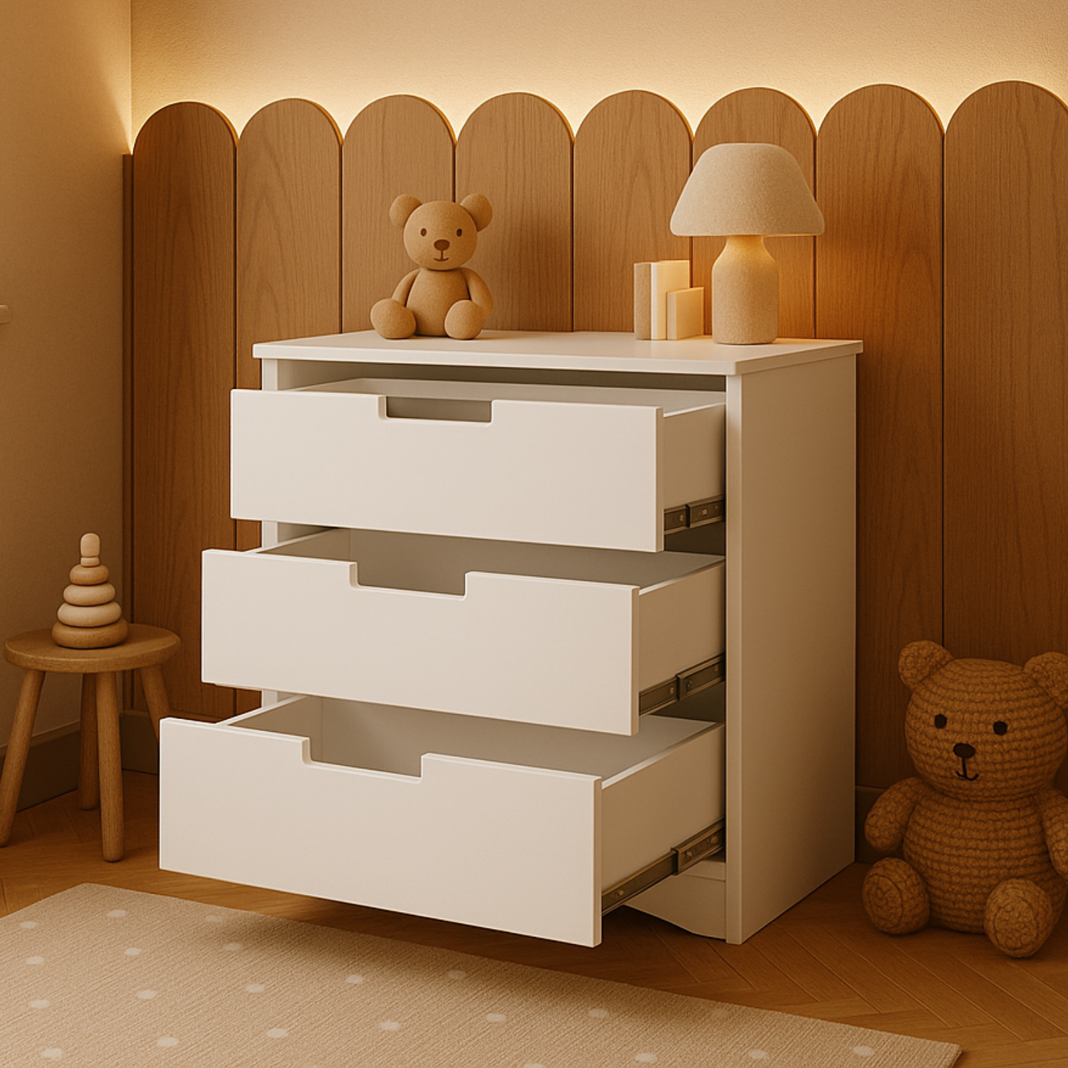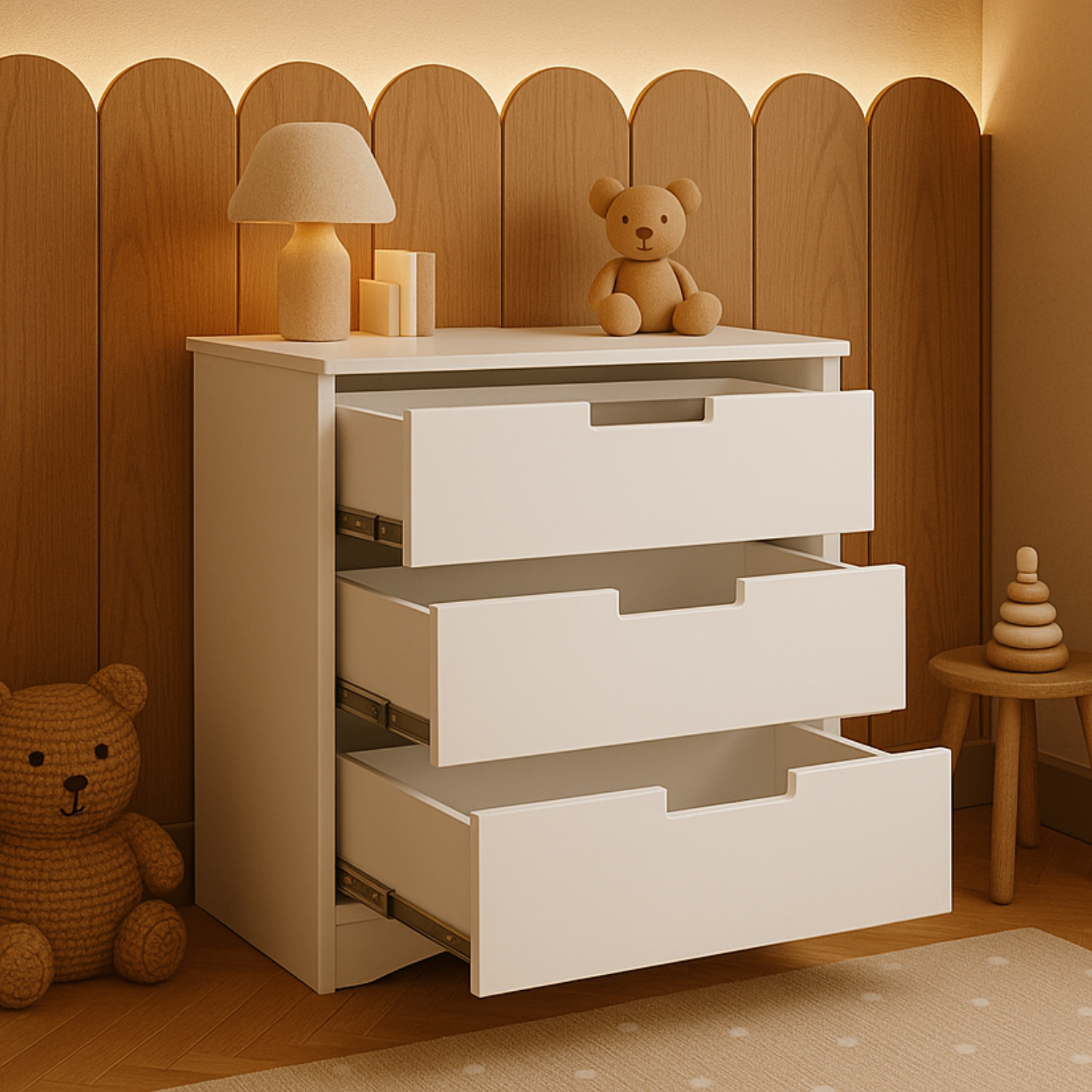 Mit drei geräumigen Schubladen auf kugelgelagerten Schienen (33 cm tief) bietet die NOA Kommode beeindruckend viel Stauraum. Ob Kleidung, Spielzeug, Bücher oder Alltagsgegenstände – hier findet alles seinen Platz. Die ergonomischen Aussparungen sorgen für ein müheloses Öffnen und Schließen, während die speziellen Winkel zur Wandmontage zusätzliche Stabilität und Sicherheit bieten.